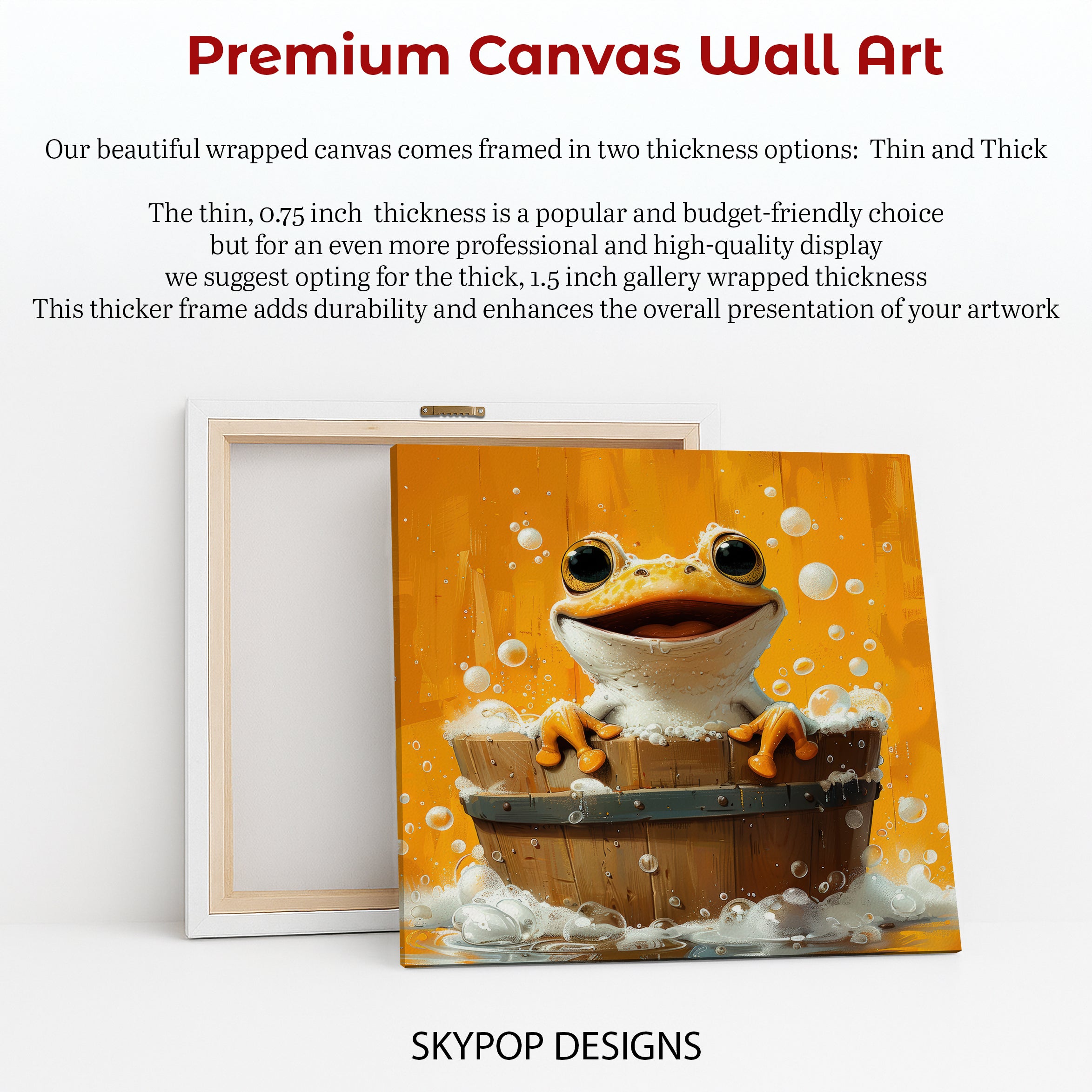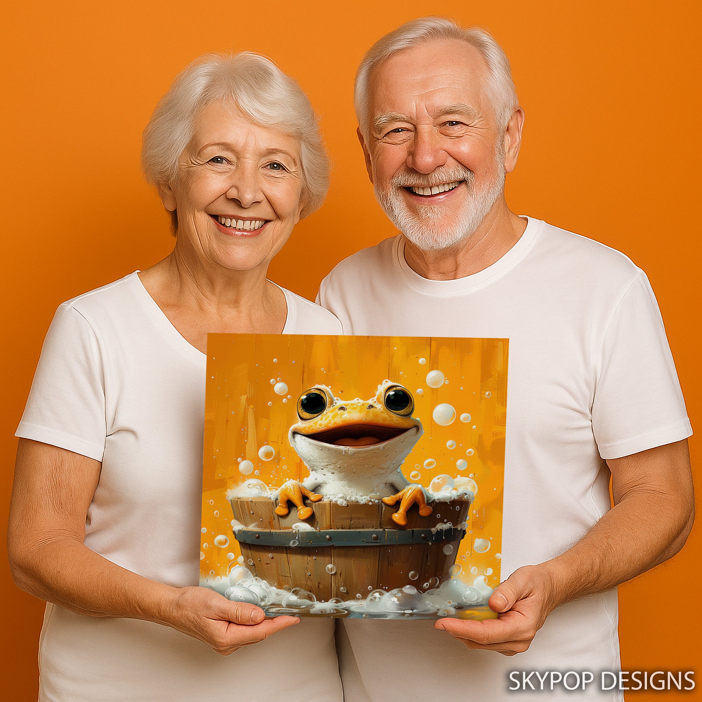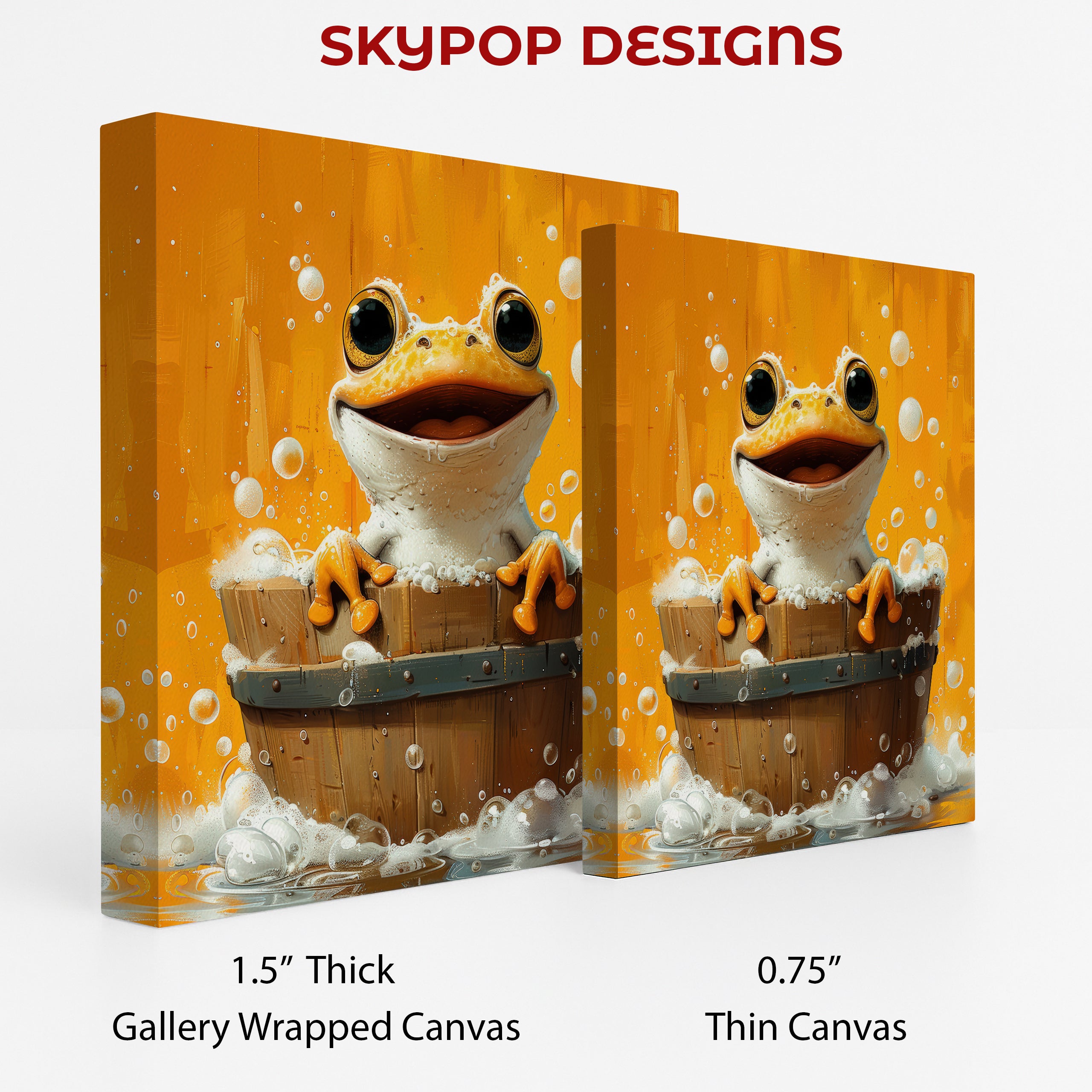 Keywords: frog art, animal art, whimsical art, contemporary art, modern decor, bohemian decor, children's room decor, bathroom art, living room art, kitchen art, kids wall art, yellow decor, orange decor, white decor, brown decor, frog artwork, bath time art, canvas wall art, poster art, vibrant art, playful decor, joyful art, home decor, wall decor, housewarming gift, birthday gift, holiday gift, unique wall art, high quality art, cheerful art