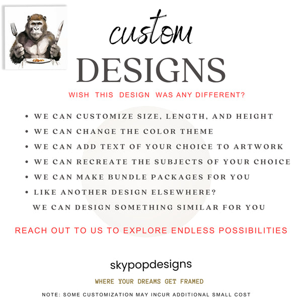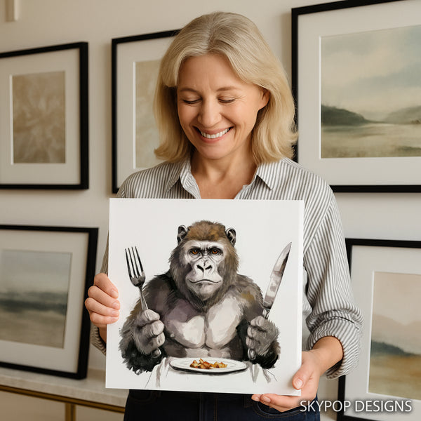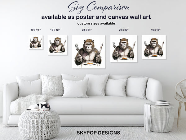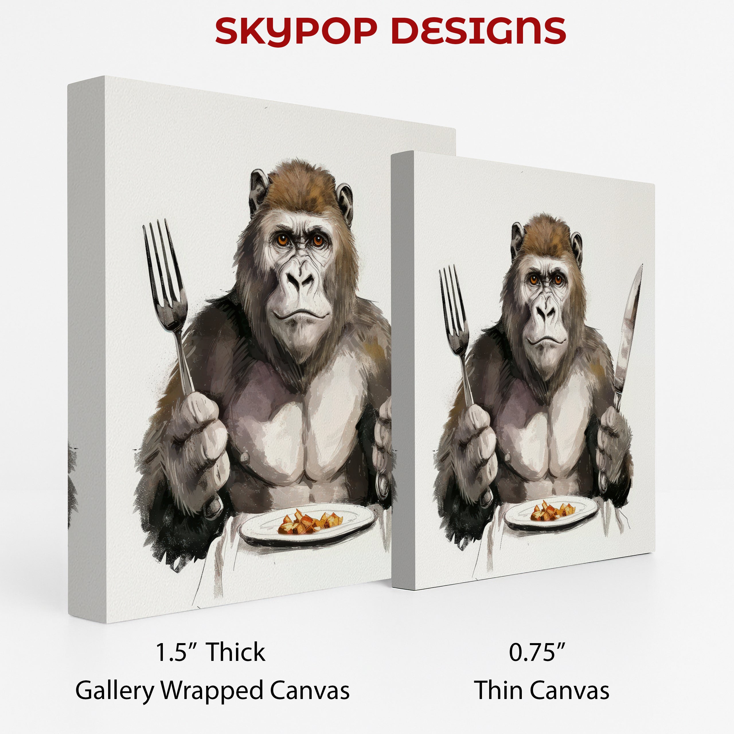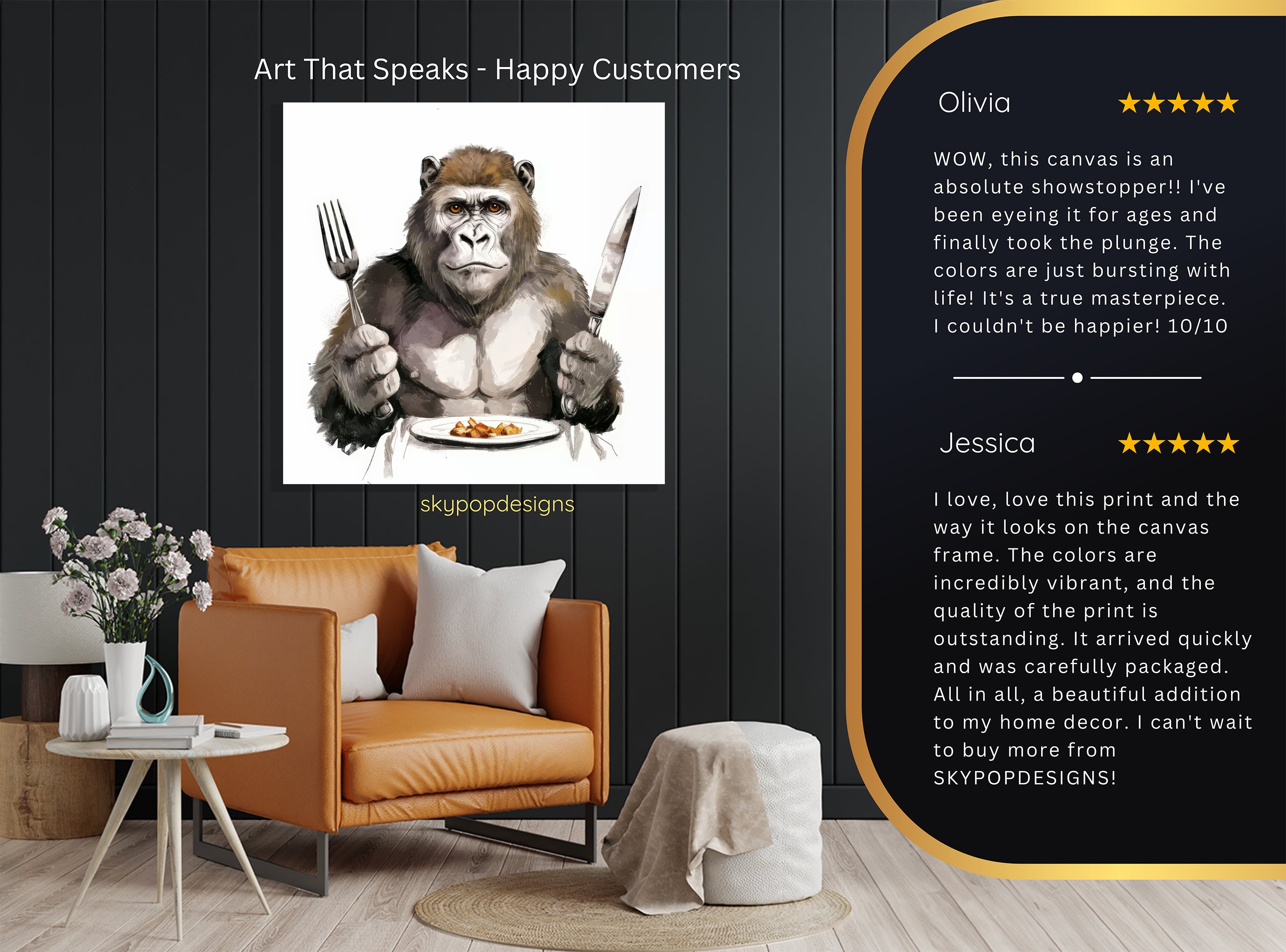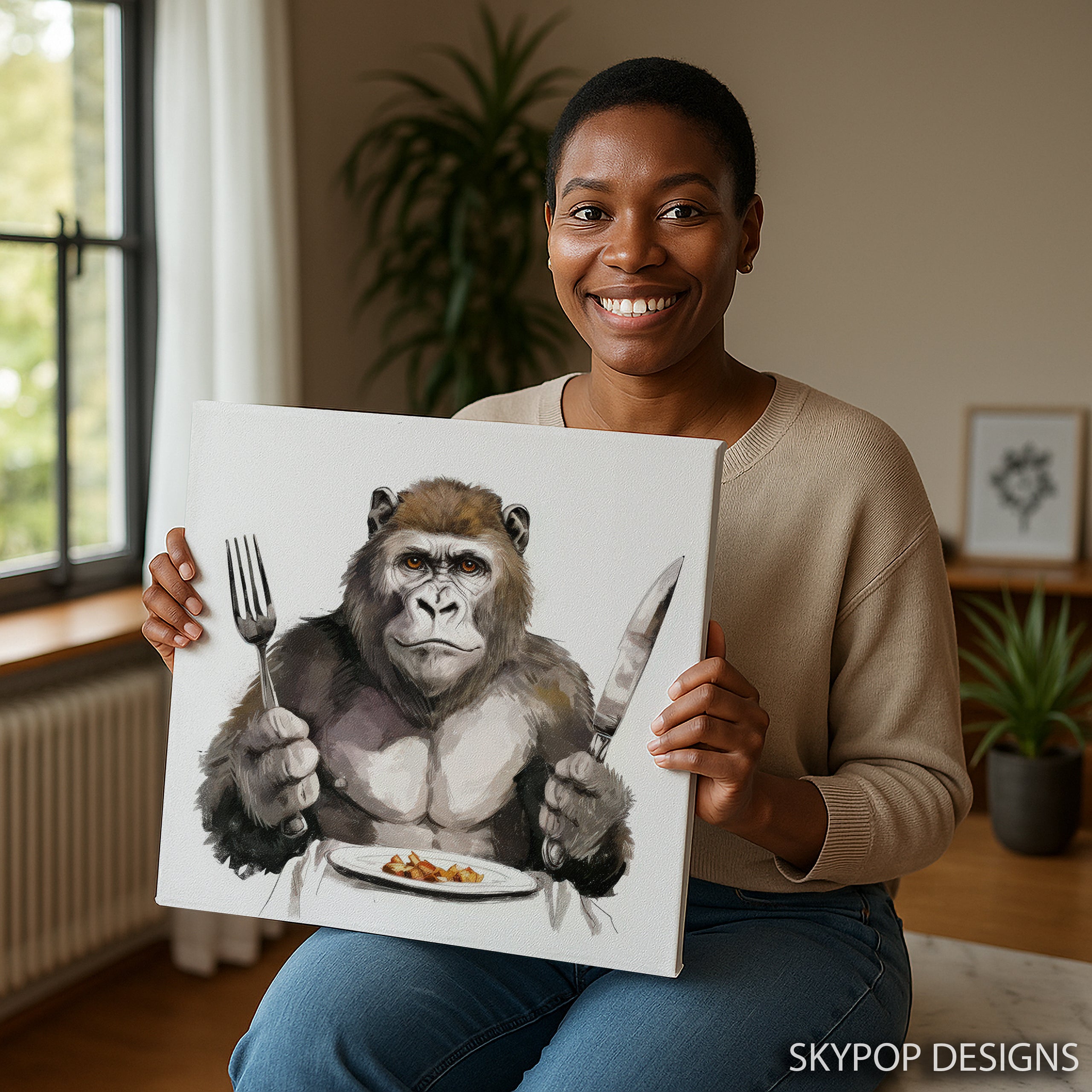 Keywords: Gorilla art, canvas wall art, animal art, contemporary art, figurative art, modern decor, minimalist decor, living room art, dining room art, office art, kitchen art, multicolor art, brown art, white art, black art, fine dining art, unique wall art, statement art, home decor, wall decor, animal lovers gift, art for home, wall adornment, contemporary wall decor, modern wall art, animal print, gorilla canvas, sophisticated humor, nature inspired art, conversation starter art