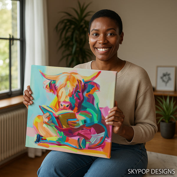 Brighten your home with this captivating Highland Cow canvas wall art, featuring a Highland Cow engrossed in a book. The vibrant, abstract style uses a striking multicolor palette with prominent pink and yellow tones, creating a unique and eye-catching piece of wall art. This poster is perfect for transforming your living room, bedroom, or office into a lively and inviting space. The bold brushstrokes give this animal art a contemporary feel, making it an ideal addition for bohemian or modern decor styles. This canvas wall art adds a touch of whimsy and personality to any room, celebrating the unconventional. The blend of vibrant colors and the relaxed pose of the Highland Cow inspires a sense of calm and curiosity. This high-quality print is ideal for anyone looking to elevate their home decor with unique wall art, making it a fantastic gift for birthdays or housewarmings. Showcase your love for animals and art with this distinctive Highland Cow poster that brings joy and character to your walls. Elevate your space with this unique piece of canvas wall art that blends abstract expressionism with charming animal imagery. Transform your interior design with this stunning Highland Cow artwork, perfect for creating a focal point. Get this vibrant poster to add a splash of color and character to your favorite room today.