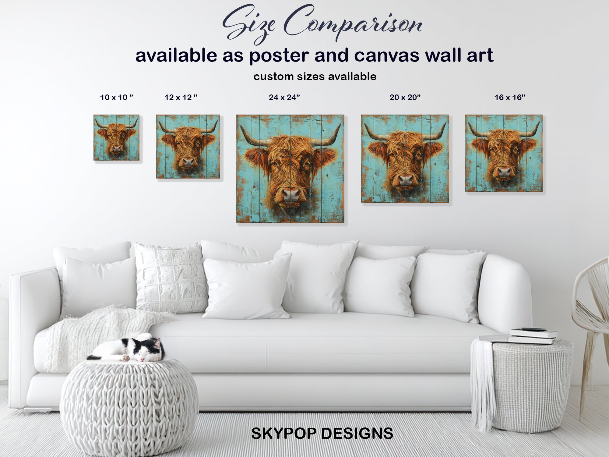 Transform your home with this stunning Highland Cow canvas wall art, capturing the rustic charm and rugged beauty of this beloved animal. This captivating poster showcases a majestic Highland Cow with rich texture and earthy tones, set against a distressed teal background, creating a truly unique piece of wall decor. The vibrant browns and golds of the cow's shaggy coat stand out beautifully, adding warmth and character to any space. Whether you're embracing a farmhouse aesthetic, a modern rustic vibe, or a contemporary farmhouse look, this versatile canvas art is the perfect addition. It’s ideal for living rooms, bedrooms, kitchens, or entryways, bringing a touch of nature indoors. This striking piece of animal art is a fantastic gift for anyone who loves cows, farm life, or unique home decor. The textured appearance gives depth to this print, making it a standout canvas wall art. Elevate your space with this eye-catching Highland Cow artwork today, perfect for adding a touch of personality and style. This poster is a conversation starter and a beautiful way to celebrate the natural world, offering a timeless appeal that complements various decor styles. Discover the perfect blend of art and nature that this canvas wall art provides.