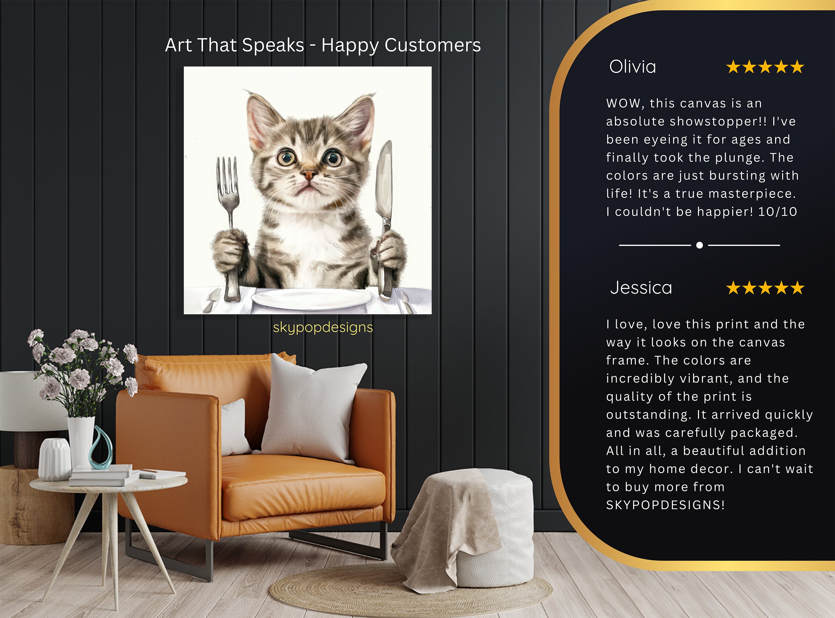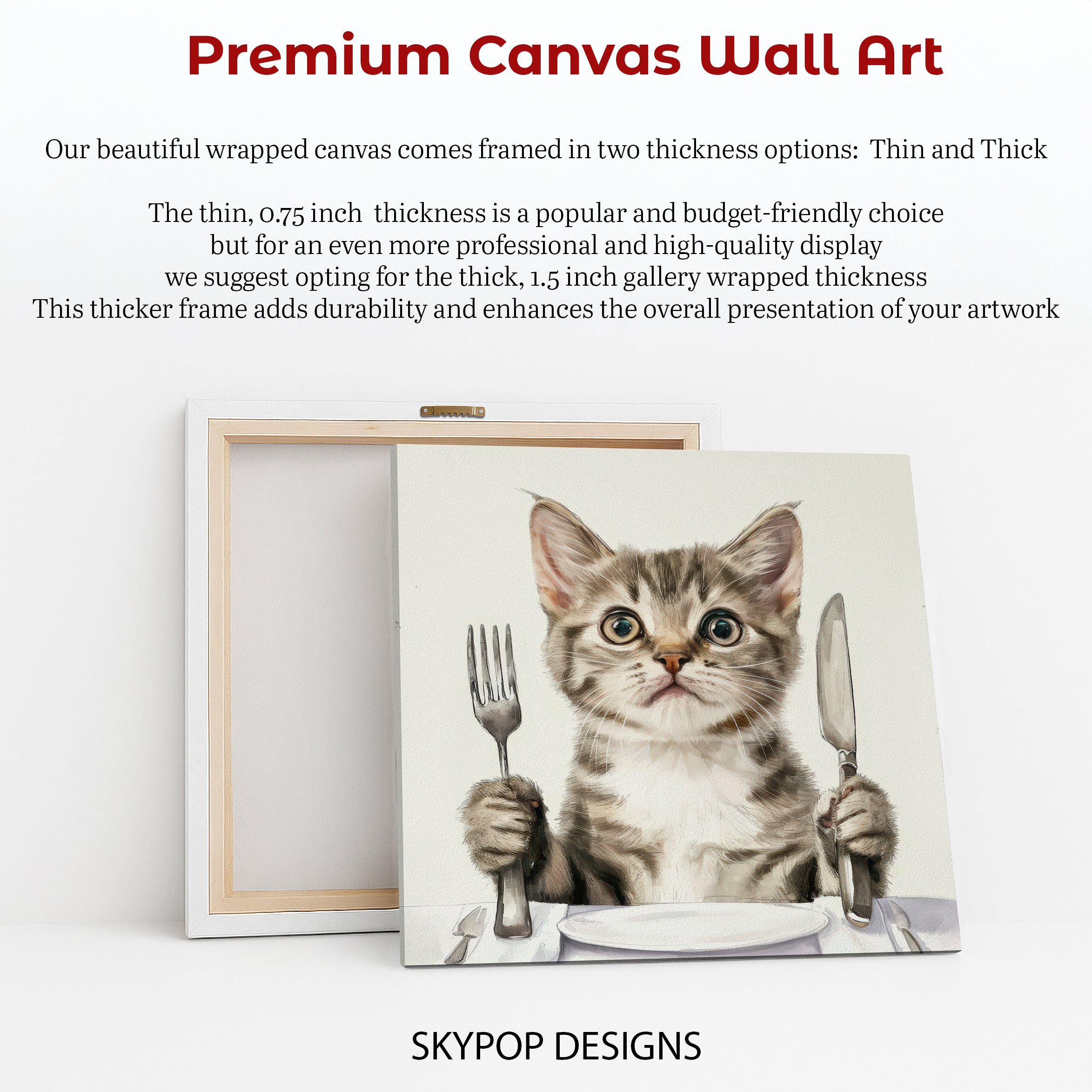 Elevate your space with this charming kitten canvas wall art, perfect for art lovers and cat enthusiasts alike. This captivating poster features a whimsical kitten holding a fork and knife, ready for a meal, capturing a moment of pure delightful anticipation. The piece transforms any room with its unique blend of animal art and contemporary design, making it a standout addition to your home decor. Its neutral color palette of browns, white, and hints of grey, allows this canvas wall art to seamlessly blend with modern, bohemian, and minimalist interiors. The expressive eyes and detailed fur of the kitten create a striking visual that sparks joy and conversation. This versatile artwork is ideal for your kitchen, living room, or even a cozy bedroom, adding a touch of playful charm. Consider this high-quality canvas print as a thoughtful gift for housewarmings, birthdays, or any occasion celebrating pet lovers. The detailed rendering and subtle shading ensure this poster will be a treasured piece of wall art for years to come. This kitten artwork is not just decor; it’s a delightful statement that brings warmth and personality to your home. Capture the essence of playful innocence with this stunning piece of cat wall art. Transform your walls and bring a smile to your face with this adorable kitten print. Get this unique piece of wall art today to brighten your space.