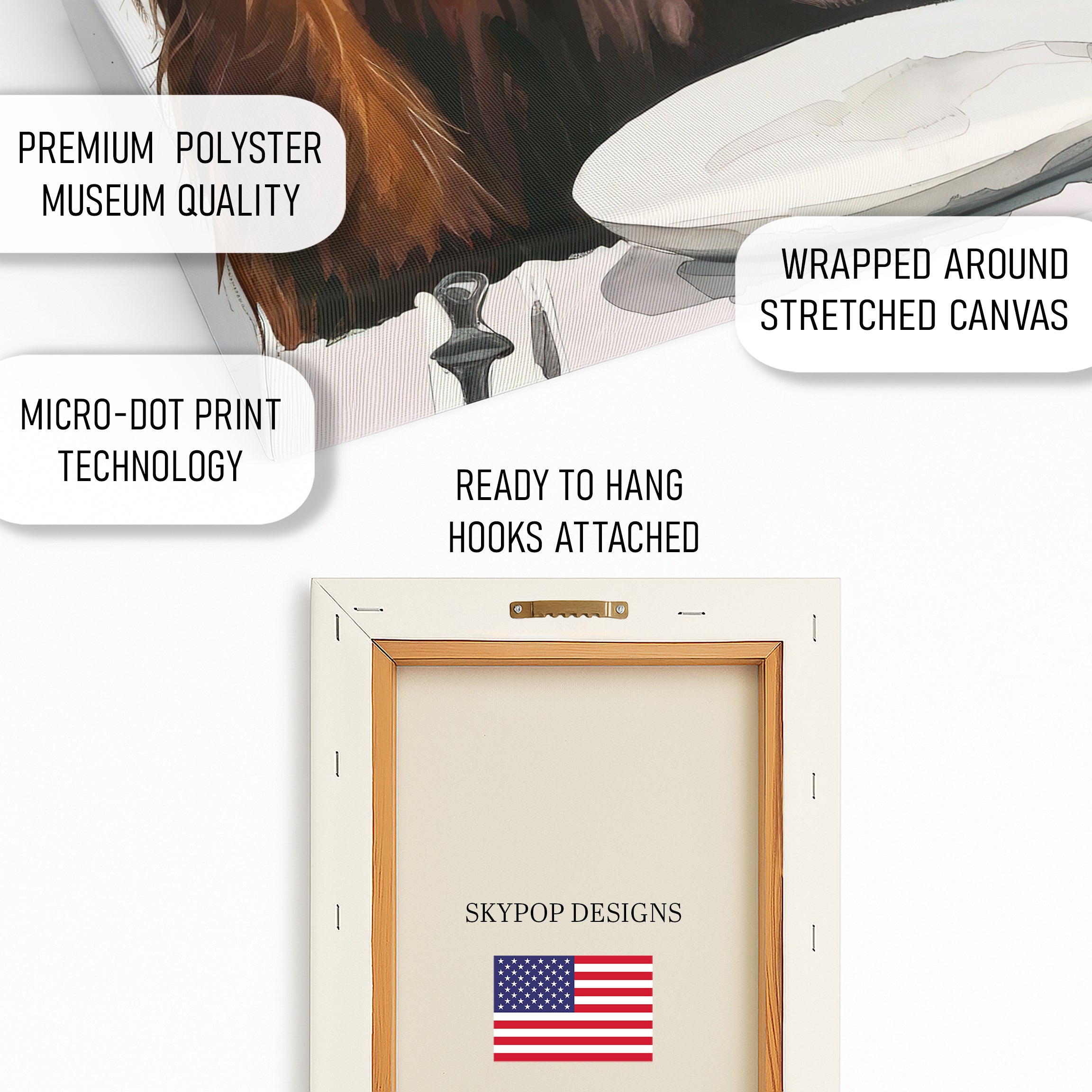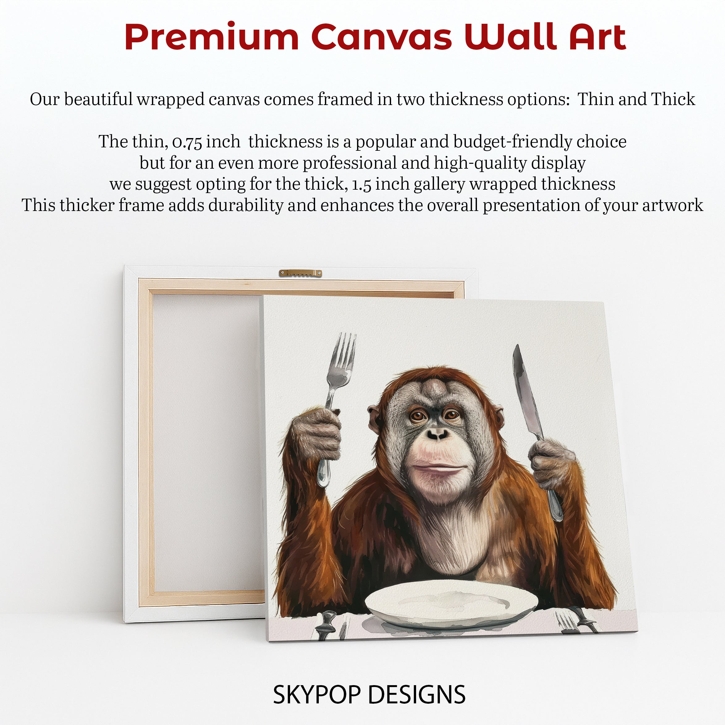 Transform your space with this captivating Orangutan Dinner Time canvas wall art. This stunning piece showcases a striking orangutan prepared for a meal, holding a fork and knife with an empty plate. The rich brown and beige tones create a warm and inviting atmosphere, making this poster an ideal conversational starter for your living room or dining room. Elevate your modern decor with this unique animal art, perfect for adding a touch of contemporary flair to your office or kitchen. This high-quality canvas wall art captures intricate details, from the textures of the orangutan's fur to the gleam of the silverware, creating a visually engaging experience. It's not just wall art; it's a statement piece that inspires curiosity and appreciation for the natural world. This versatile poster works wonderfully in minimalist settings, adding personality without overwhelming the space, and also complements glam decor with its sophisticated subject matter. Consider this impactful canvas print as a thoughtful gift for animal lovers or anyone appreciating unique home decor. Enhance your walls with this eye-catching artwork that brings a touch of the wild indoors, making every mealtime a little more eventful. This striking Orangutan canvas art is sure to be a cherished addition to your collection, offering both aesthetic appeal and a touch of whimsy. Elevate your home's interior design with this unforgettable work of art today.
