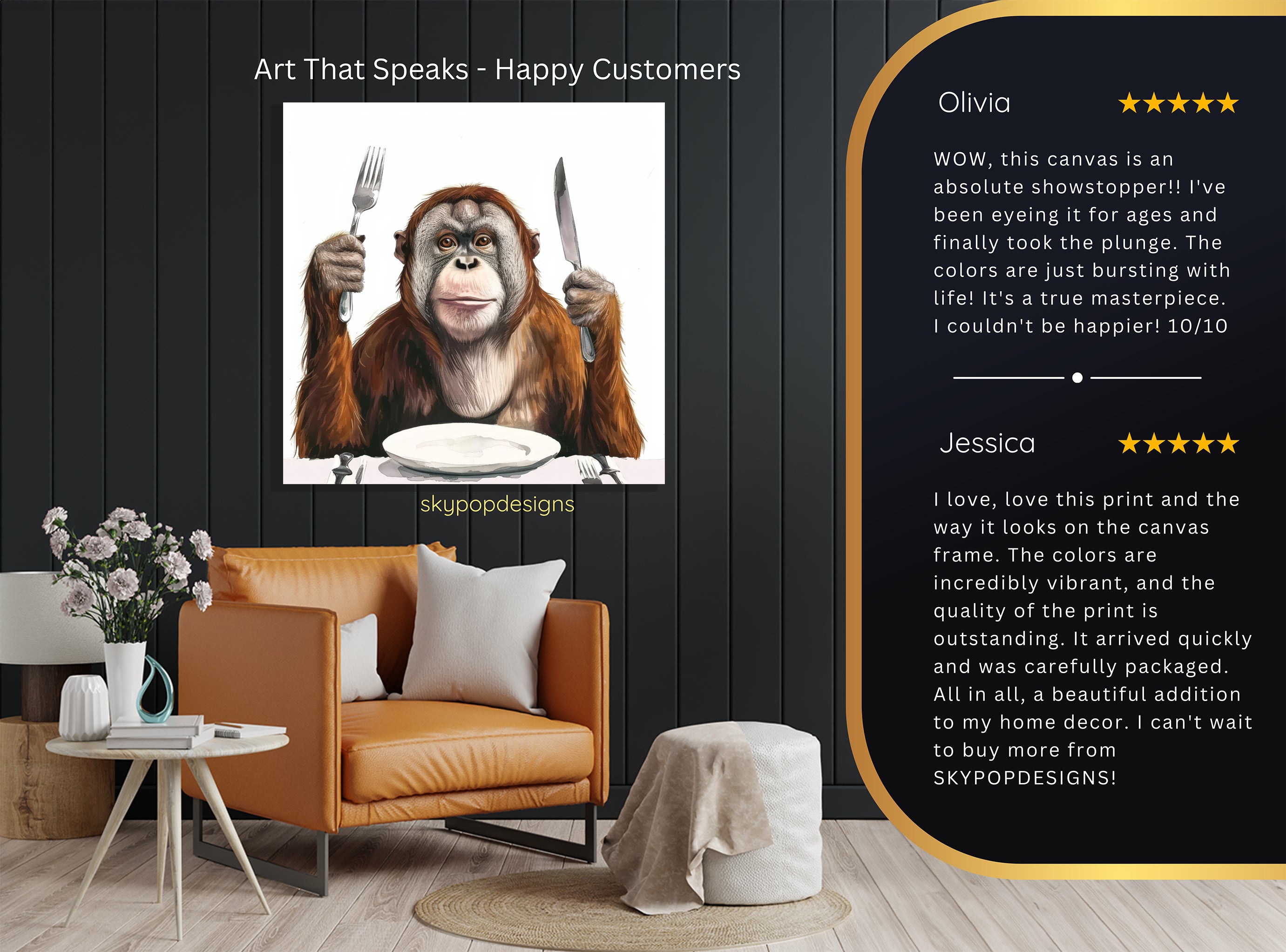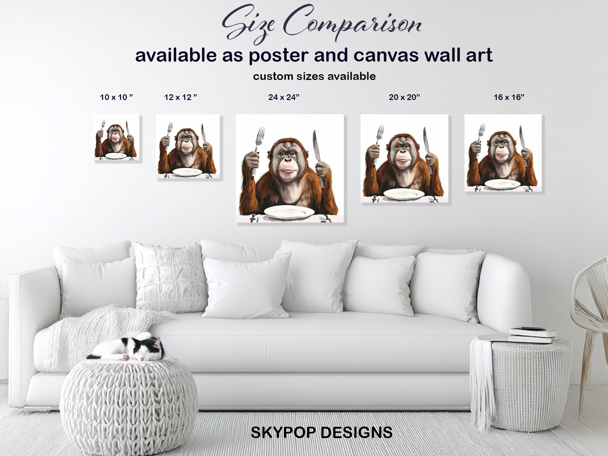 Orangutan Dinner Time Art, Canvas or Poster, Contemporary Minimalist Decor, Living Room Dining Room Office Kitchen Art, Brown Beige White