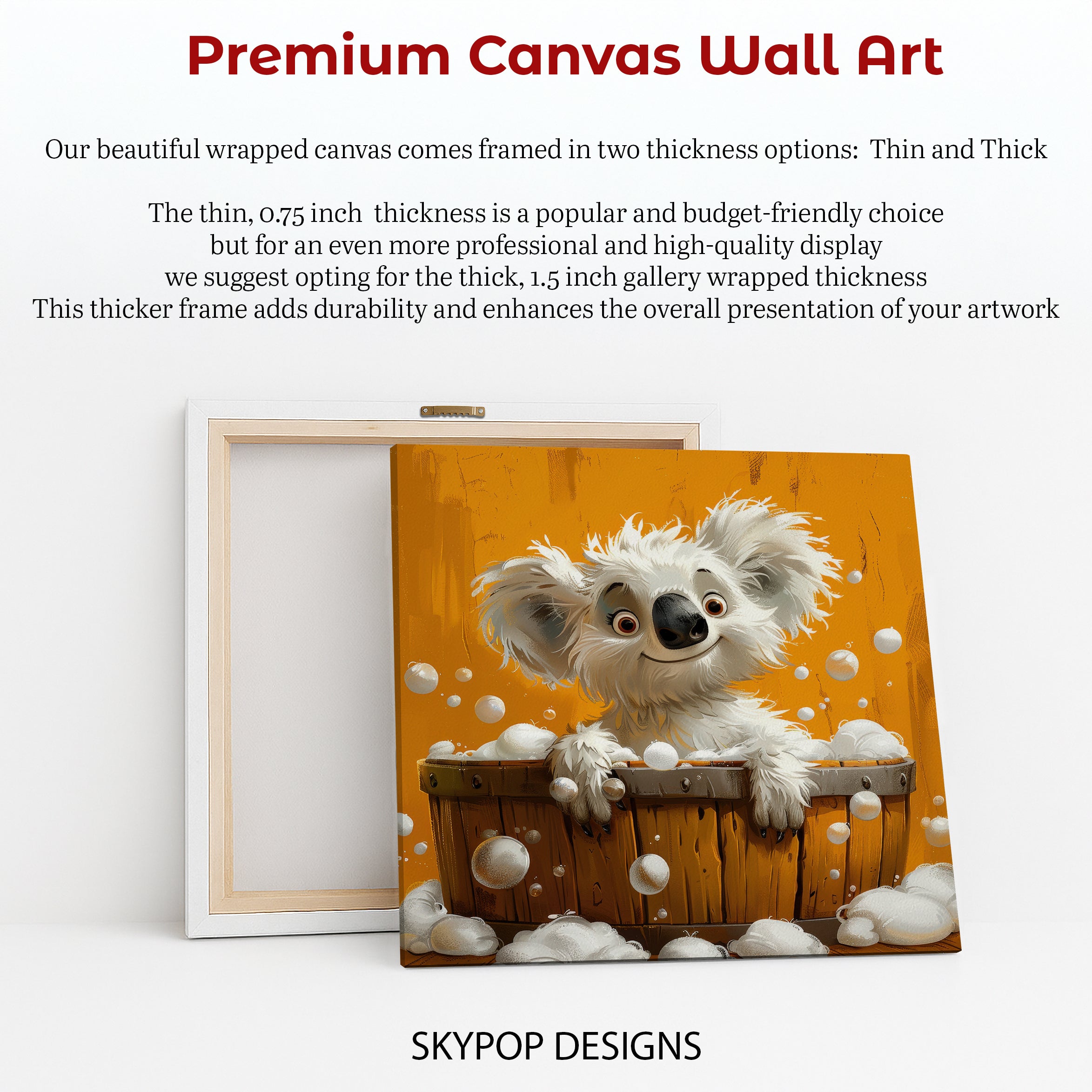Transform your space with this adorable koala canvas wall art, perfect for adding a touch of whimsy and joy to any room. This captivating poster showcases a fluffy koala enjoying a bubbly bath, creating a serene and cheerful atmosphere. The vibrant orange background and the playful white bubbles beautifully complement the koala's charming expression, making this a striking piece of animal art. Ideal for contemporary homes, this canvas wall art also fits perfectly into farmhouse or bohemian decor styles, bringing warmth and personality to your walls. Whether you're looking to decorate a children's room, a bathroom, or a cozy living room, this versatile artwork is sure to delight. Its high-quality printing ensures every detail of the koala's fur and the glistening bubbles are captured, offering a premium feel to your wall decor. This stunning piece is a fantastic gift idea for birthdays, housewarmings, or any occasion for animal lovers. It brings a sense of lightheartedness and relaxation, embodying the simple pleasures of a good bath. Elevate your home's aesthetic with this unique and heartwarming koala artwork, a true statement piece that sparks smiles and conversation. Make your walls pop with this cheerful koala poster today. This canvas print is ready to transform your space.