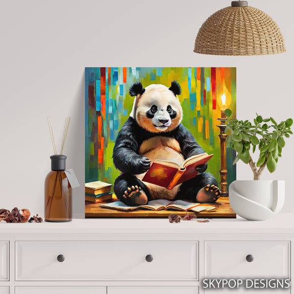 Keywords: Panda canvas art, Animal wall art, Whimsical art, Contemporary art, Bohemian decor, Modern decor, Scandinavian decor, Living room art, Bedroom art, Office wall art, Library decor, Multicolor art, Yellow art, Green art, Orange art, Panda art, Bookworm art, Canvas print, Wall art poster, Home decor, Interior design, Statement piece, Gift for book lovers, Housewarming gift, Birthday gift, Holiday gift, Playful art, Cheerful art, Study decor, Animal print