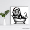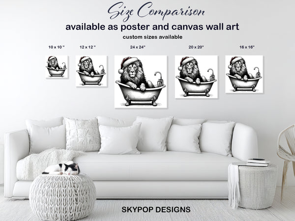 Transform your space with this humorous lion canvas wall art featuring a majestic lion enjoying a festive Christmas bath. This striking poster captures the whimsical side of the king of the jungle, making it a conversation starter for any room. The bold black and white illustration with a touch of festive red from the Santa hat creates a captivating visual that adds personality to your home. This unique wall art or canvas print is perfect for modern bathrooms, cozy living rooms, or even a quirky bedroom. Whether you're looking for bohemian decor to express individuality or rustic charm to add warmth, this piece fits beautifully. It's an unusual and delightful piece of animal art that brings a smile and a touch of holiday spirit year-round. The detailed linework showcased on this poster or canvas wall art offers a timeless appeal, evoking a sense of vintage illustration with a contemporary twist. Ideal for gifting to animal lovers or as a unique housewarming present, this artwork is sure to be cherished. Elevate your walls with this playful and sophisticated lion artwork, a perfect addition to any collection seeking character and charm. Showcase your love for animals and unique decor with this memorable Christmas lion canvas art. Make your space unforgettable with this distinctive and captivating piece of wall art today.