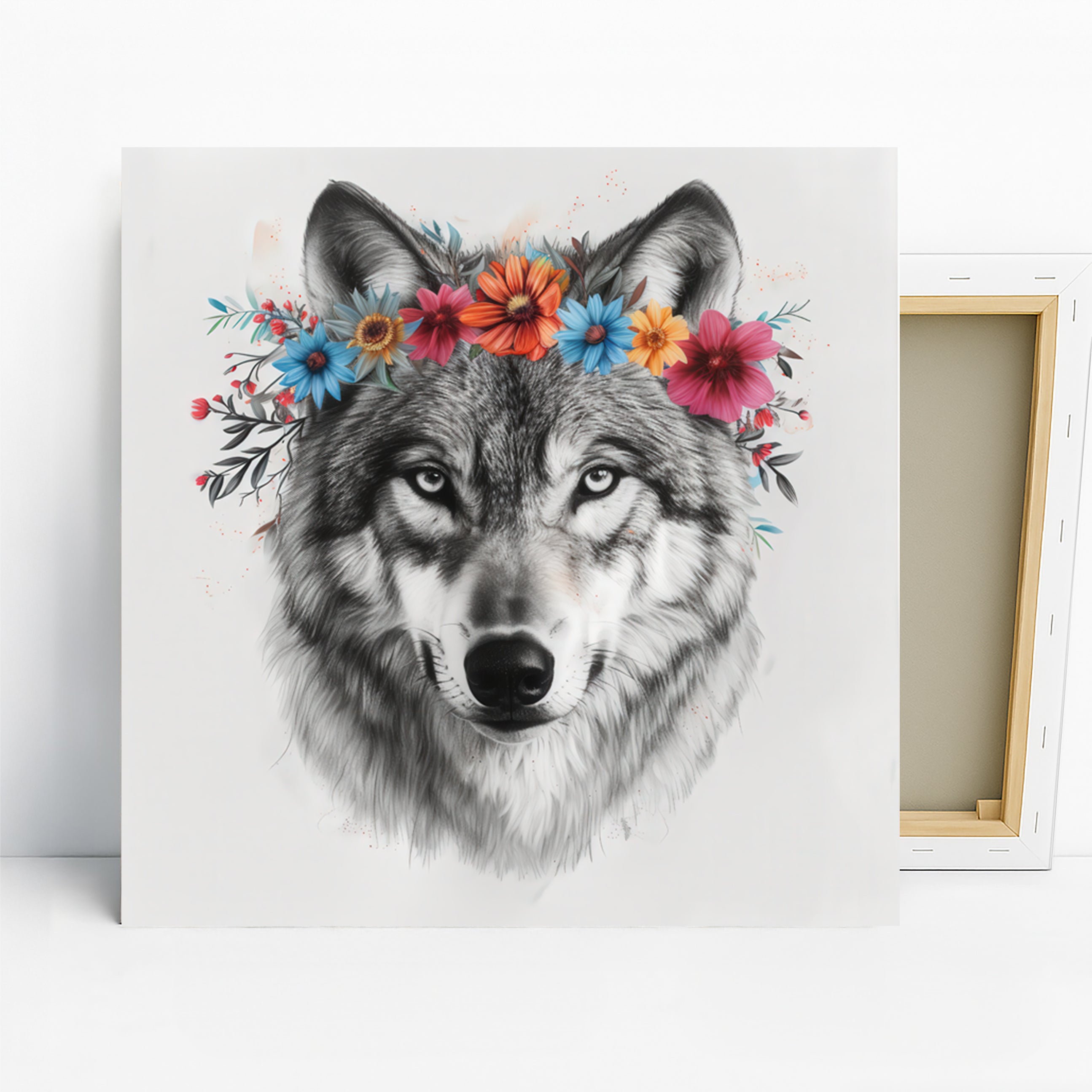 Elevate your living space with this stunning Wolf canvas wall art, featuring a majestic wolf adorned with a vibrant floral crown. This captivating poster brings the untamed beauty of nature indoors, creating a focal point that inspires. The striking combination of detailed charcoal-like wolf rendering and colorful wildflowers makes this canvas wall art a perfect accent for bohemian or rustic decor styles. Ideal for living rooms, bedrooms, entryways, or dining rooms, this piece adds a touch of wilderness and artistry to any setting. The multicolor palette of the floral crown, with pops of pink, orange, and blue, creates a lively contrast against the wolf's grey and white fur. This versatile poster artwork is wonderful for transforming a modern home into a sanctuary of natural elegance. It’s an exceptional gift for nature lovers, animal art collectors, or for housewarming and birthdays. Showcase your appreciation for wildlife with this unique wolf wall art that perfectly blends artistic detail with natural charm. The quality printing ensures every stroke and petal are beautifully rendered on this canvas. Bring the spirit of the wild and blooming beauty into your home and transform your room today. This striking wall art will be a conversation starter and a cherished addition to your home decor.