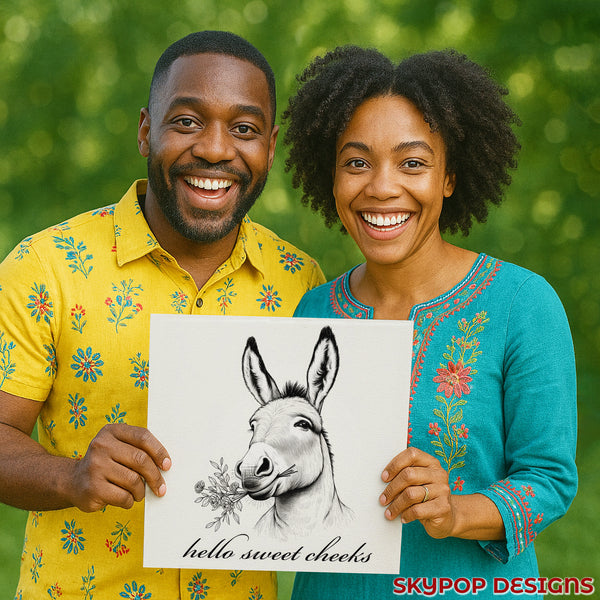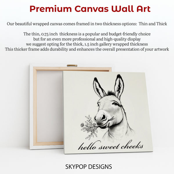 Add a touch of charm with this donkey canvas wall art, perfect for bringing a farmhouse feel to your home. This striking black and white poster features a gentle donkey holding a delicate bouquet of flowers, creating a captivating focal point. The minimalist style and classic animal art make this piece versatile, ideal for a modern living room or a cozy rustic bedroom. The detailed linework and subtle shading on this canvas wall art showcase the beauty of the donkey and its floral offering, evoking a sense of warmth and personality. It is a wonderful addition to any farmhouse decor, adding character to your entryway or kitchen. This high-quality print, also available as a poster, captures the endearing expression of the donkey, making it a delightful piece of wall decor. Perfect for farm animal lovers, this artwork also makes a thoughtful housewarming gift or a unique birthday present. Enhance your space with this charming donkey art that celebrates nature and simple beauty. The timeless black and white palette ensures this canvas art complements any color scheme. Transform your home with this endearing donkey illustration, a perfect blend of vintage charm and contemporary appeal. Elevate your wall art collection with this unique statement piece that brings joy to any room.
