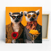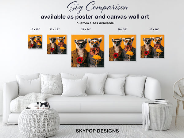 Transform your space with this unique lemur canvas wall art featuring two dapper ring-tailed lemurs dressed in stylish check blazers and sporting quirky glasses. This captivating poster brings a touch of playful sophistication to any room, making it a true conversation starter. The vibrant yellow and orange hues, combined with the natural tones of the lemurs and the pops of red from the flowers, create a striking visual impact. This animal art is perfect for adding personality to your living room or creating a whimsical atmosphere in a bedroom. It’s an ideal piece for those who appreciate out-of-the-box decor and enjoy blending contemporary art with eclectic styles. This artwork is also a fantastic gift for birthdays, housewarmings, or any occasion, bringing joy and a touch of whimsy to your loved ones' homes. The textured detail and high-quality printing on this canvas wall art ensure a stunning visual experience, making it a standout addition to your wall decor collection. Elevate your home's ambiance with this charming lemur artwork, celebrating individuality and a love for the unconventional. Add this delightful piece to your collection and enjoy its unique charm every day.