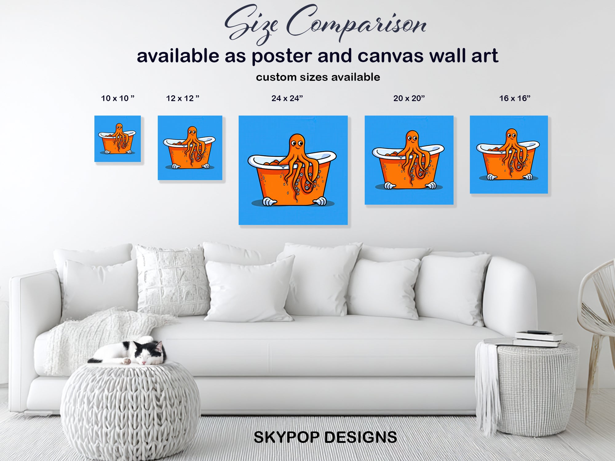 Keywords: Octopus Wall Art, Whimsical Art, Pop Art, Animal Art, Contemporary Decor, Modern Decor, Bohemian Decor, Bathroom Art, Kids Room Decor, Living Room Wall Art, Sunroom Decor, Blue Art, Orange Art, White Art, Black Art, Octopus Print, Bubble Bath Art, Bathtime Octopus, Playful Artwork, Vibrant Home Decor, Cheerful Wall Decor, Unique Gift, Housewarming Gift, Birthday Gift, Canvas Wall Art, Underwater Whimsy, Bright Octopus Art, Modern Interiors, Quirky Home Decor, Art Lovers