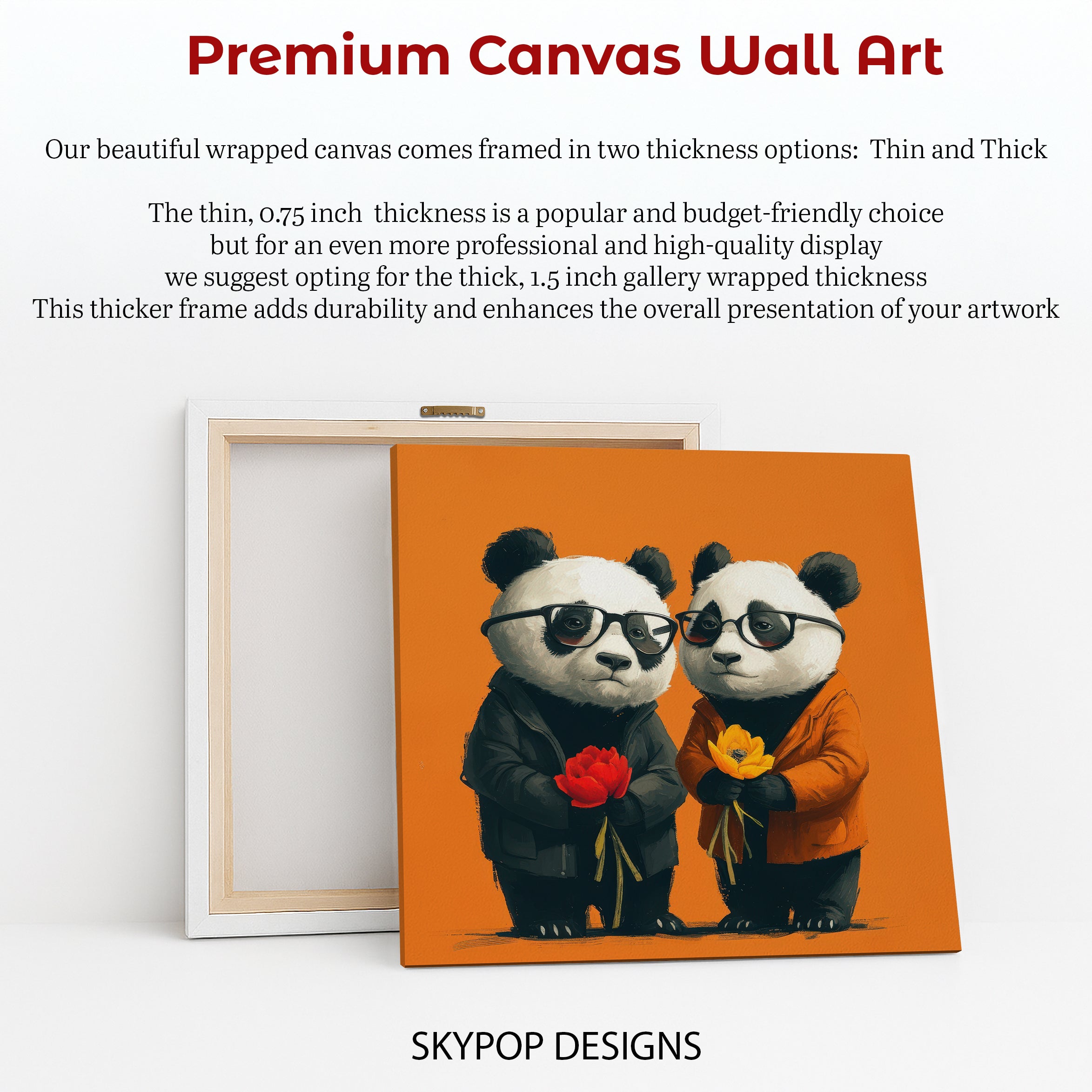 Transform your space with this incredibly charming panda canvas wall art that captures a heartwarming moment. This delightful poster features two stylish pandas, complete with glasses, holding vibrant flowers on a striking orange backdrop. The contemporary art style and whimsical animal theme make this canvas wall art a unique addition to any room, perfect for adding personality to your living room or bedroom decor. The bold orange hue provides a warm, energetic feel, while the pandas themselves evoke feelings of sweetness and affection. Showcase your love for animals and unique art with this eye-catching piece, ideal for modern, bohemian, or Scandinavian decor styles. This poster or canvas wall art is a fantastic gift idea for birthdays or housewarmings, bringing joy and a touch of quirky charm to the recipient's home. The high-quality canvas printing ensures the vibrant colors and detailed brushstrokes are preserved for years to come. Elevate your wall decor with this captivating artwork that sparks conversation and adds a delightful focal point to your walls. This versatile wall art complements various color palettes and decor trends, making it a favorite for stylish homes. Enhance your space with this adorable panda artwork and embrace the playful yet sophisticated aesthetic it offers, creating a welcoming and inspiring atmosphere.