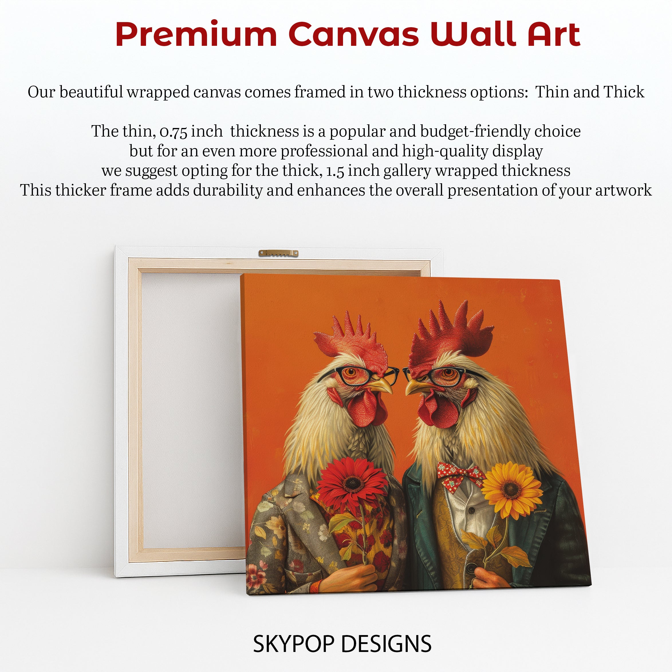 Transform your space with this unique rooster canvas wall art featuring two dapper roosters dressed in stylish jackets and holding vibrant flowers. This captivating poster or canvas wall art adds a touch of whimsical charm and sophistication to any decor. The striking orange background and rich details of the roosters' feathers and attire create a visually appealing focal point that sparks conversation. Perfect for living rooms, bedrooms, or offices, this piece blends contemporary art with a playful subject matter, ideal for bohemian or eclectic interior styles. The contrast between the bold orange and the detailed patterns on the roosters' clothing and the vivid floral elements enhances the artwork's depth and character. This canvas wall art is also a fantastic gift idea for animal lovers or for housewarming occasions. Its quality printing ensures the vibrant colors and intricate textures are showcased beautifully on your walls. Whether you're looking to update your modern living room decor or add a quirky touch to a farmhouse kitchen, this versatile artwork complements various design aesthetics. Elevate your home's ambiance with this charming and characterful piece that celebrates the unexpected beauty in everyday subjects. Make this eye-catching rooster artwork the centerpiece of your wall decor collection today.