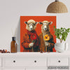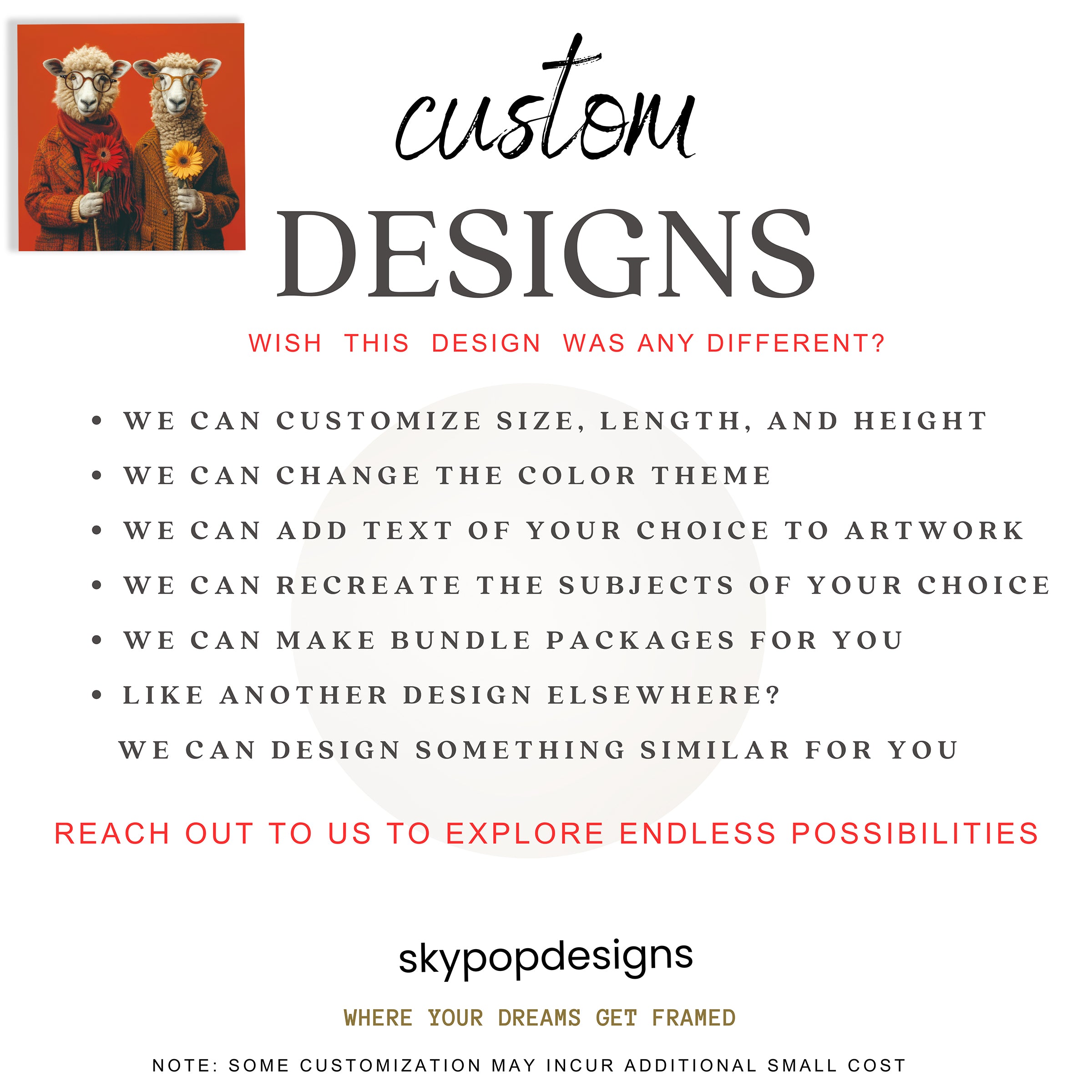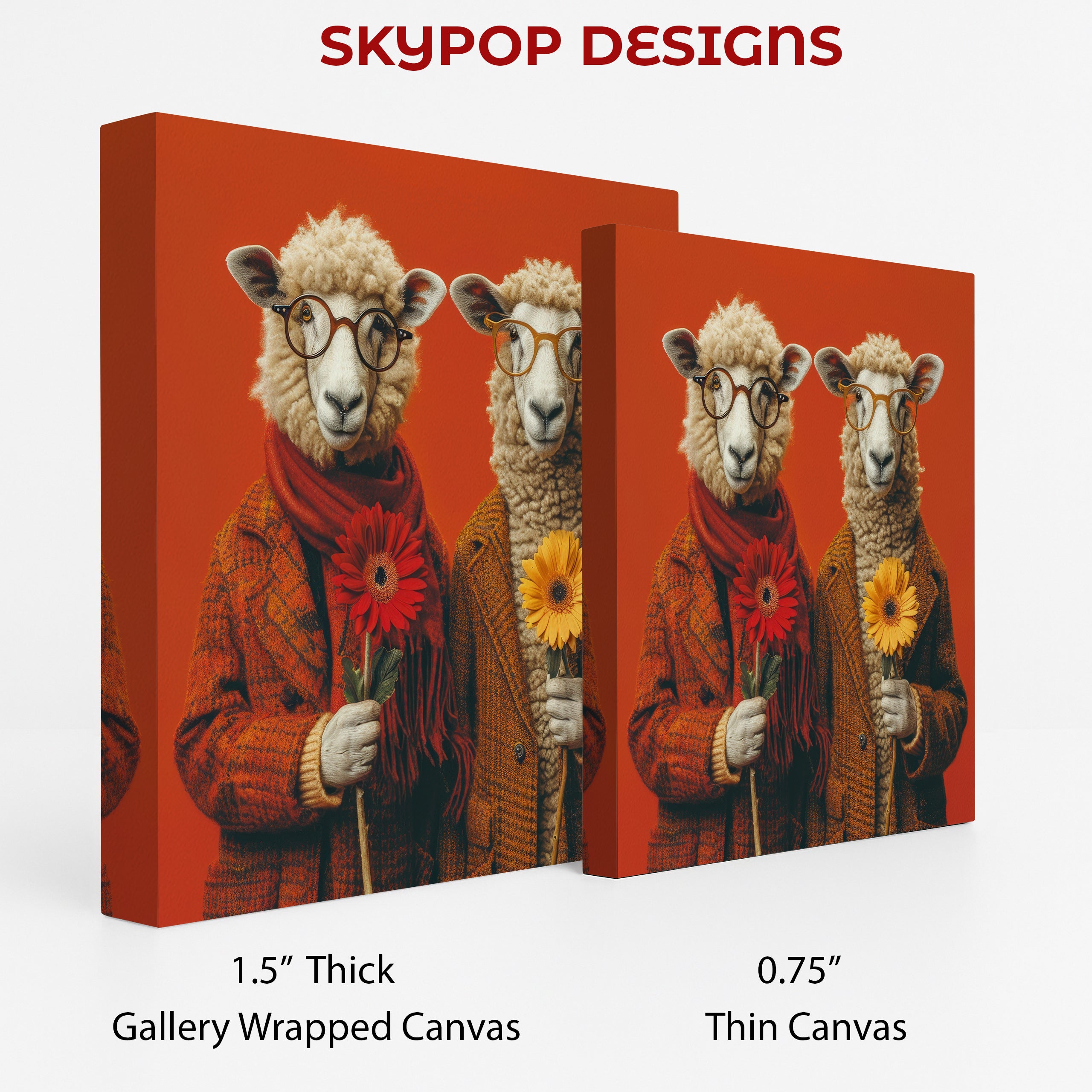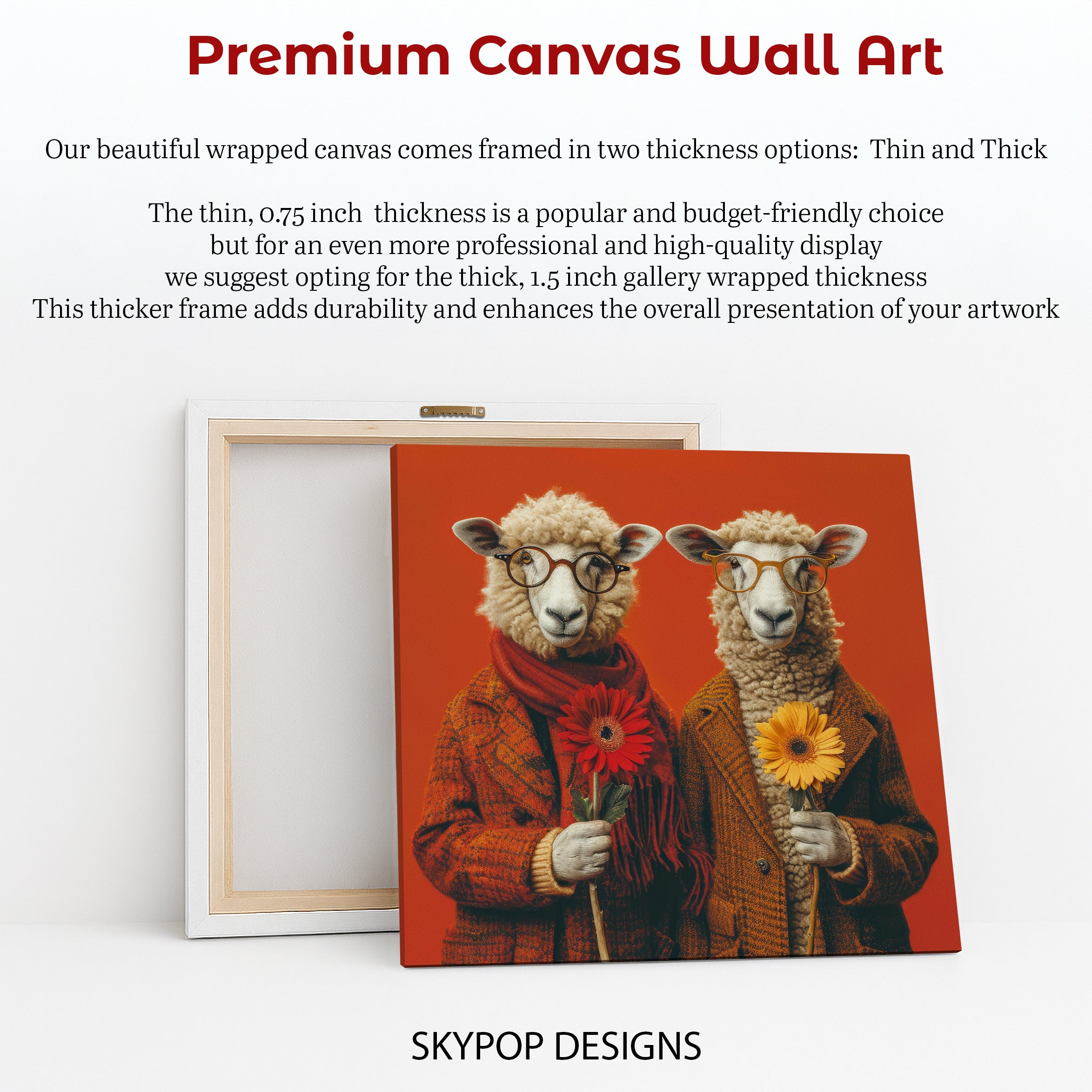 Add a touch of quirky charm to your home with this unique sheep canvas wall art. Featuring two stylish sheep sporting glasses and holding vibrant flowers, this piece brings a playful yet sophisticated vibe to any room. The rich orange and red color palette, combined with the detailed textures of the sheep's wool and outfits, creates a visually captivating focal point. This animal art poster is perfect for transforming your living room or bedroom into a cozy, eclectic retreat. It’s an ideal choice for those who love bohemian decor or modern farmhouses looking to add unconventional character. This canvas wall art also makes a wonderful gift for animal lovers, art enthusiasts, or anyone celebrating a birthday or housewarming. The striking composition and witty subject matter are sure to spark conversation and smiles. Elevate your wall decor with this distinctive piece that showcases personality and artistic flair. Printed on high-quality canvas, this artwork offers lasting beauty and vibrant colors for years to come. Bring a unique sense of style and joy into your space with this delightful sheep poster that celebrates individuality and gentle spirit. This wall art is a statement piece that captures the imagination and adds a warm, inviting atmosphere to your home. Transform your space with this conversation-starting print today.
