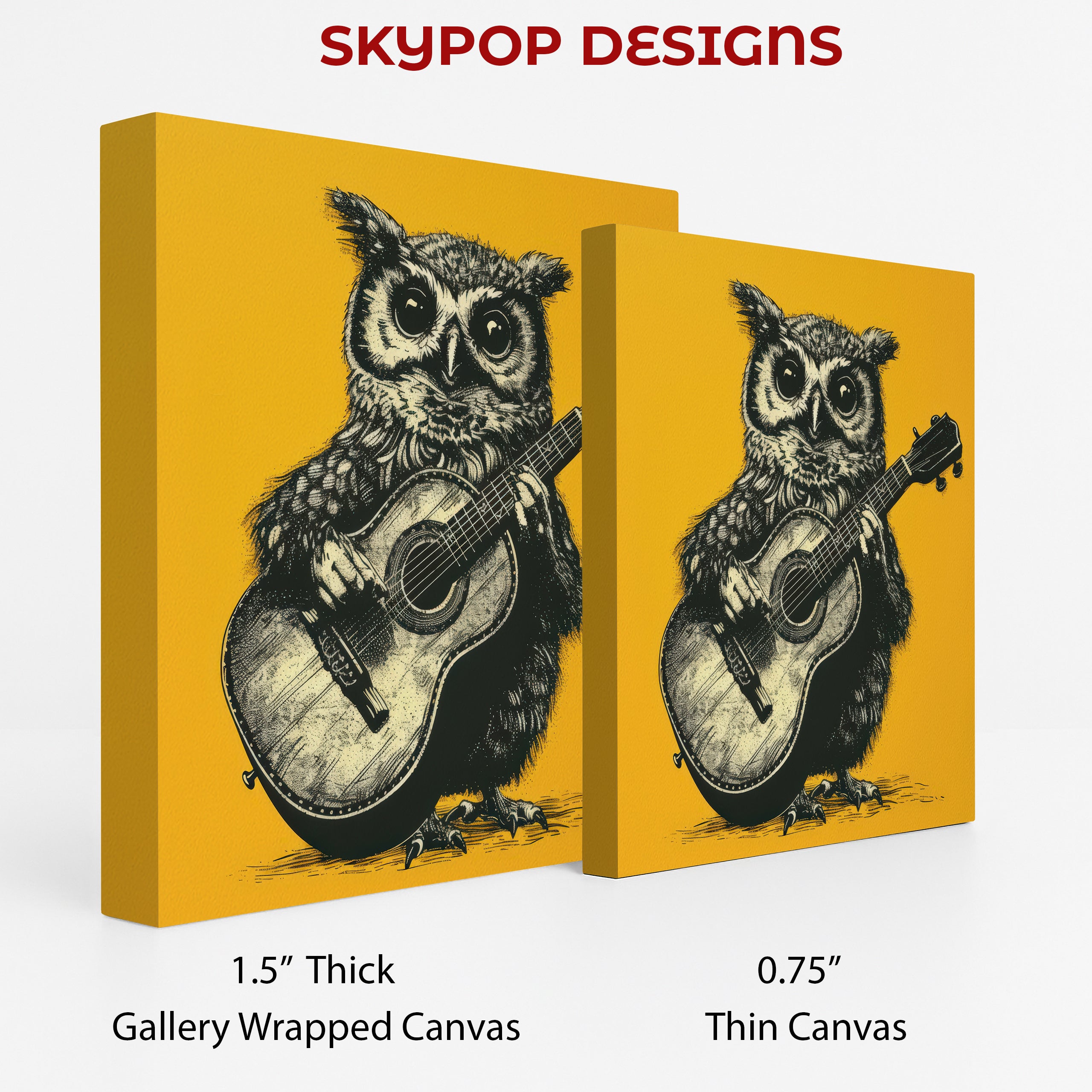 Guitar Playing Owl Art, Canvas or Poster, Whimsical Decor, Living Room Bedroom Office Music Room Wall Art, Yellow Black White Multicolor
