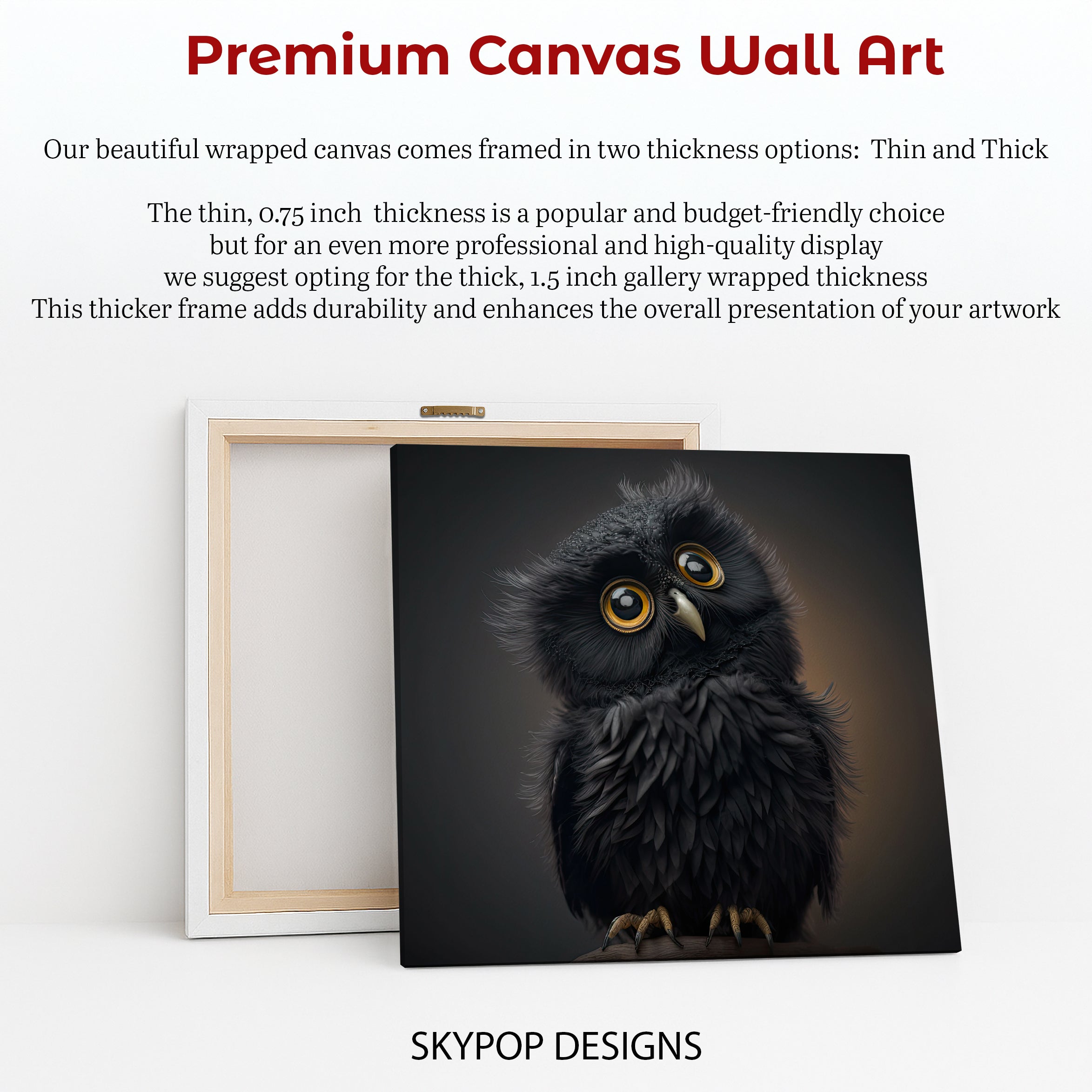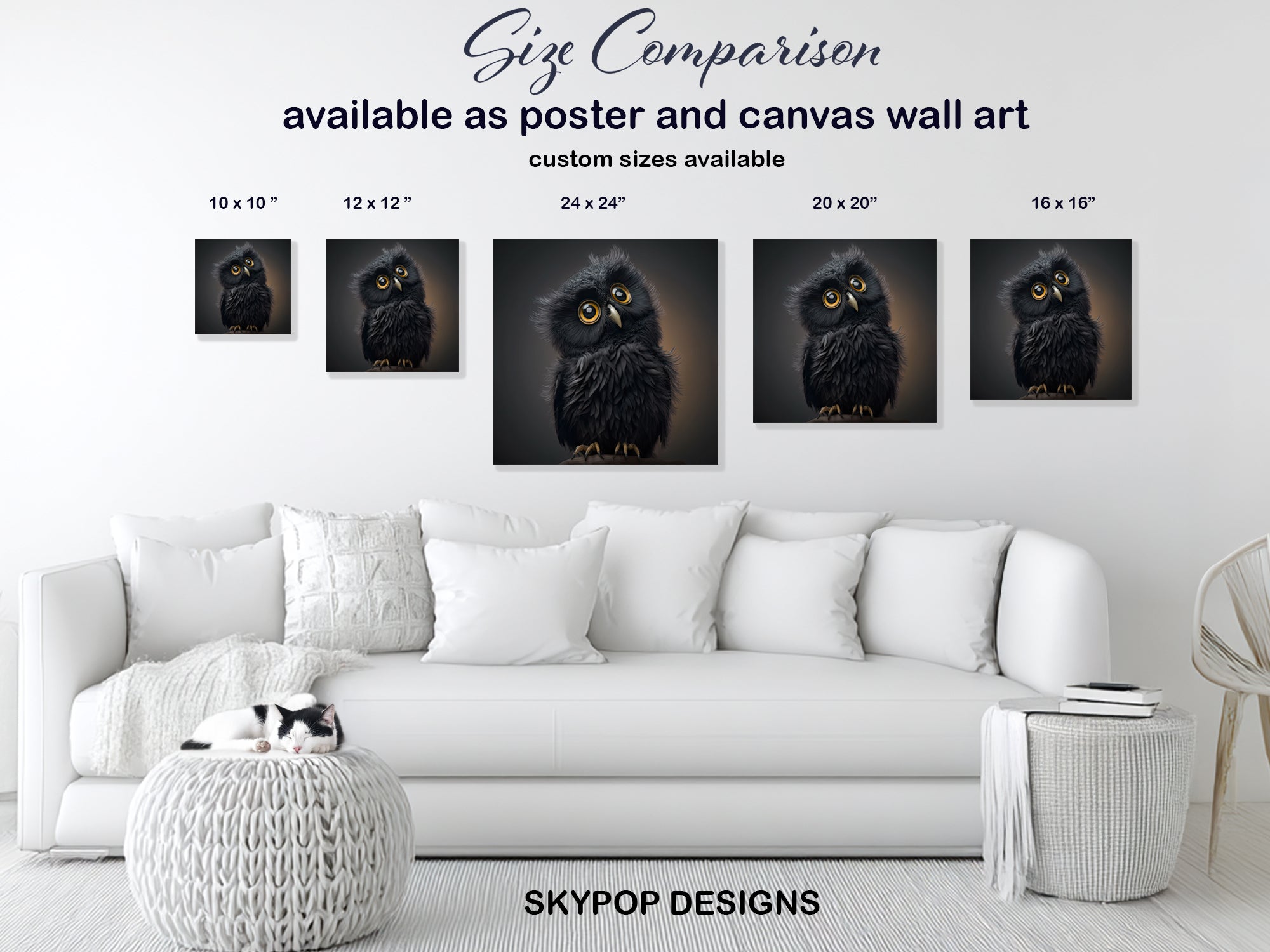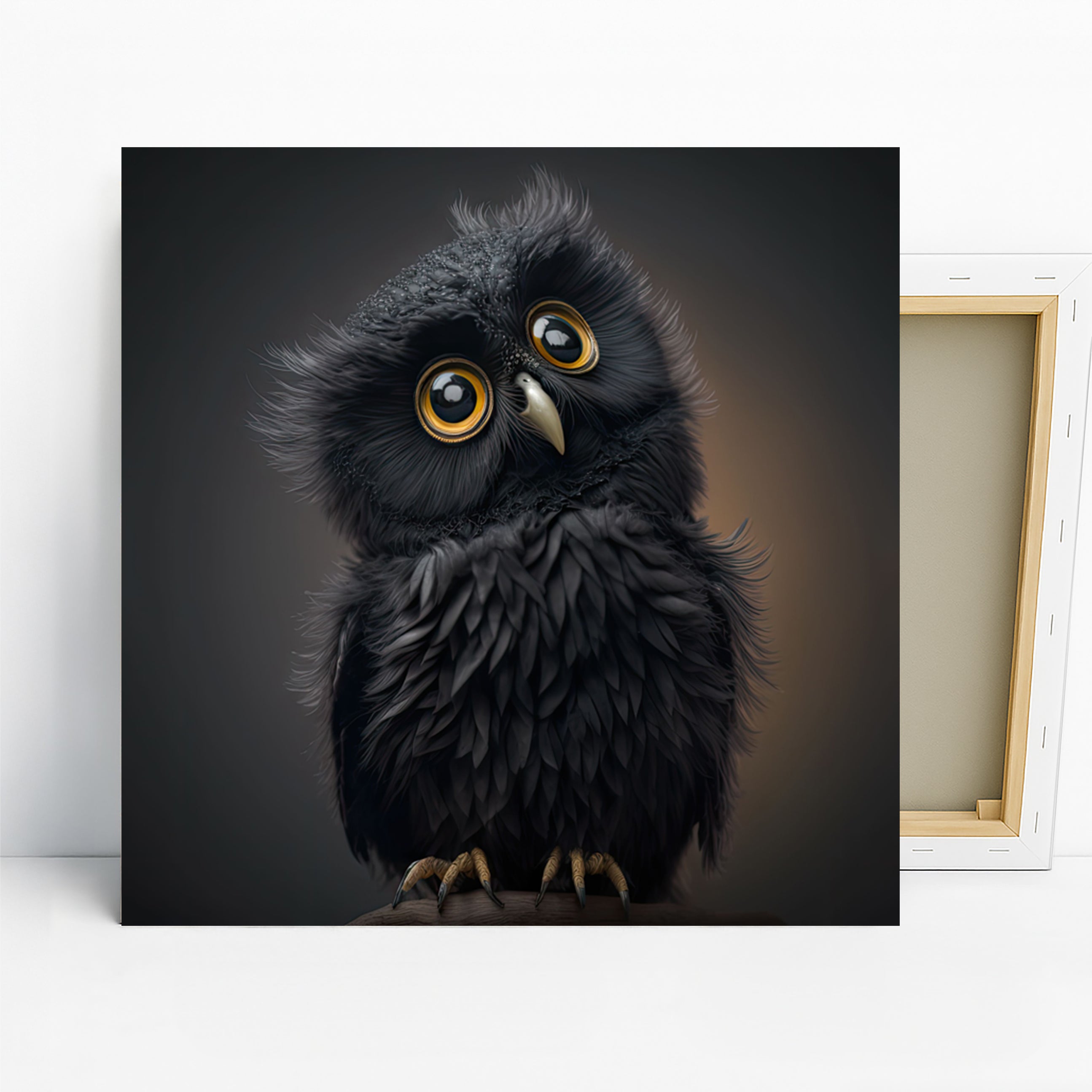 Elevate your home with this captivating owl canvas wall art, showcasing an adorable owl with striking golden eyes. The detailed, textured feathers and minimalist backdrop create a sophisticated yet charming piece that brings a touch of nature indoors. This poster or canvas wall art is perfect for modern living rooms or cozy bedrooms, adding a whimsical touch to any space. The deep black and grey hues create a sense of mystery and elegance, while the bright gold eyes add a pop of warmth and curiosity. Ideal for anyone who loves unique animal art, this wall art enhances contemporary decor and adds personality to minimalist interiors. The fine details in the feathers make this canvas wall art a delightful focal point that sparks conversation and wonder. It's a perfect gift for nature lovers, art collectors, or as a housewarming present to bring a smile to anyone's face. Available in various sizes, this high-quality print ensures sharp imagery and long-lasting vibrant colors. Transform your office or nursery into a more inviting space with this stunning owl poster. Discover the joy and personality this unique piece of wall art brings to your home. Embrace the charm of this owl canvas art and make your walls sing with character.