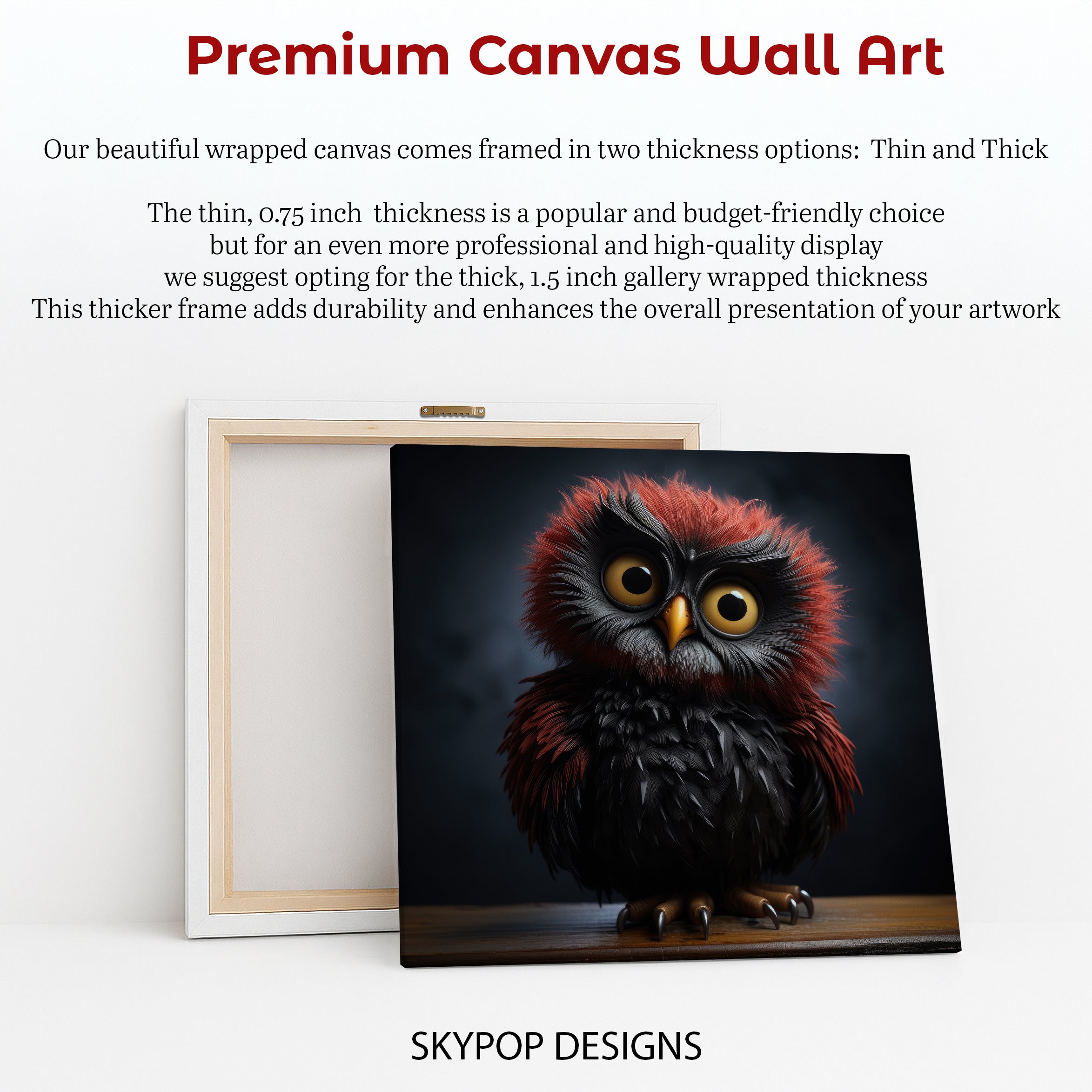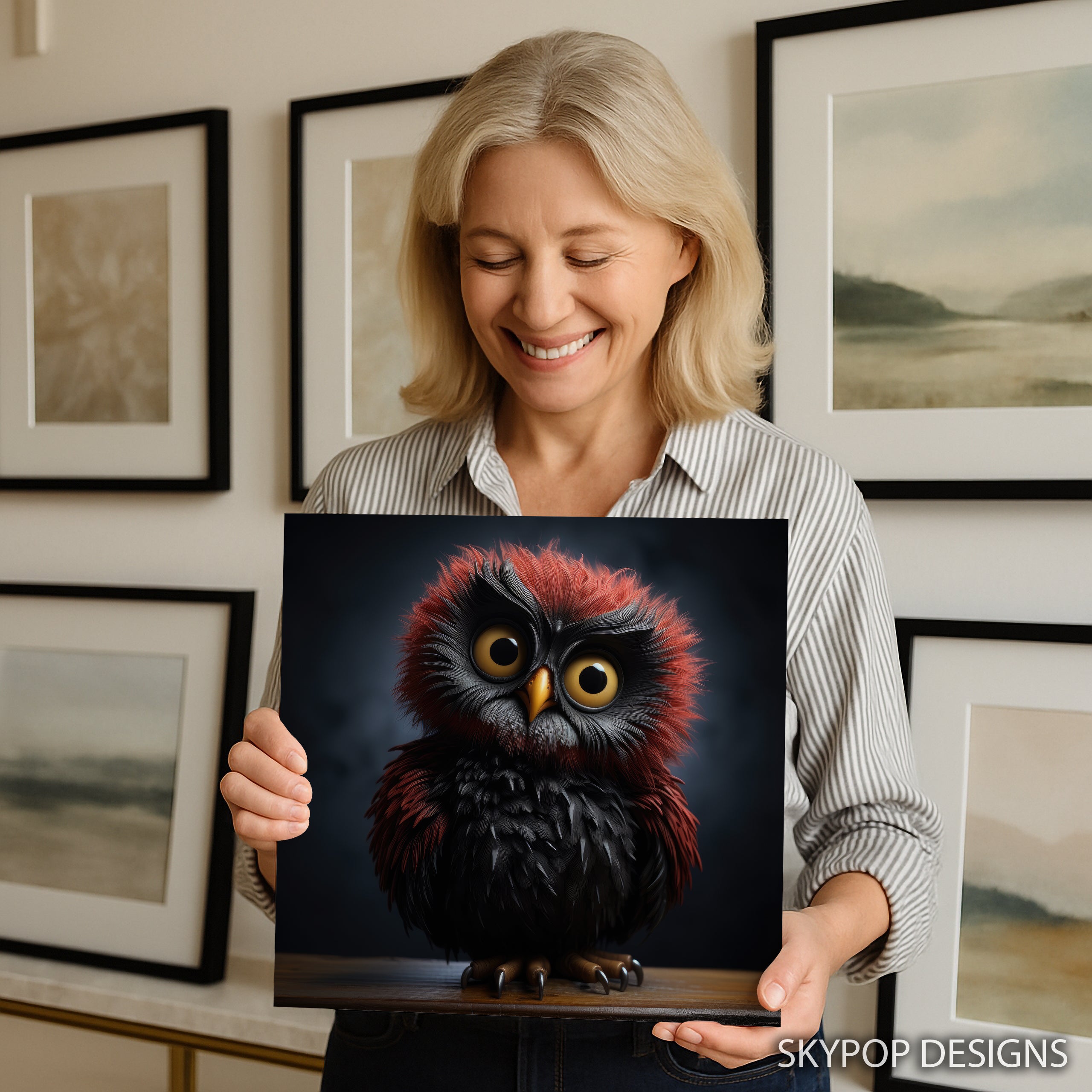 Capture attention with this striking owl canvas wall art, featuring a fantastical owl with vibrant red and black feathers and piercing yellow eyes. This unique animal art piece brings a touch of whimsy and modern flair to any space, perfect for transforming your living room into a captivating focal point. Whether you love modern or even slightly bohemian decor styles, this poster will add personality and warmth, making it a centerpiece for your wall art collection. The dramatic color palette of black, red, and gold evokes a sense of mystery and creativity, ideal for inspiring your home office or enlivening a bedroom. This canvas wall art's intricate feather details and expressive gaze create a visually engaging experience, making it more than just decor, but a conversation starter. It's a fantastic gift for owl enthusiasts, bird lovers, or anyone looking to add a bold statement to their home. The high-quality print on this canvas ensures the vibrant colors and sharp details pop, creating a stunning visual impact. Elevate your entryway or guest room with this eye-catching owl print, designed to inspire wonder and fascination. This poster is also an excellent choice for a child's room, sparking imagination with its fantastical design. Add this unique owl wall art to your collection and celebrate the wild beauty of nature reimagined. Transform your home with this magical owl poster today.