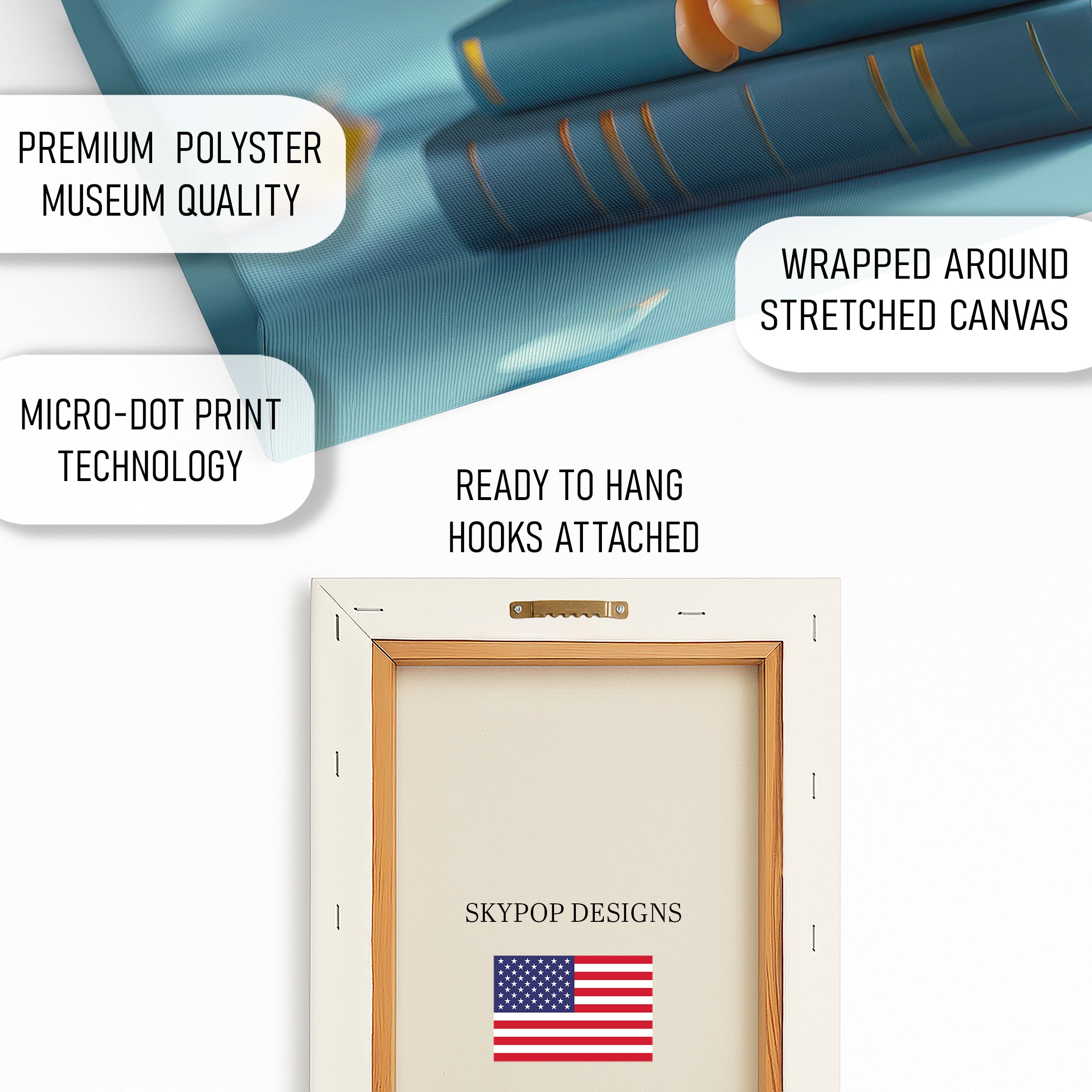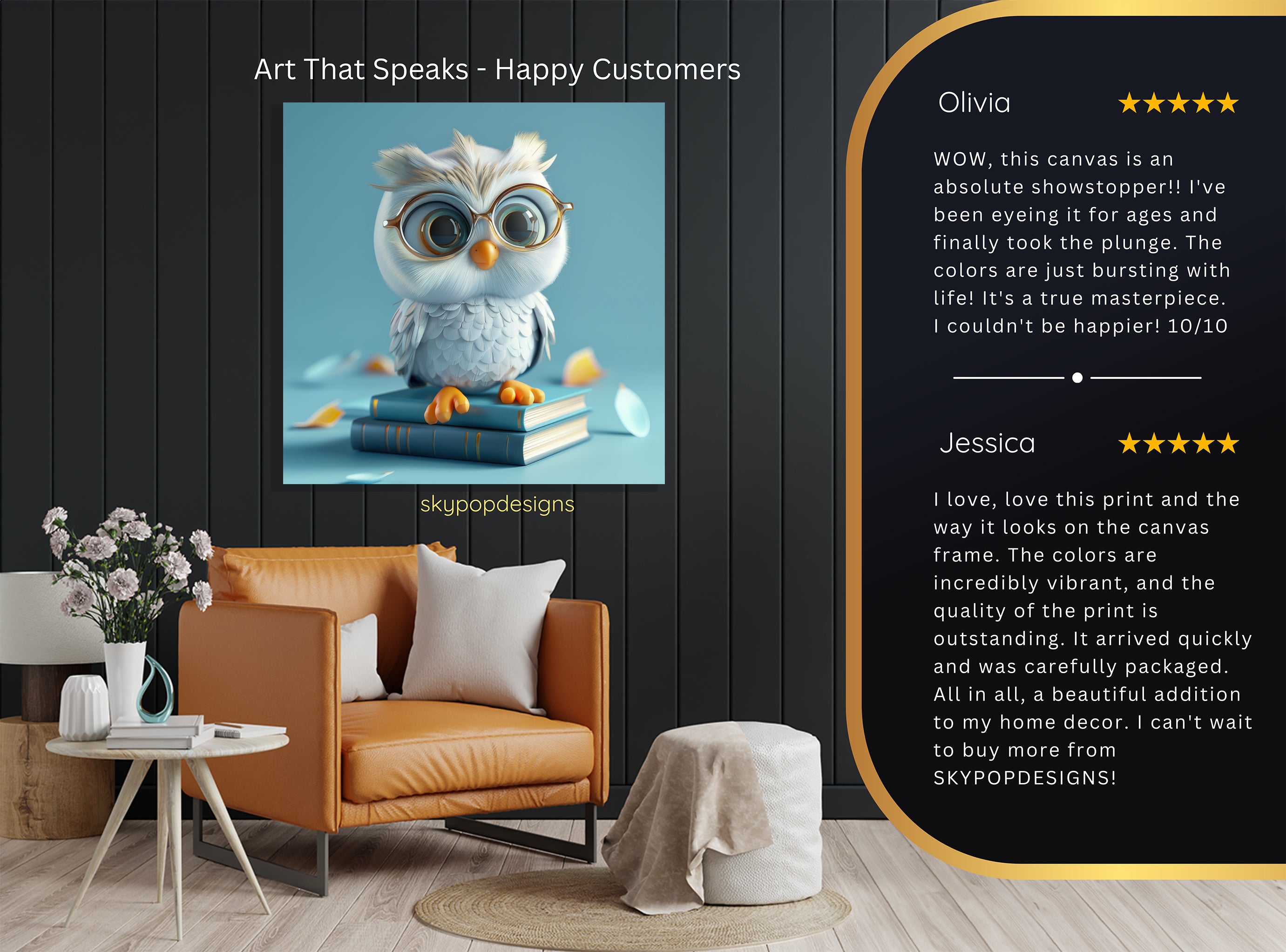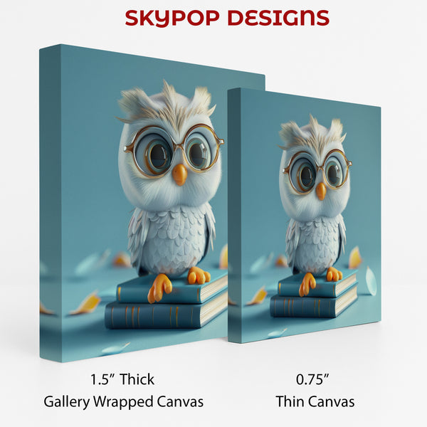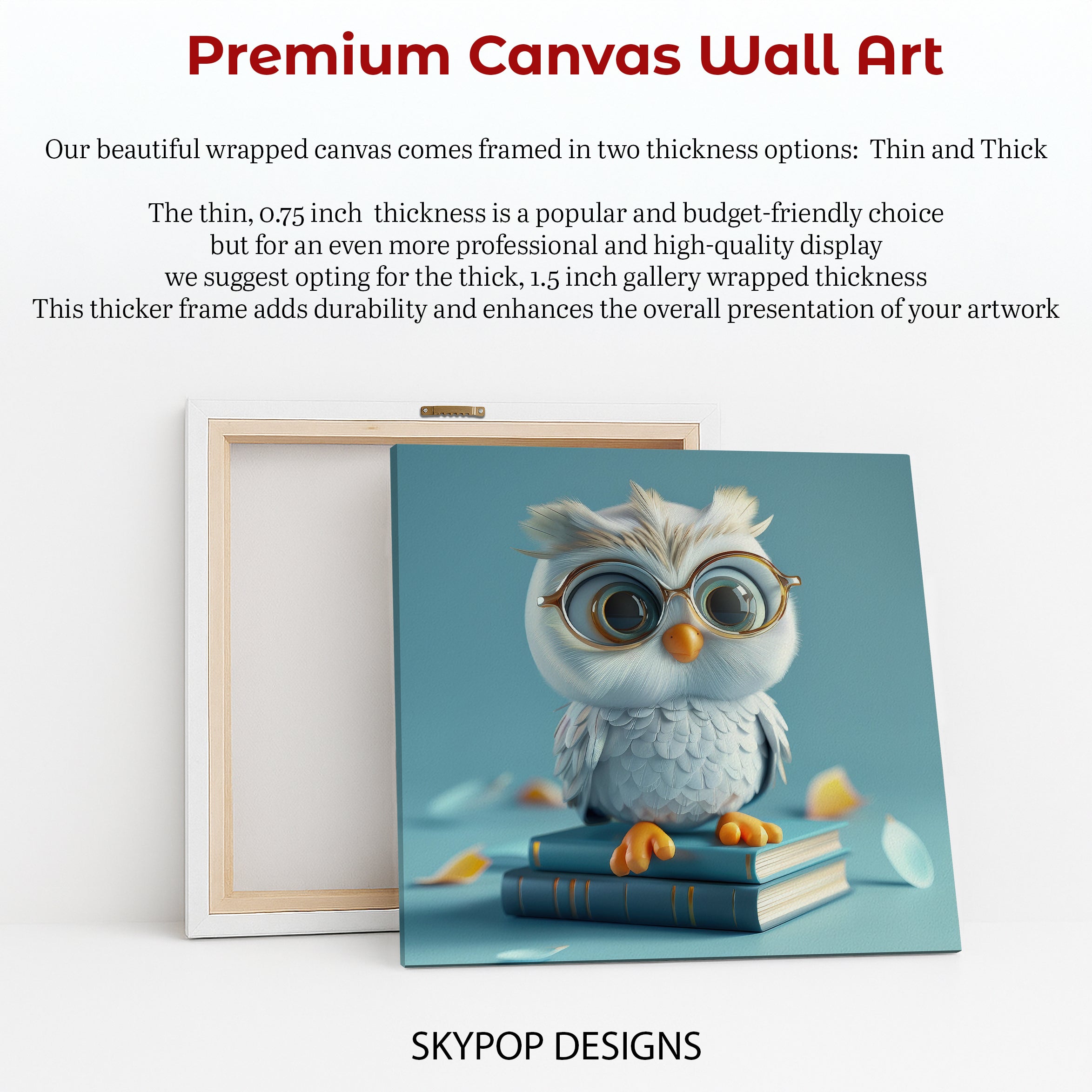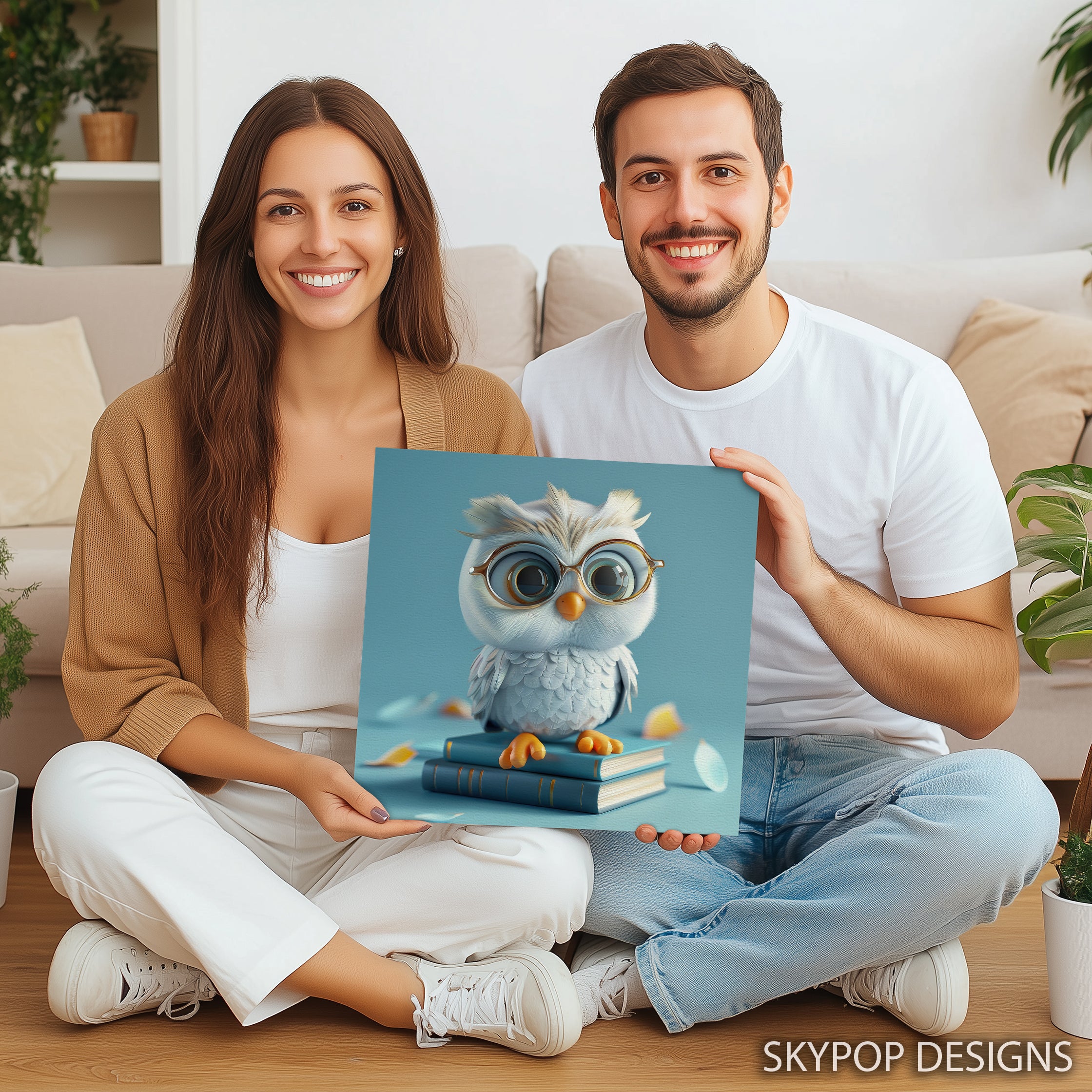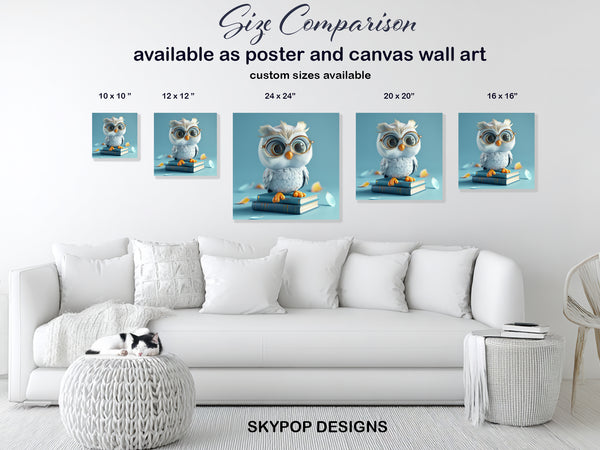 Transform your space with this adorable owl canvas wall art, perfect for sparking imagination and joy. This charming owl poster features a cute, wise owl perched on a stack of blue books, creating a whimsical and engaging piece of wall decor. The soft blue and white color palette, accented with pops of yellow from fallen leaves, evokes a sense of calm and intellectual curiosity. This canvas wall art is ideal for a child's room, a cozy reading nook, or a stimulating office space. The playful, stylized design makes it a standout addition to any modern or Scandinavian decor. Whether you're looking for a unique wall art print to celebrate the love of reading or a delightful gift for a student's birthday, this owl artwork delivers charm and personality. The high-quality print captures the detail of the owl's fluffy feathers and big, curious eyes, making it a captivating focal point. Enhance your home with this delightful poster that brings a touch of nature and whimsy to your interior design. Available in various sizes, this owl wall art is printed on premium canvas for lasting beauty. Elevate your decor with this inspirational piece that celebrates learning and the wonder of childhood. Make your walls talk with this sweet owl art, a perfect blend of cute animal art and sophisticated interior styling. Bring a smile to your face and add this enchanting owl canvas today.