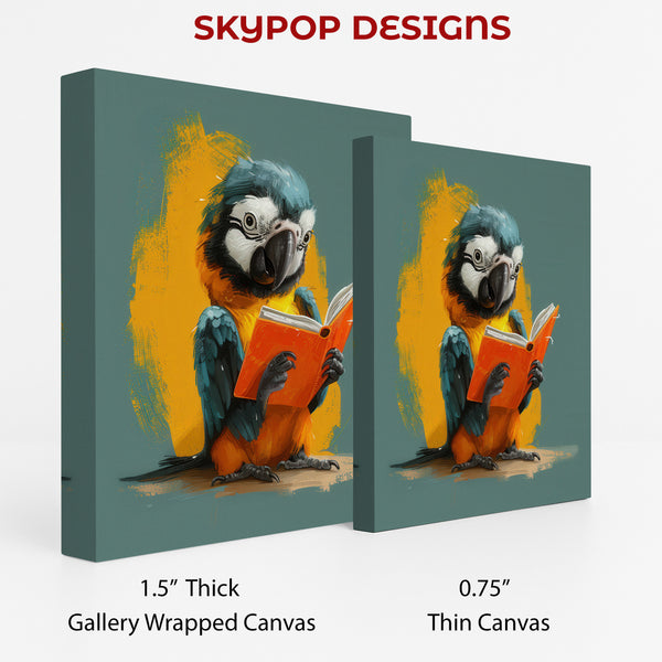 Parrot Reading Book Art, Canvas or Poster, Whimsical Pop Art, Contemporary Decor, Living Room Bedroom Office Art, Blue Orange Yellow Grey