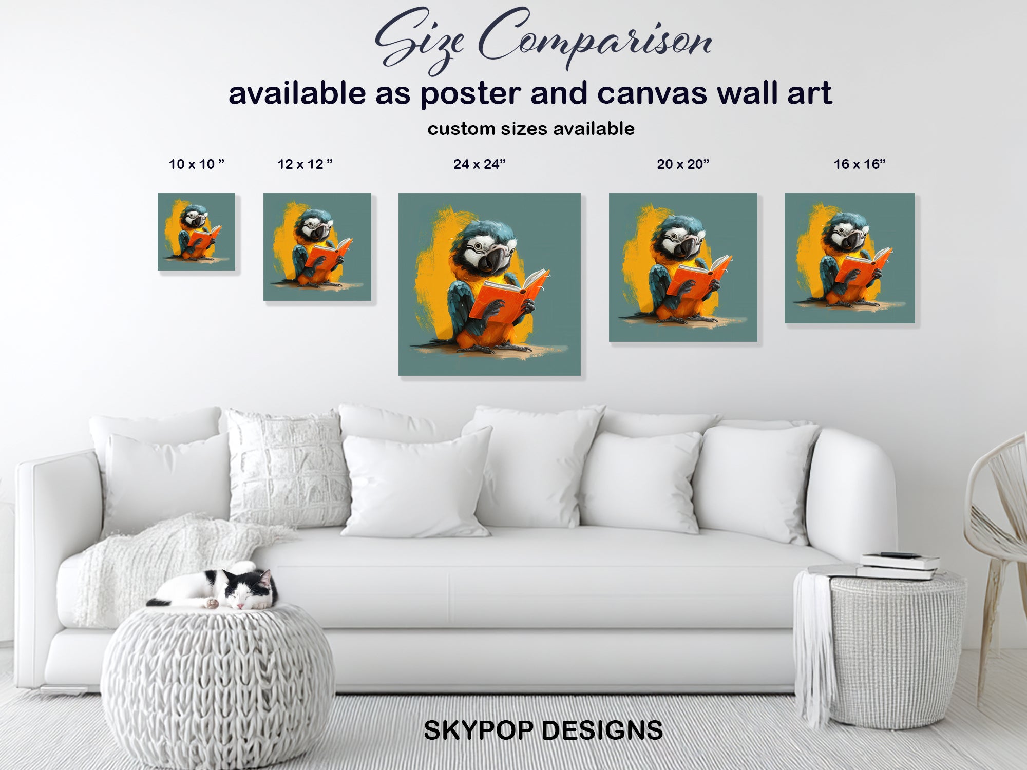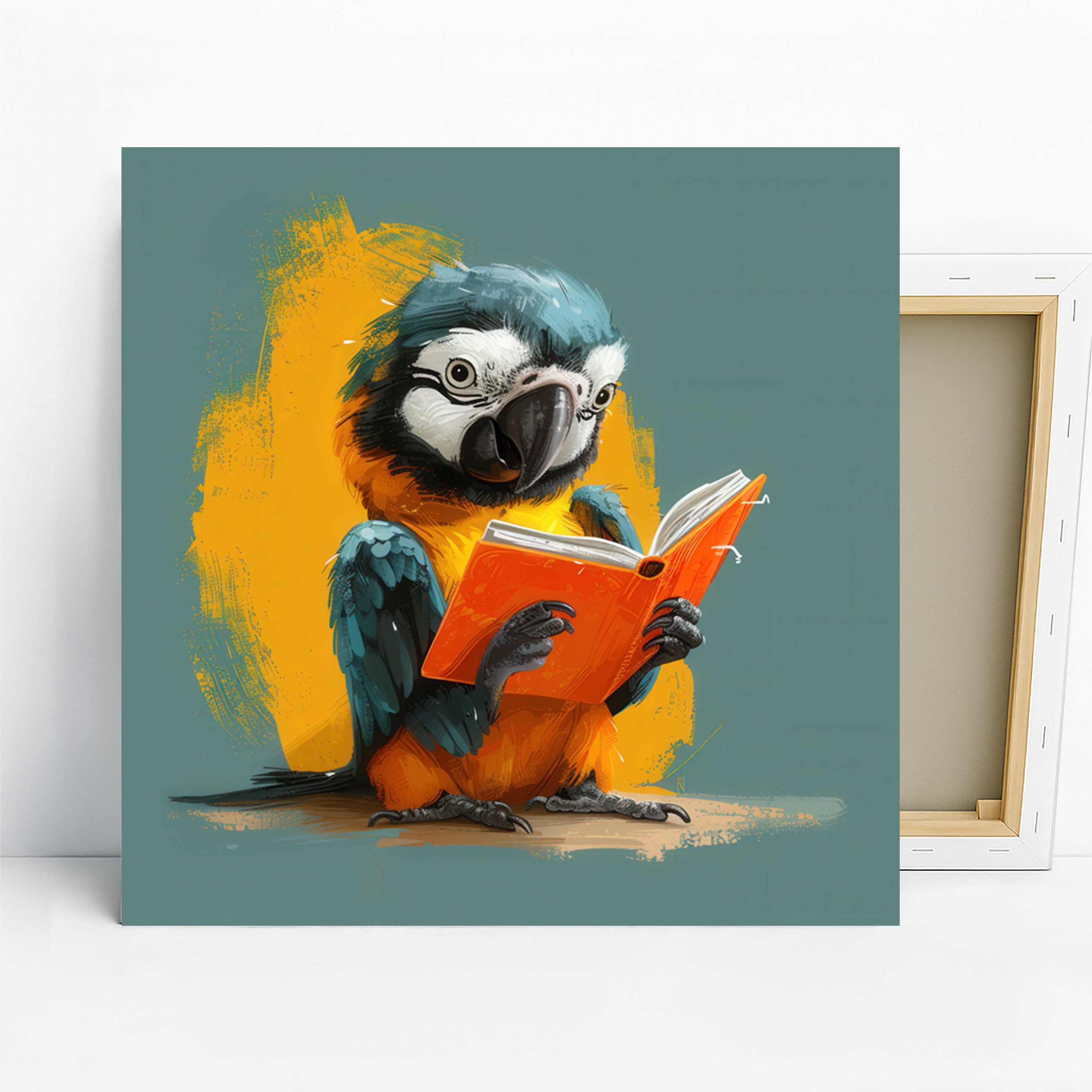 Keywords: Parrot wall art, Animal art, Whimsical art, Pop art, Blue parrot, Yellow parrot, Orange book, Grey background, Contemporary decor, Modern decor, Bohemian decor, Living room art, Bedroom art, Office decor, Children's room art, Canvas wall art, Poster art, Home decor, Wall art print, Bird art, Book lover gift, Unique wall art, Colorful wall art, Joyful decor, Optimistic art, Creative office decor, Gallery wall art, Conversation starter, Animal print, Home inspiration