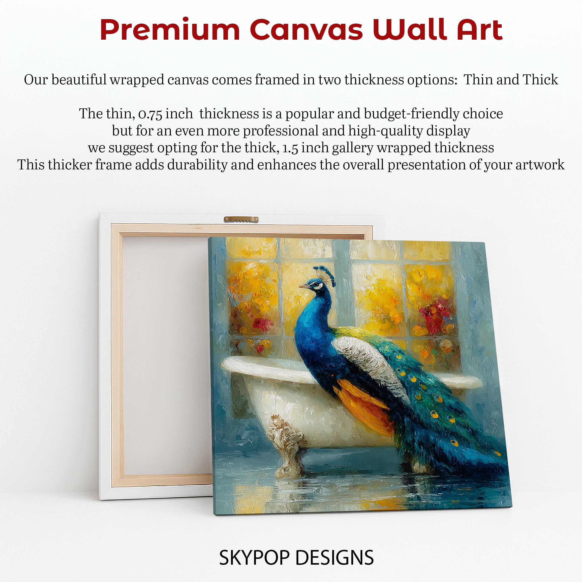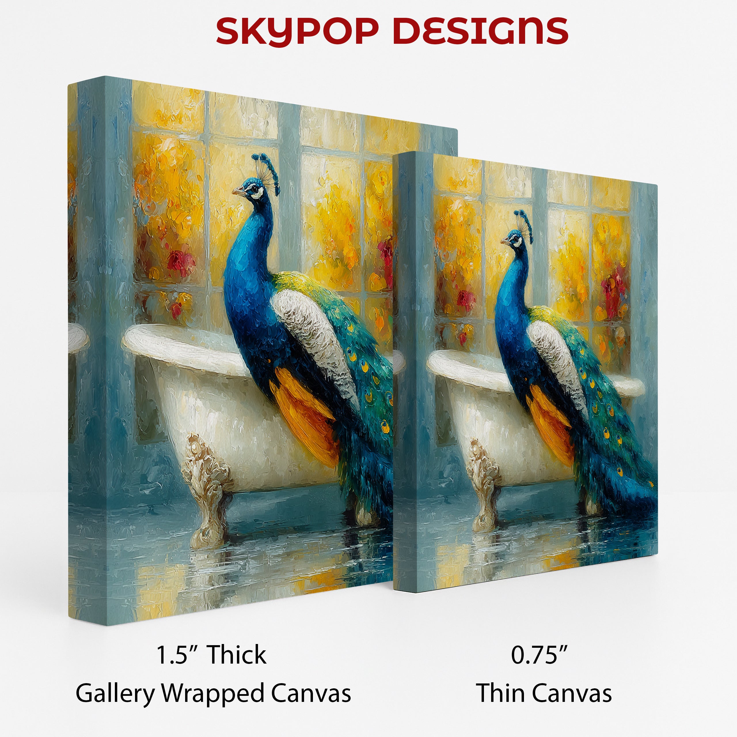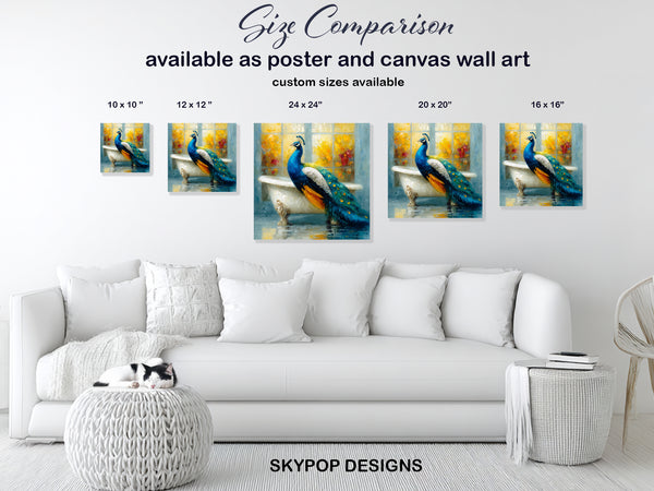 Keywords: Peacock Canvas Art, Animal Wall Art, Blue Yellow Gold Teal, Whimsical Art, Bohemian Decor, Contemporary Decor, Modern Decor, Bathroom Art, Bedroom Art, Living Room Art, Entryway Art, Peacock in Bathtub, Nature Art, Home Decor, Wall Decor, Canvas Print, Wall Poster, Luxury Art, Joyful Art, Colorful Art, Textured Brushstrokes, Painterly Art, Unique Artwork, Gift for Home, Housewarming Gift, Birthday Gift, Conversation Starter, Elegant Art, Charming Decor, High-Quality Canvas