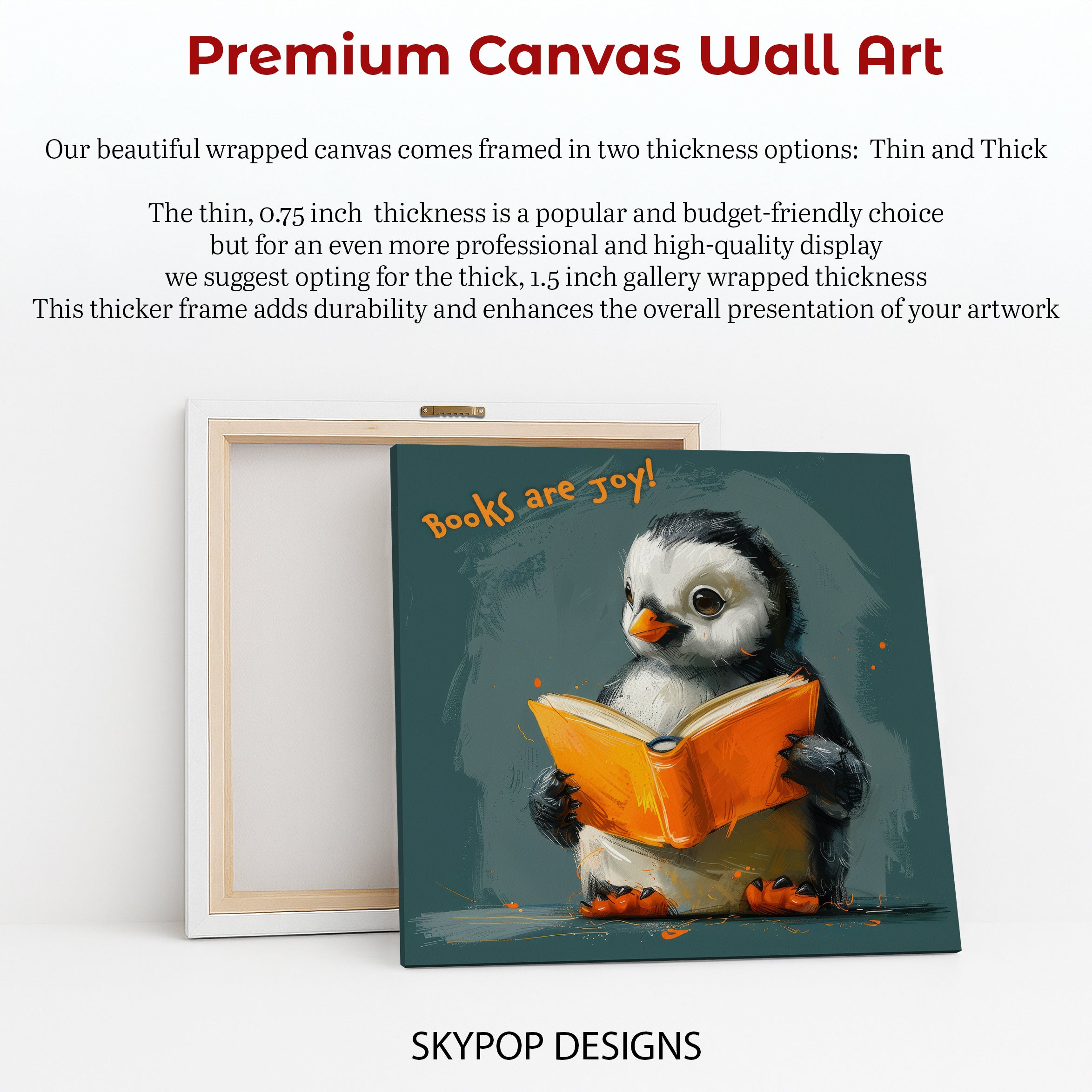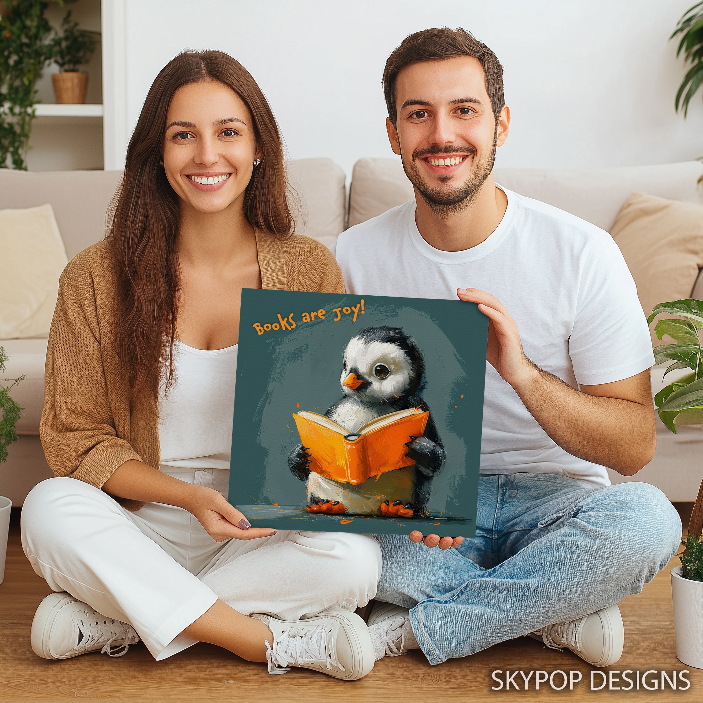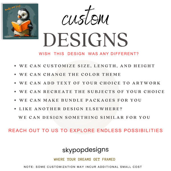 Enhance your home with this captivating penguin canvas wall art, featuring a charming penguin engrossed in an orange book. The phrase "Books are Joy!" adds a heartwarming touch to this delightful piece, bringing a sense of warmth and learning into any space. This poster or canvas wall art is perfect for living rooms, children's rooms, or offices, adding a splash of vibrant orange against a calming teal background. Its modern and minimalist aesthetic makes it a versatile addition to Scandinavian or contemporary decor styles, effortlessly elevating your wall decor. The playful illustration style and expressive eyes of the penguin evoke happiness and a love for reading, creating a positive atmosphere. This high-quality canvas print is ideal for anyone who cherishes books, making it a wonderful gift for birthdays, holidays, or housewarmings. Transform your space with this unique blend of animal art and inspiring messages, showcasing your passion for literature. The striking contrast and soft textures in this wall art will surely make it a conversation starter. Bring a touch of cheerful whimsy and cozy charm into your home with this delightful penguin artwork. Discover the joy of reading with this eye-catching canvas wall art that inspires smiles and creativity every day.