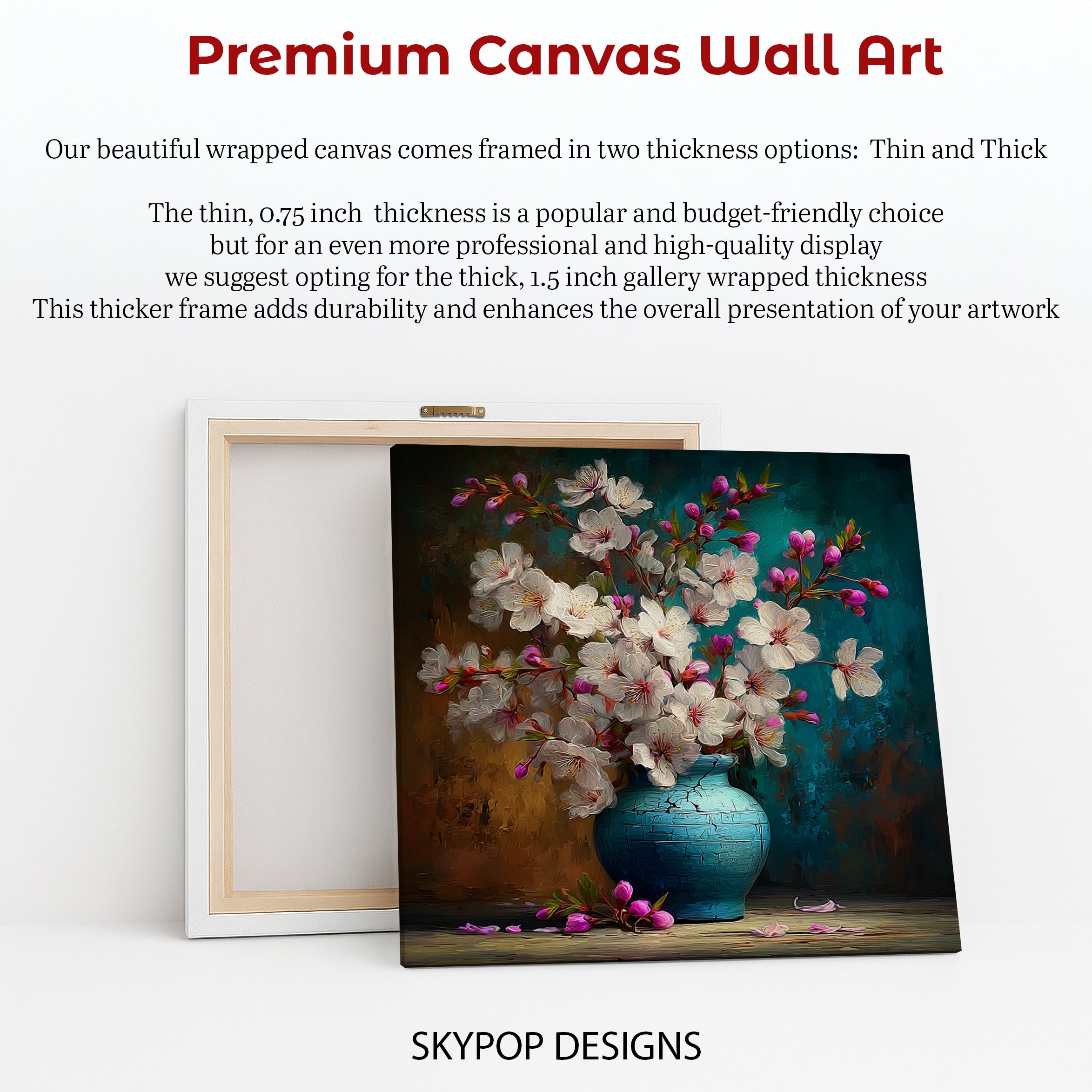 Elevate your home with this stunning canvas wall art, featuring a vibrant arrangement of cherry blossoms in a striking teal vase. This captivating piece of floral art captures the ephemeral beauty of spring, transforming any room into a tranquil sanctuary. The impressionistic style lends a painterly feel, creating a sophisticated focal point that enhances your modern or Scandinavian decor. Perfect for a living room, bedroom, or dining room, this poster or canvas wall art brings a touch of nature indoors with its delicate white and pink blossoms contrasted against a richly textured teal and brown background. Imagine walking into a space that feels inspired by the serene beauty of cherry blossoms; this artwork offers just that, infusing your home with a sense of calm and renewal. The use of color psychology in the teal and pink palette evokes feelings of peace and vitality, making it ideal for creating an uplifting atmosphere. This high-quality canvas wall art is also a thoughtful gift for housewarmings, birthdays, or holidays, bringing artistic elegance to any occasion. Its versatility in size means it can perfectly fit your desired wall space, whether you need a bold statement piece or a subtle accent. Showcase the beauty of nature in its finest form with this breathtaking floral wall art. Transform your living space today with the timeless appeal of this exquisite cherry blossom artwork.