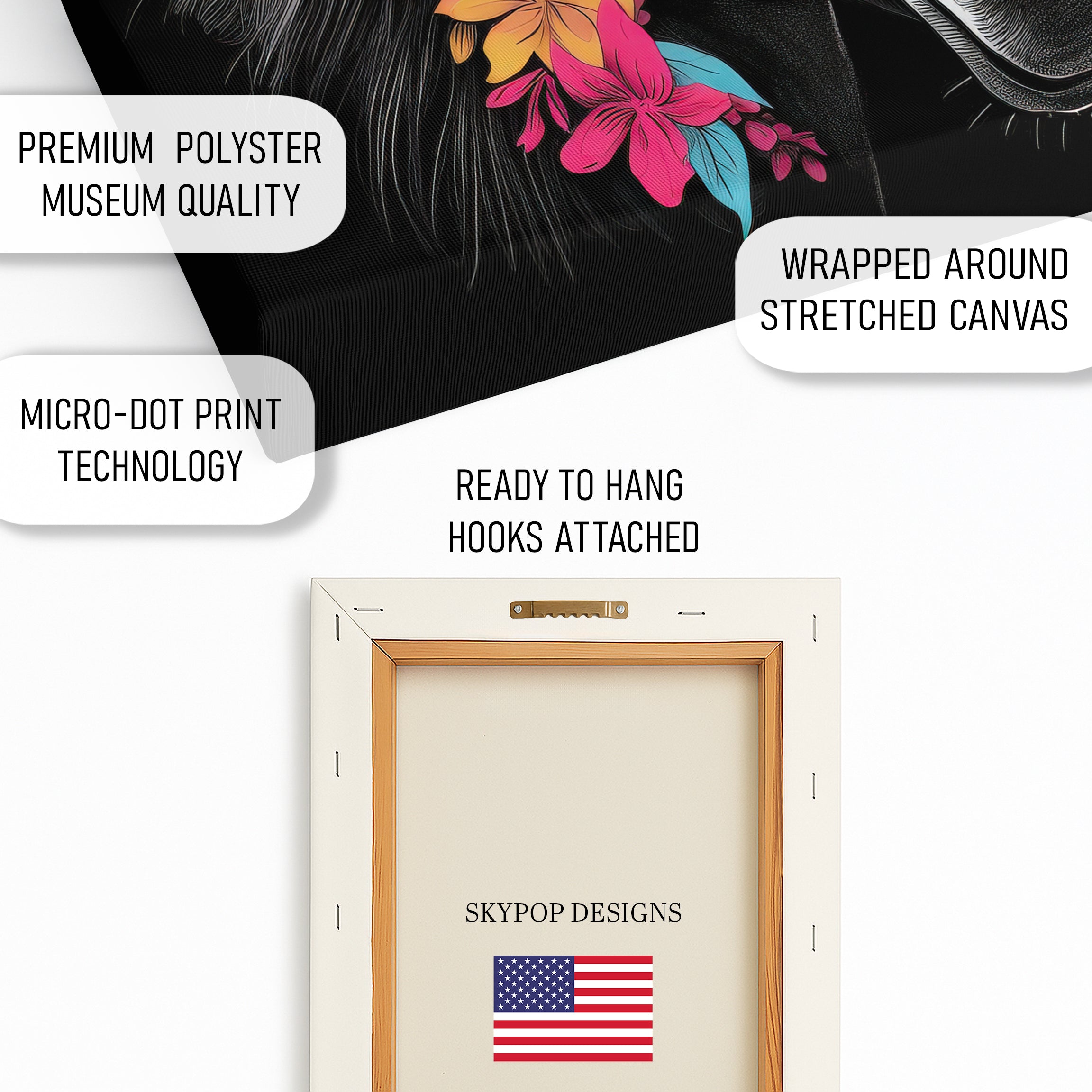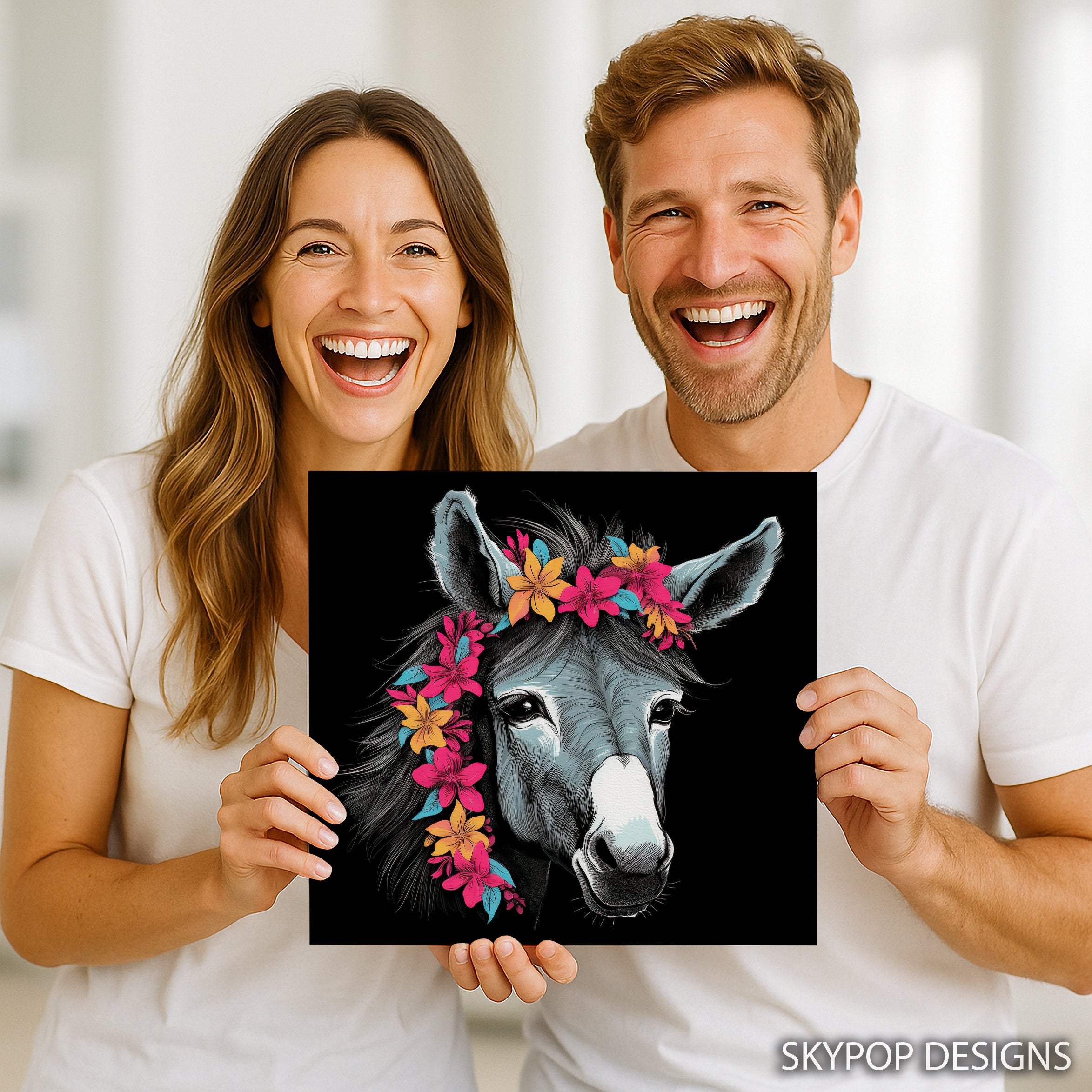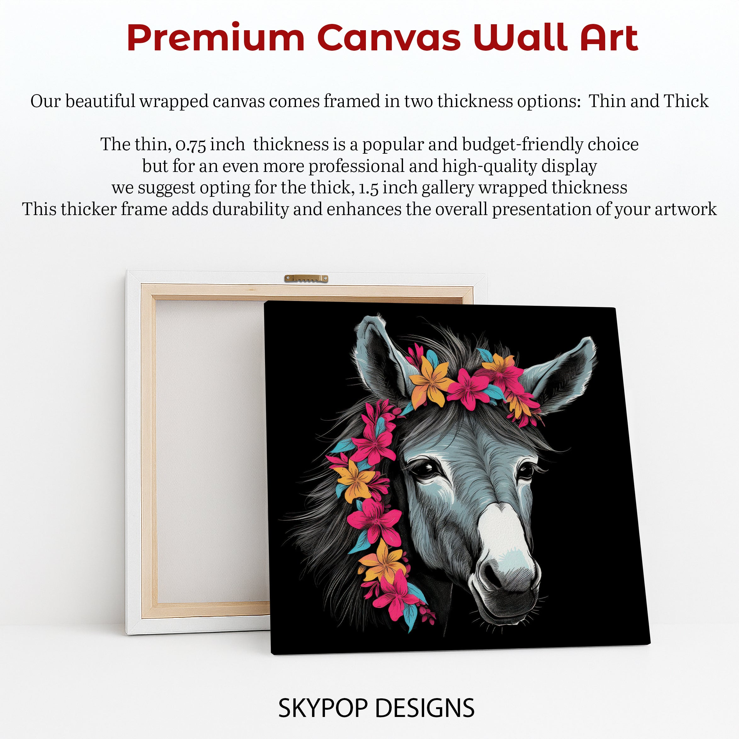 Transform your space with this captivating donkey canvas wall art featuring a whimsical donkey adorned with a vibrant floral crown. The striking pink, yellow, and teal flowers pop against the cool grey tones of the donkey and the dramatic black background, creating a visually stunning piece. This unique poster or canvas wall art blends animal art with a pop of nature's beauty, making it ideal for bohemian living rooms or eclectic bedrooms. The energetic colors symbolize joy and creativity, uplifting any atmosphere. Perfect for contemporary spaces seeking a touch of playful charm, this artwork also enhances modern entryways. Its striking contrast makes it a focal point that will be admired by all. This versatile canvas art works beautifully in children's rooms, adding a splash of personality and color. The detailed linework and bold color palette ensure this print stands out, making it a fantastic gift for birthdays or housewarmings. Elevate your home decor with this eye-catching donkey print that celebrates individuality and natural beauty. Discover the charm of unique wall art that sparks conversation and brings life to your walls today.