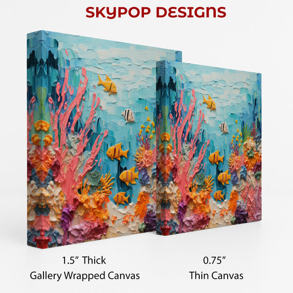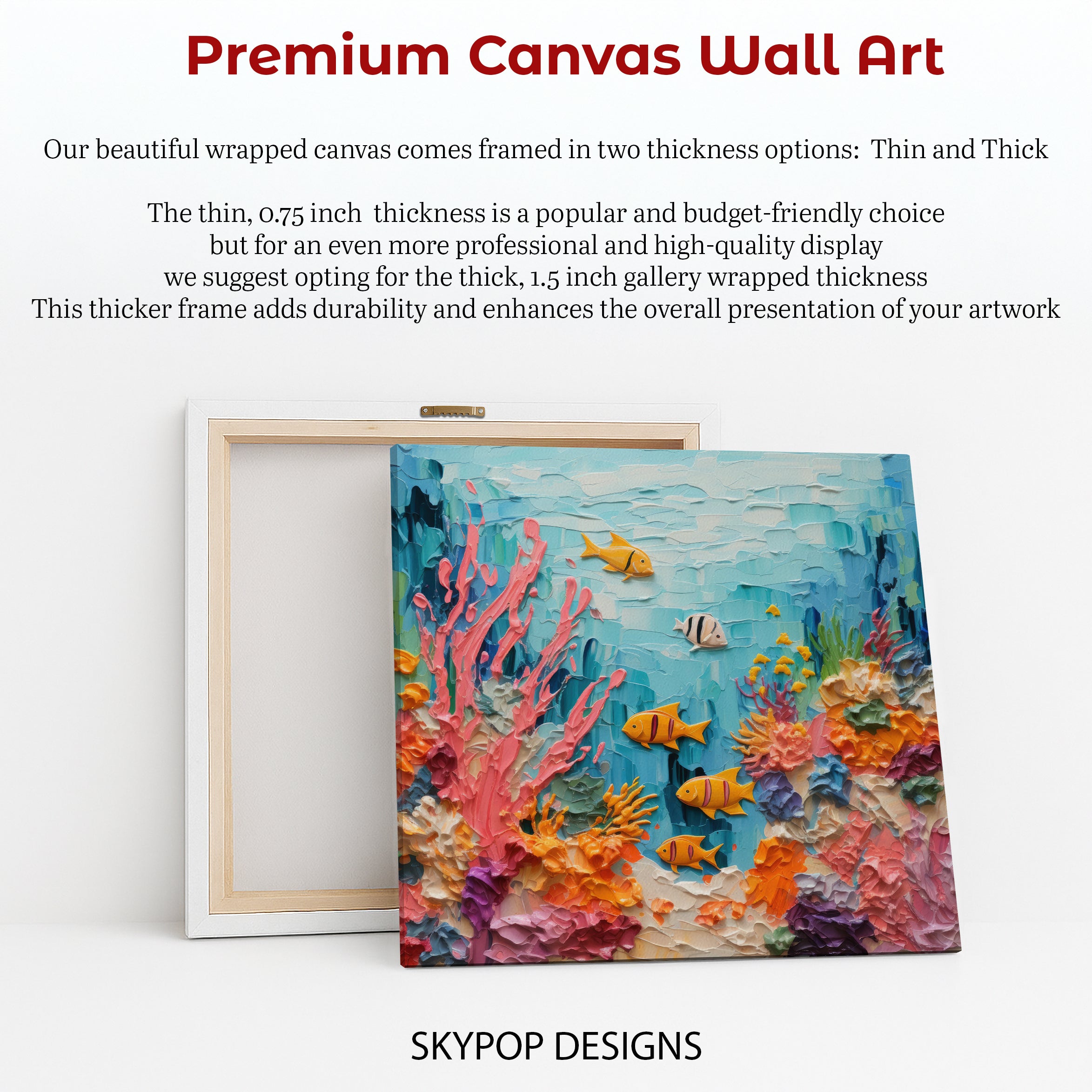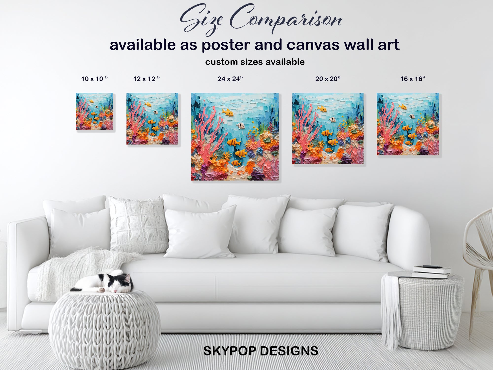Bring the vibrant underwater world into your home with this stunning coral reef fish canvas wall art. The textured brushstrokes and bold colors create a captivating visual that will transform any room. This eye-catching poster or canvas wall art showcases a lively school of fish swimming through a colorful coral reef, evoking a sense of tranquility and wonder. It is perfect for coastal-themed living rooms, relaxing bedrooms, or adding a splash of color to your sunroom. The striking multicolor palette of blues, oranges, and pinks instantly lifts the mood and brings the ocean's beauty indoors. This animal art piece is also an ideal gift for anyone who loves the sea or is looking for unique wall decor. Imagine the calming energy this canvas print will bring to your space, making it feel like a serene escape. The rich textural detail of this poster ensures it grabs attention and inspires conversation. Enhance your home decor with this breathtaking underwater scene that celebrates the diversity of marine life. This versatile wall art is available in various sizes, making it easy to find the perfect fit for your space. Add a touch of oceanic magic to your home and create a vibrant focal point with this exquisite coral reef canvas art.