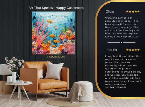 Keywords: Abstract Art, Nature Art, Animal Art, Bohemian Decor, Coastal Decor, Modern Decor, Living Room Art, Bedroom Decor, Bathroom Wall Art, Sunroom Decor, Multicolor Art, Blue Wall Art, Orange Art, Pink Abstract, Fish Wall Art, Coral Reef Art, Underwater Scene, Vibrant Canvas, Textured Brushstrokes, Captivating Visuals, Coastal Theme, Relaxing Bedroom, Splash of Color, Ocean Beauty, Unique Wall Decor, Sea Lover Gift, Calming Energy, Serene Escape, Marine Life Art, Home Decor Enhancement