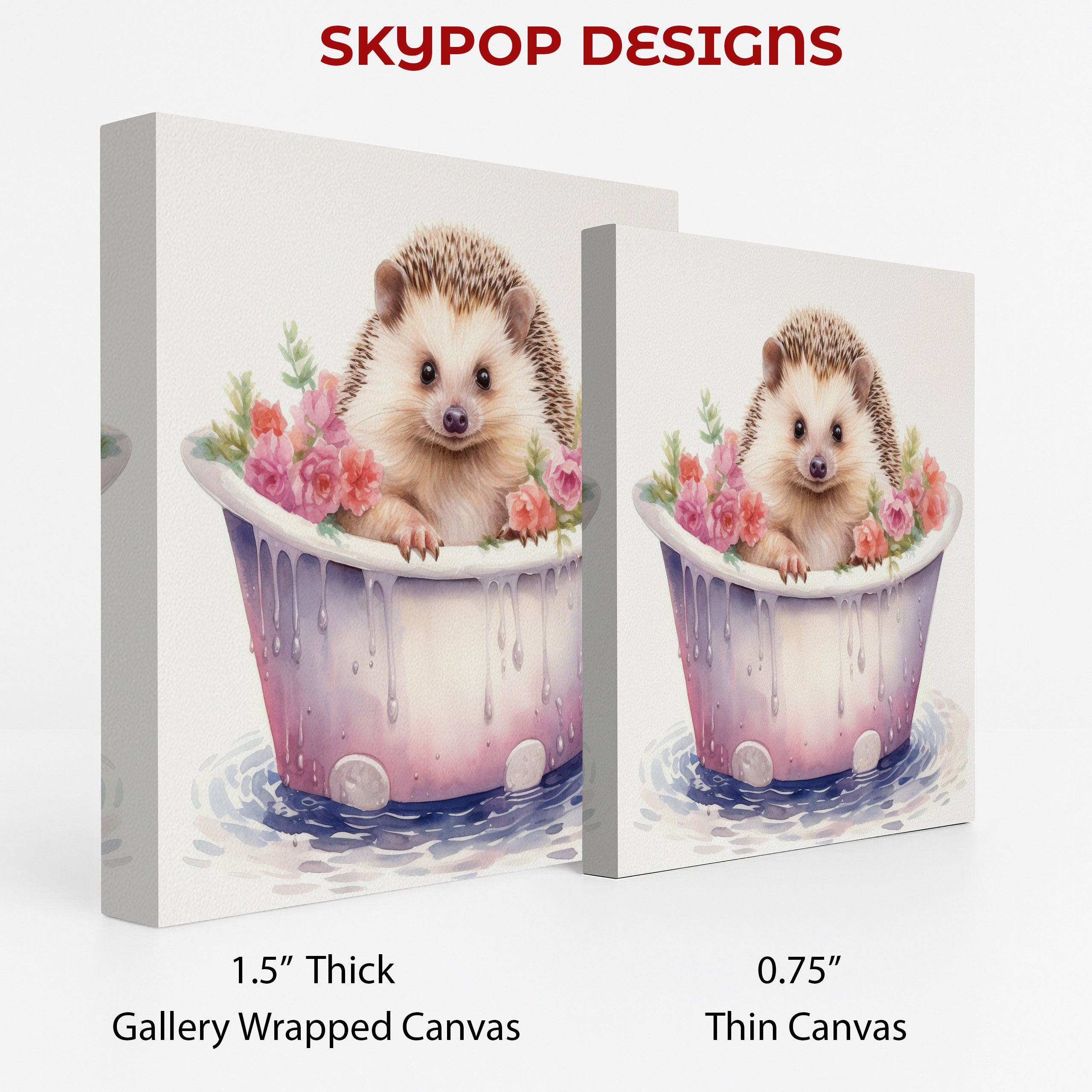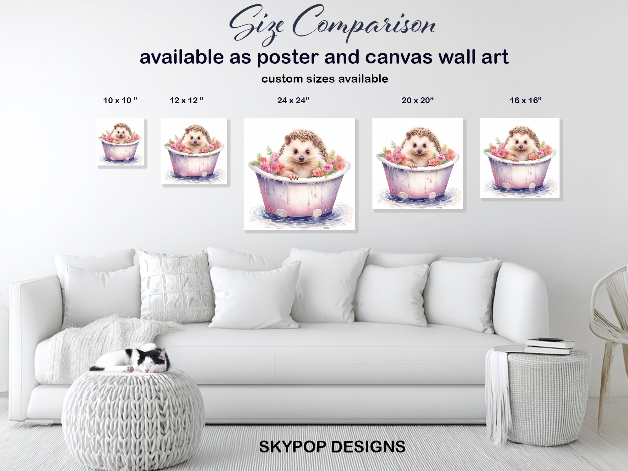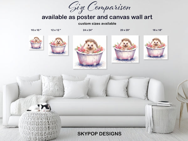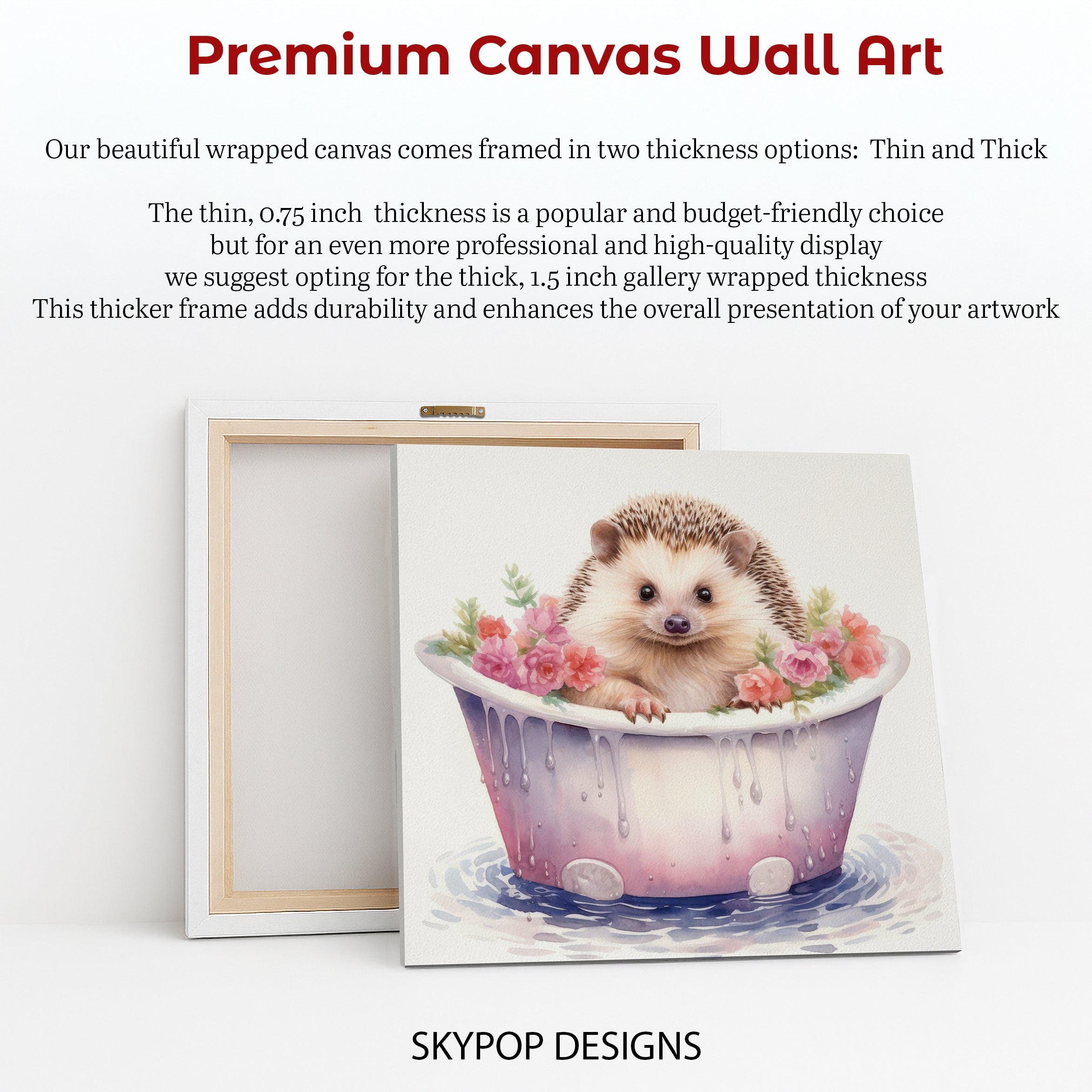 Transform your space with this adorable hedgehog canvas wall art, featuring a sweet hedgehog relaxing in a flower-filled bathtub. The delicate watercolor style and vibrant floral accents create a charming and captivating focal point, perfect for any room. This delightful poster or canvas wall art brings a touch of whimsy and nature's beauty into your home, making it an ideal choice for children's rooms, cozy bedrooms, or even a fresh touch in the bathroom.