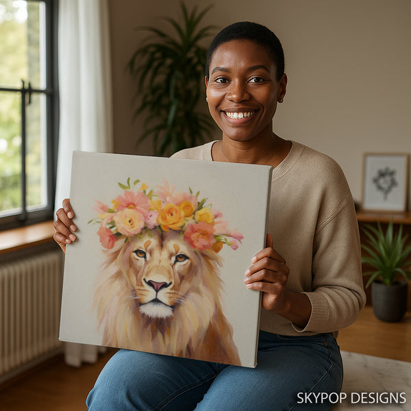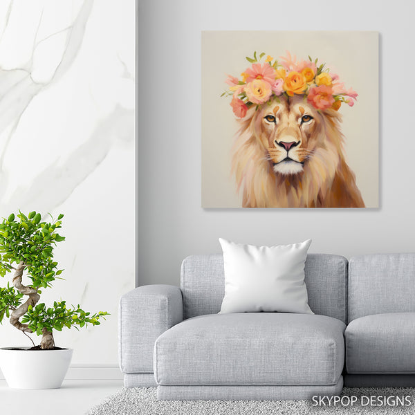 Keywords: Lion Wall Art, Floral Crown Lion, Canvas Wall Art, Animal Art, Nature Art, Contemporary Art, Bohemian Decor, Modern Decor, Glam Decor, Living Room Art, Bedroom Decor, Entryway Art, Office Wall Art, Beige Art, Multicolor Art, Pink Art, Yellow Art, Wildlife Art, Regal Art, Statement Piece, Home Decor, Wall Decor, Art Print, Floral Art, Majestic Lion, Gift for Art Lover, Birthday Gift, Housewarming Gift, Creative Decor, Joyful Art