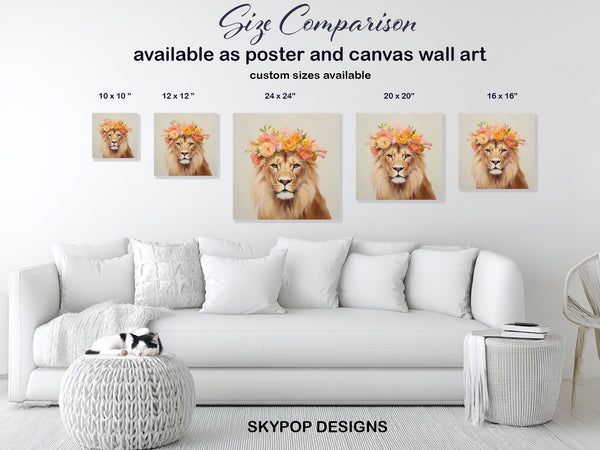 Lion Floral Crown Art, Canvas or Poster, Bohemian Modern Glam Decor, Living Room Bedroom Entryway Office Art, Beige Pink Yellow Multicolor