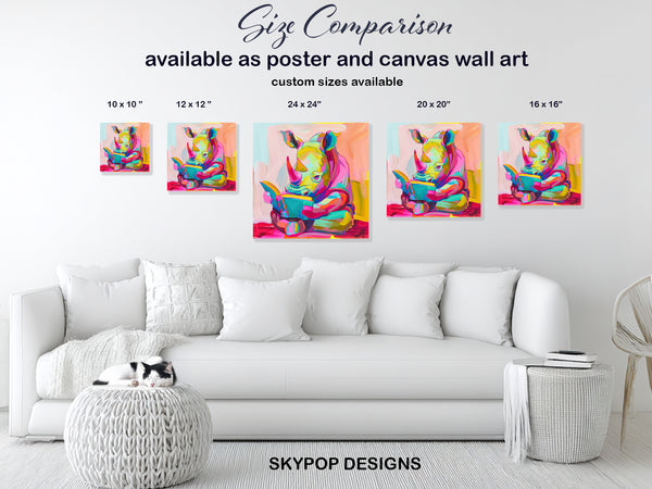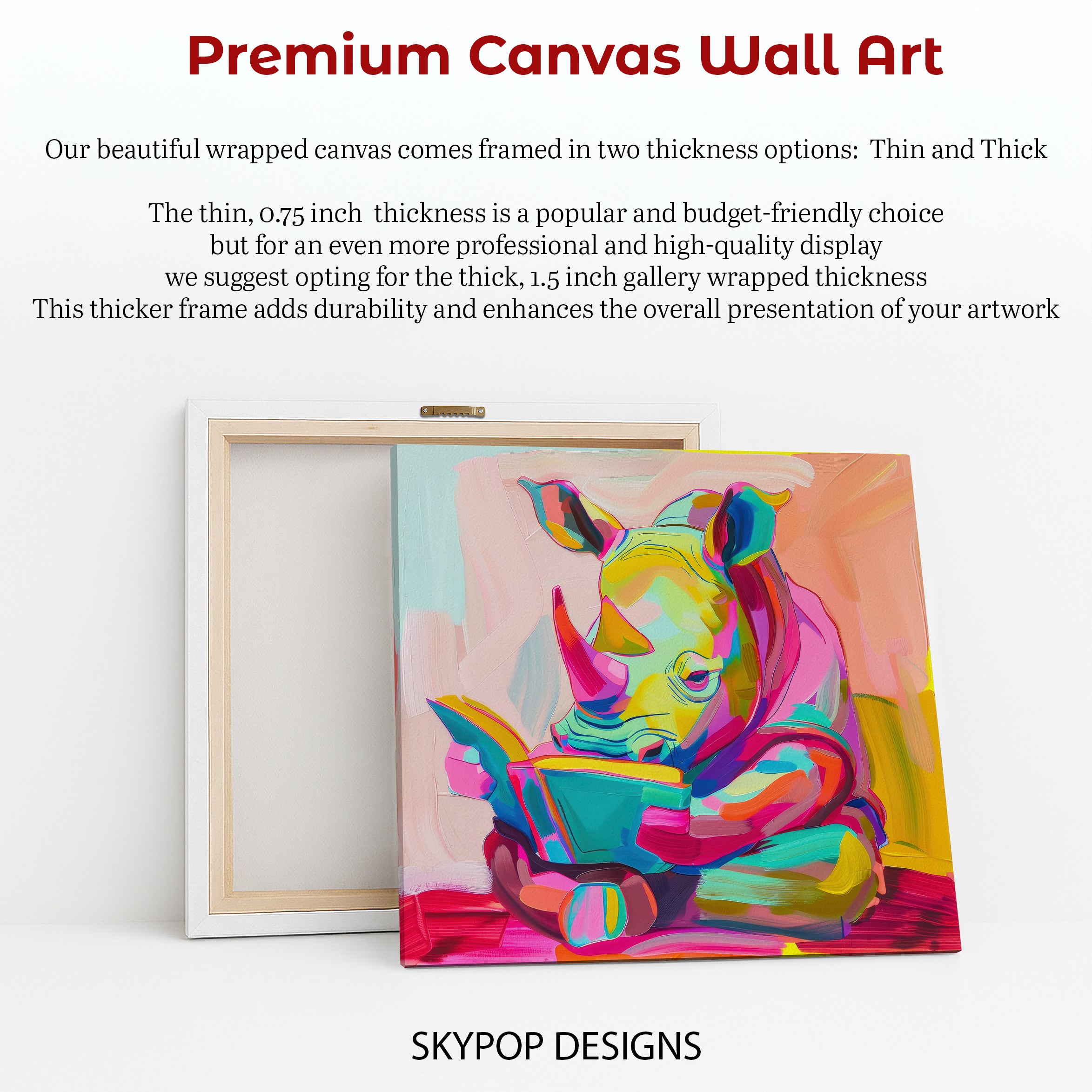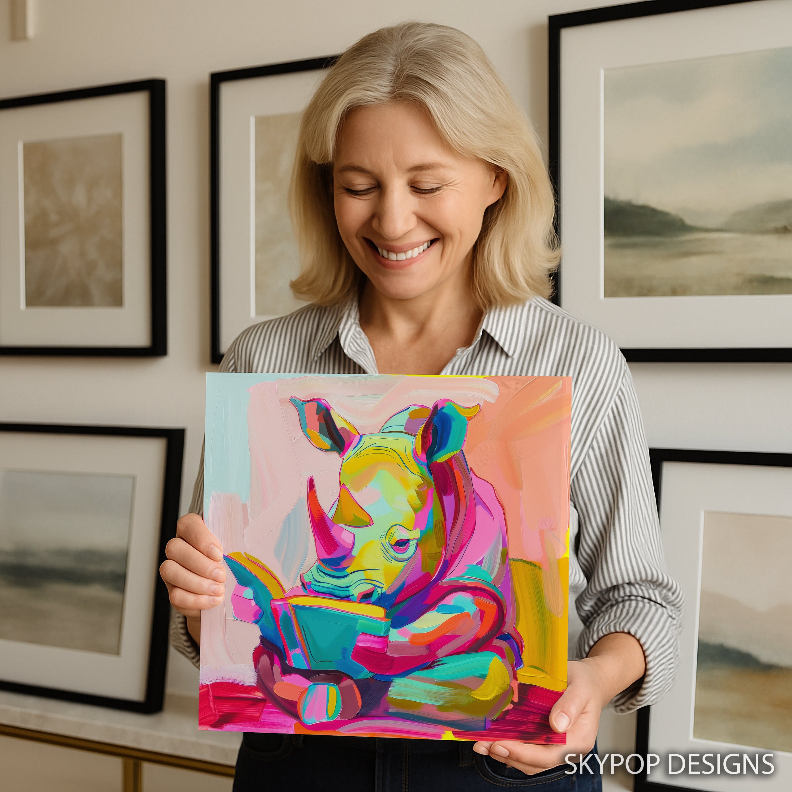 Keywords: Abstract Rhino Art, Contemporary Wall Art, Animal Art Print, Reading Rhino Decor, Multicolor Canvas Art, Pink Yellow Teal Art, Modern Home Decor, Bohemian Wall Decor, Minimalist Art Piece, Living Room Art, Bedroom Wall Art, Office Decor, Entryway Art, Statement Wall Art, Unique Artwork, Vibrant Home Decor, Bold Brushstrokes, Expressive Color, Joyful Art, Intellectual Curiosity, Gift for Book Lovers, Gift for Animal Enthusiasts, Home Art Collection, Canvas Wall Hanging, Rhino Poster, Modern Art Style, Bohemian Decor, Contemporary Art, Animal Lover Gift, Creative Decor