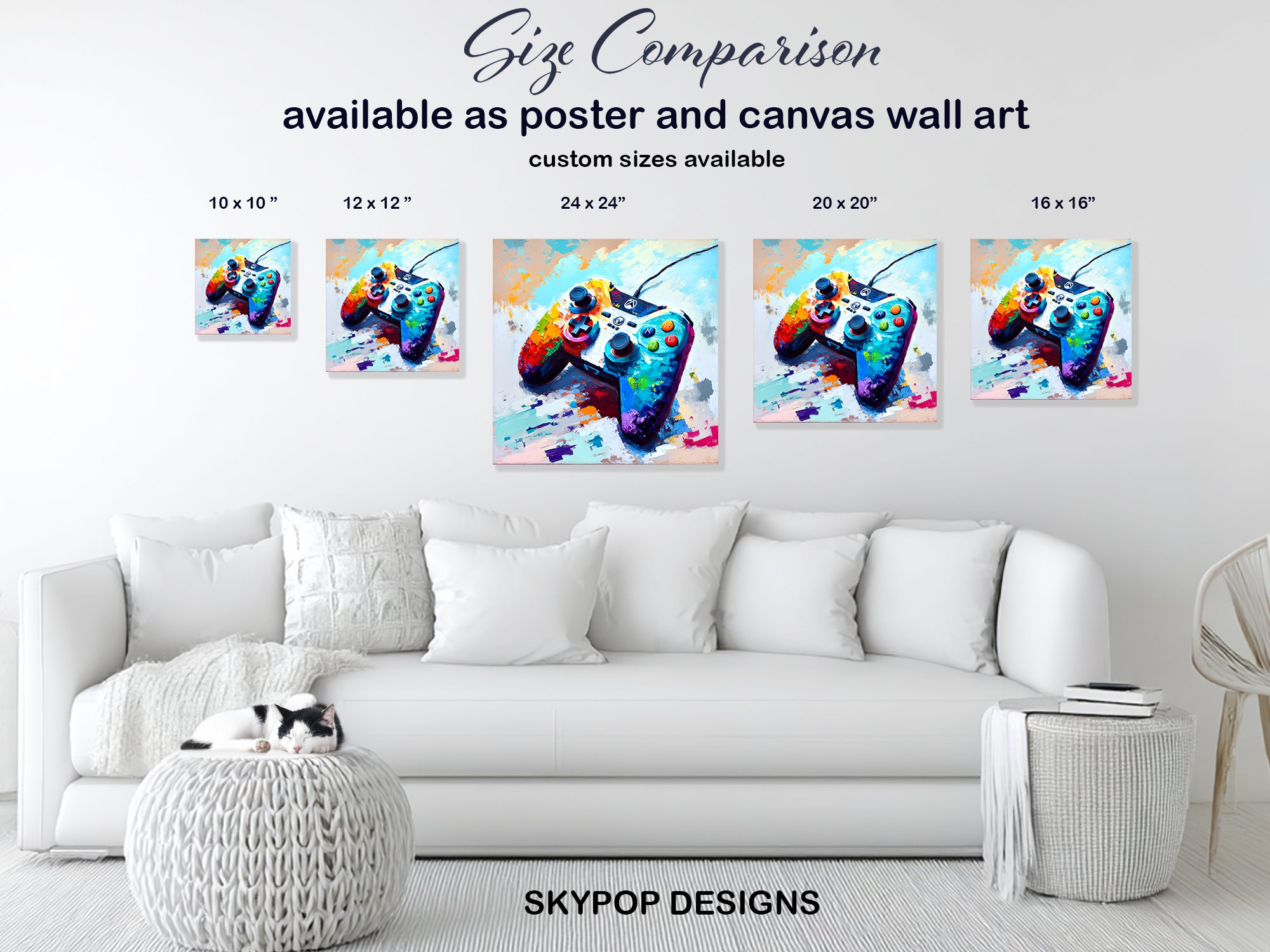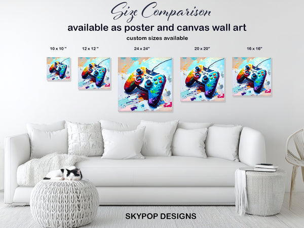 Transform your space with this vibrant gaming controller canvas wall art, a perfect fusion of pop art and contemporary design. This striking poster features a dynamic explosion of colors applied with thick, textured brushstrokes, bringing an energetic and abstract feel to your walls. The multicolor palette, dominated by blues, reds, and yellows, creates a captivating visual that celebrates the excitement of gaming. Ideal for modern living rooms or dedicated game rooms, this piece will elevate your decor and showcase your passion for interactive entertainment. The bold style makes it a fantastic focal point, adding personality and a touch of modern flair to any room. This canvas wall art is also a great gift for gamers on birthdays or holidays, bringing a splash of color and artistic expression to their space. The high-quality printing captures the painterly texture, making this poster a standout piece of gamer wall art. Enhance your home theater or office with this visually stimulating artwork that inspires creativity and fun. Elevate your interior design with this unique blend of abstract art and pop culture. This versatile piece complements various decor styles, from contemporary to minimalist, and makes a statement in any setting. Inject a lively atmosphere into your home with this exceptional canvas print, a true testament to modern art and gaming culture.