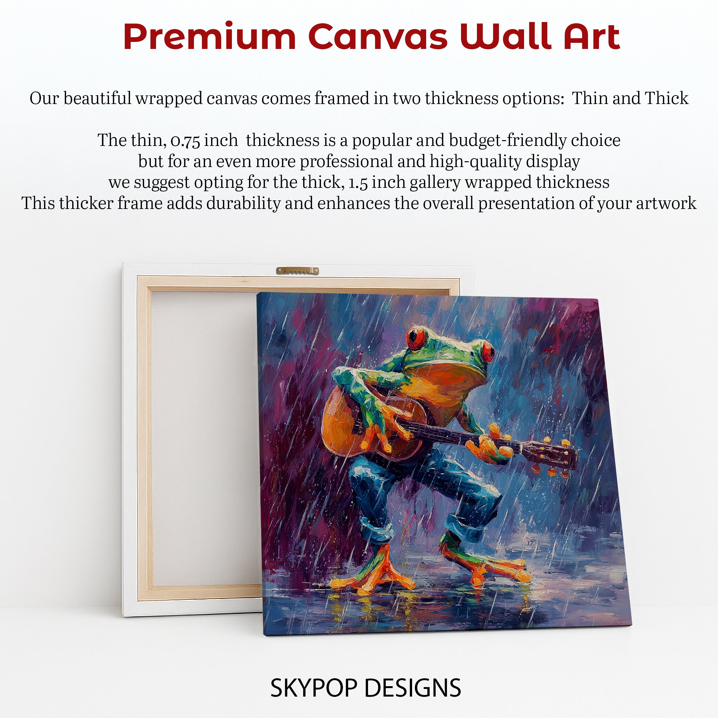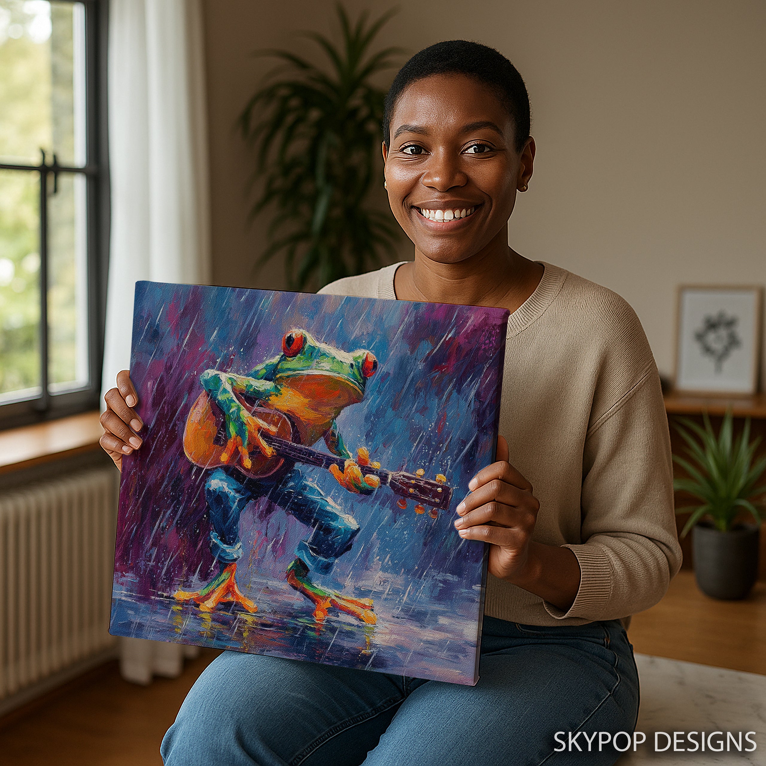 Transform your space with this vibrant frog canvas wall art, showcasing a whimsical frog playing a guitar in the rain. This striking poster or canvas wall art combines bold, expressive brushstrokes with a playful subject, creating a captivating focal point for any room. The rich blues, purples, and greens create a moody yet energetic atmosphere, perfect for a modern living room or a fun game room. Whether you choose a poster or canvas format, this artwork adds personality and charm. It's an ideal piece for those who appreciate unique animal art and contemporary decor. The dynamic composition and lively colors bring a sense of movement and joy, making this canvas wall art a conversation starter. Enhance your home with this eye-catching piece, perfect for adding a touch of quirkiness to a home bar or a child's room. It also makes a fantastic gift for music lovers or anyone who enjoys delightful animal-themed decor. Elevate your wall decor with this unique and inspiring piece that celebrates the unexpected joy of a rainy day. This high-quality canvas artwork is sure to bring a smile to your face and add a vibrant splash of color to your home. Add this distinctive frog poster to your art collection and let it bring a touch of musical magic to your space. Celebrate individuality and artistic expression with this stunning piece of wall art.