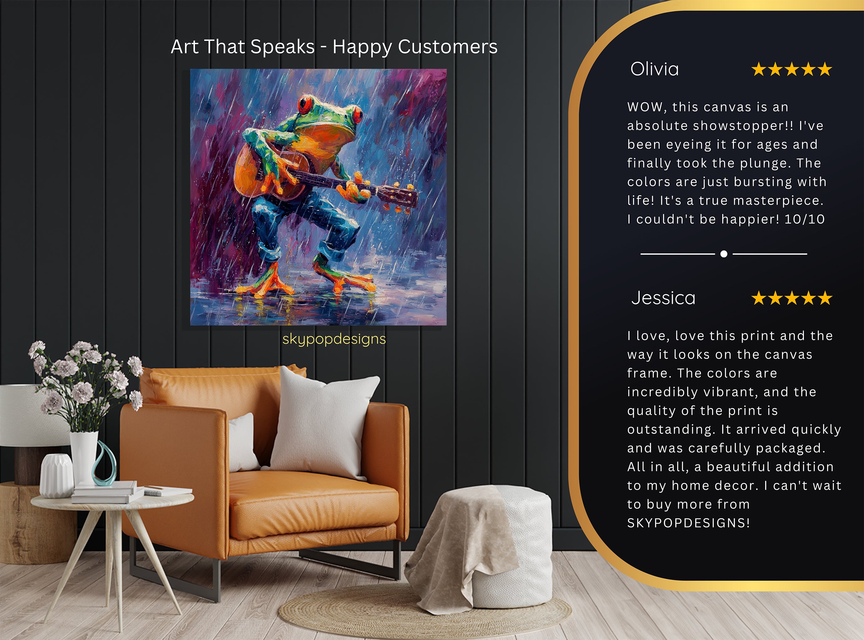 Keywords: Guitar Frog Art, Frog Wall Art, Animal Art, Animal Poster, Canvas Wall Art, Blue Wall Art, Multicolor Art, Purple Art, Green Art, Contemporary Art, Whimsical Art, Bohemian Decor, Modern Decor, Living Room Art, Children's Room Decor, Game Room Poster, Bar Decor, Music Lover Gift, Unique Wall Art, Frog Poster, Rain Art, Expressive Brushstrokes, Playful Art, Home Decor, Wall Decor, Art Collection, Musical Magic, Artistic Expression, Vibrant Art, Eye-Catching Art
