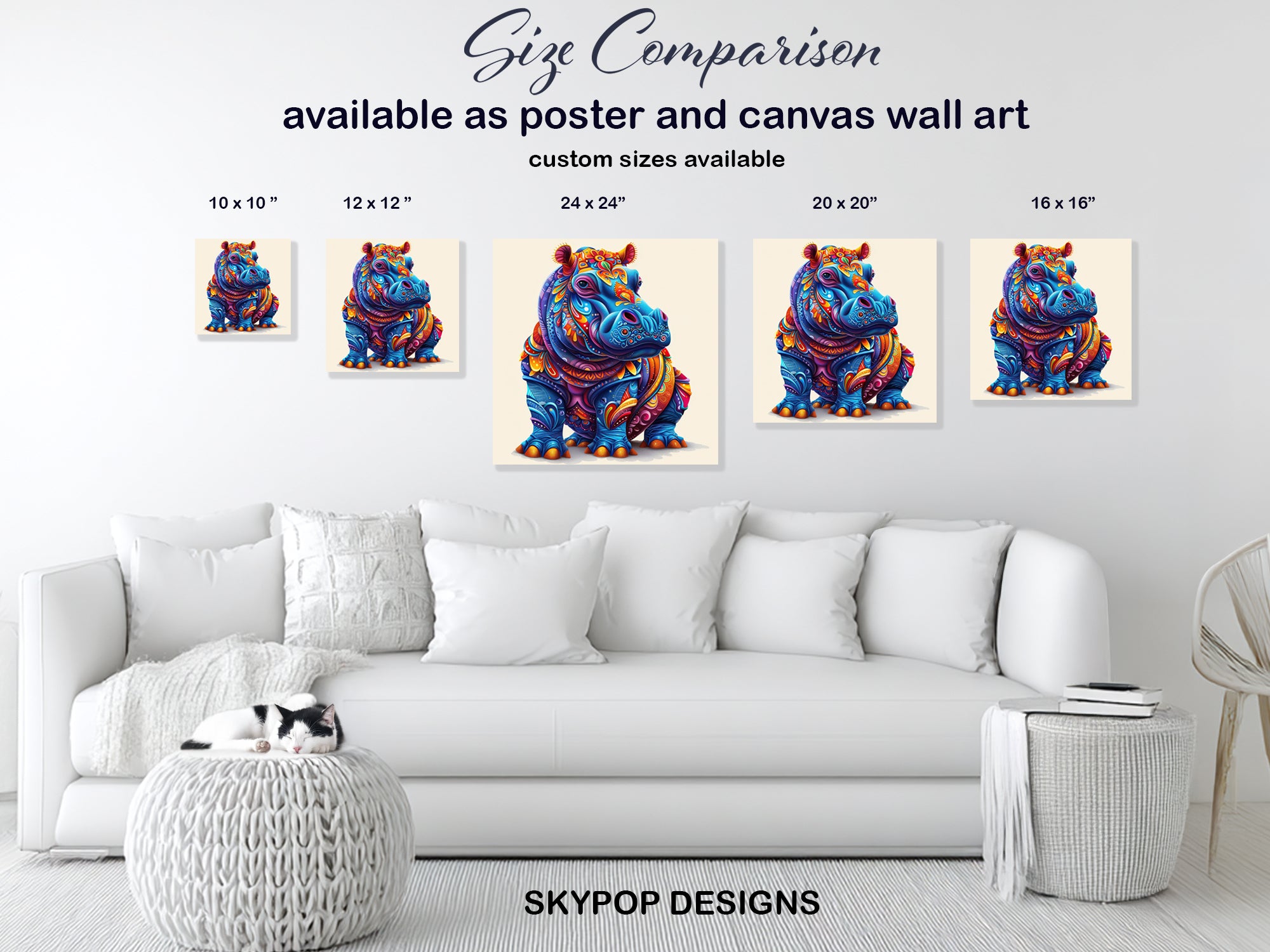 Hippopotamus Art, Canvas or Poster, Pop Art Bohemian Decor, Living Room Bedroom Dining Room Entryway Wall Art, Multicolor Blue Orange Purple