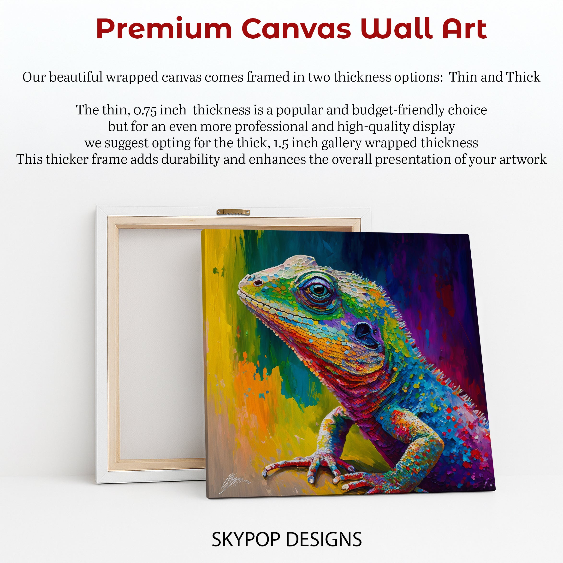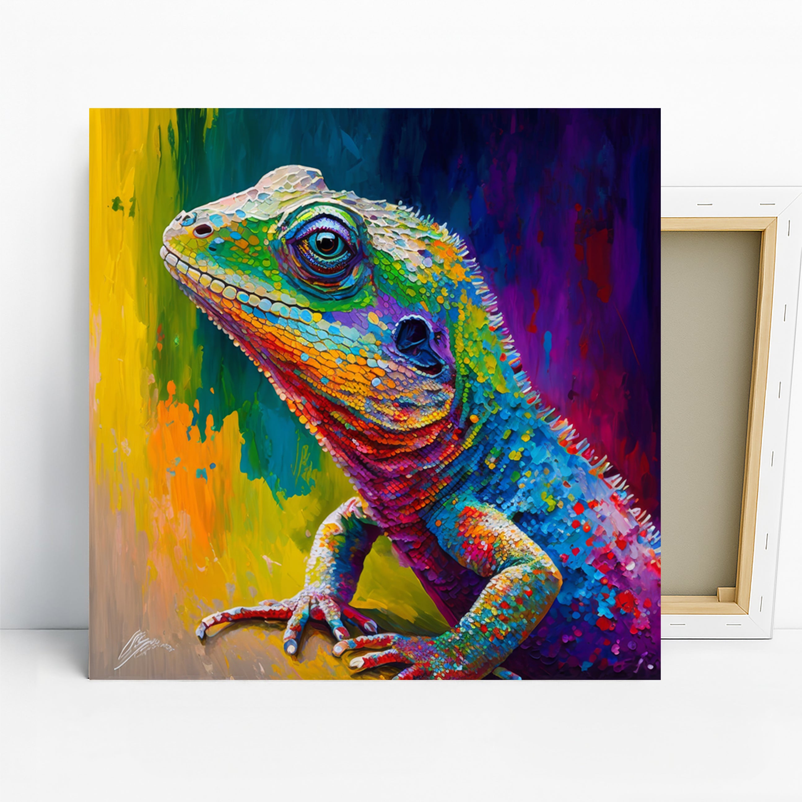 Transform your space with captivating lizard canvas wall art that bursts with a symphony of colors; this striking poster is perfect for adding a splash of vibrant energy to any modern living room or eclectic bohemian bedroom. The abstract strokes and bold hues of blue, yellow, and purple create a mesmerizing focal point, making this animal art piece a conversation starter. Elevate your home decor with this unique lizard print, ideal for offices or entryways seeking a touch of wild inspiration and contemporary flair. The rich, multicolor palette will enhance the mood and bring a sense of joyful vibrancy into your daily life. This canvas wall art showcases the intricate details of the lizard in a bold, painterly style, making it a stand-out addition to any art collection. Whether you're looking for modern wall decor or unique animal-themed art, this piece delivers exceptional visual appeal. It serves as a perfect gift for art lovers, animal enthusiasts, or as a housewarming present to brighten someone's new space. The high-quality printing ensures the vivid colors and textures are beautifully preserved, offering a stunning visual experience. This versatile poster or canvas wall art adapt effortlessly to various decor styles, adding personality and warmth. Celebrate the beauty of nature with this dynamic and eye-catching piece of wall art. Elevate your home's aesthetic and bring a piece of this colorful world into your sanctuary today with this remarkable lizard artwork.