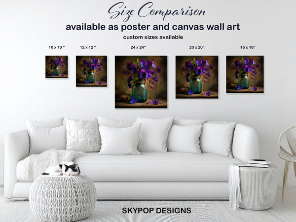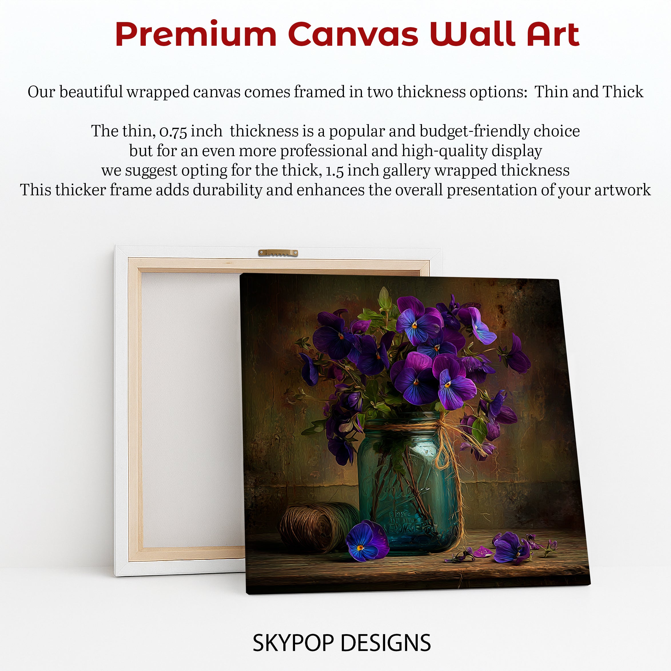 Pansy Jar Art, Canvas or Poster, Still Life Country Decor, Living Room Bedroom Kitchen Dining Room Wall Art, Purple Teal Brown Multicolor