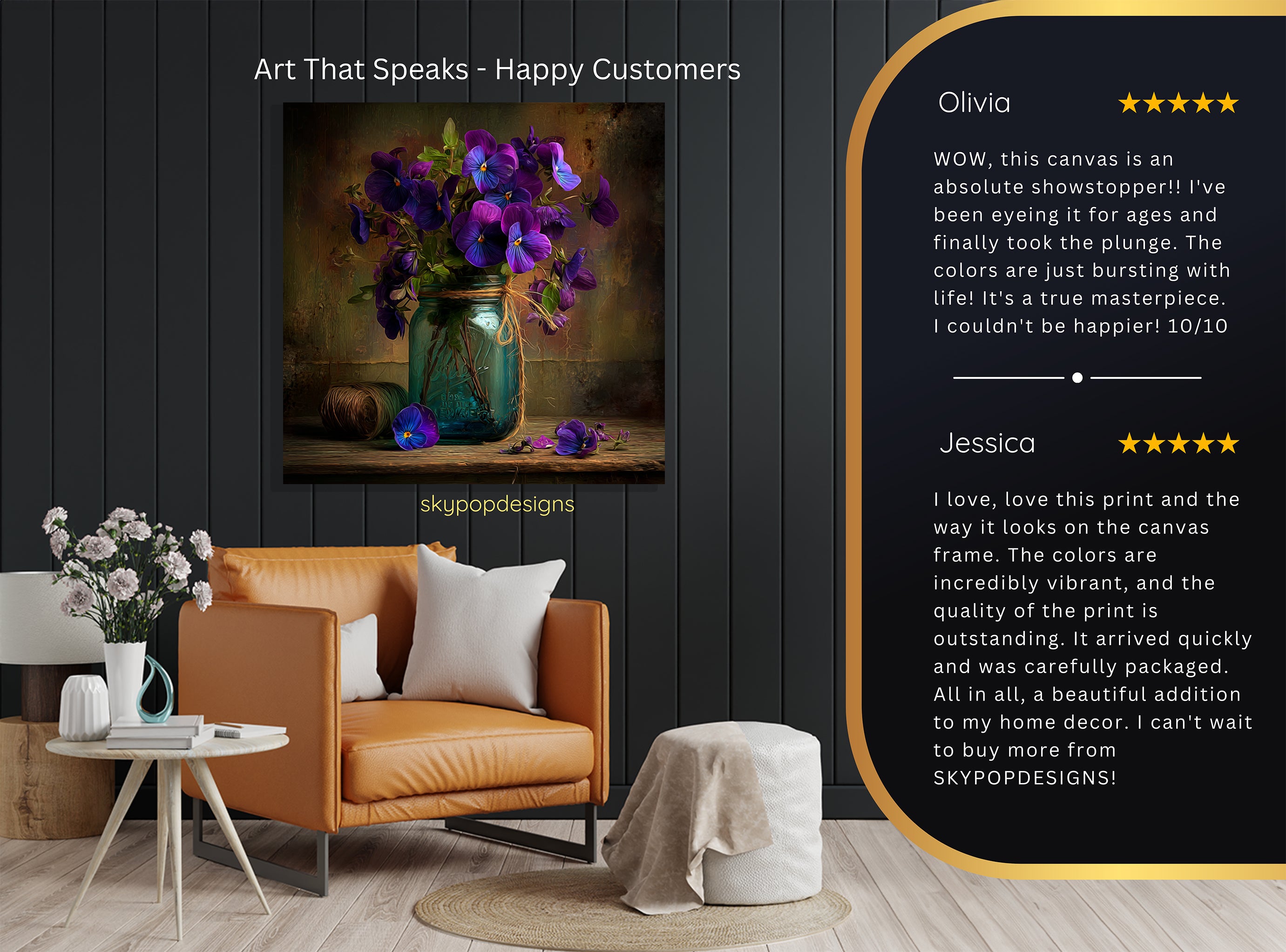 Keywords: Impressionism Art, Nature Art, Still Life Art, Country Decor, Farmhouse Decor, Rustic Decor, Shabby Chic Decor, Living Room Art, Bedroom Art, Kitchen Art, Dining Room Art, Purple Art, Teal Art, Brown Art, Multicolor Art, Pansy Wall Art, Vintage Pansy Jar, Canvas Wall Art, Home Decor, Wall Decor, Floral Art, Vintage Art, Housewarming Gift, Birthday Gift, Holiday Gift, Nature Inspired, Country Charm, Rustic Charm, Flower Art, Cozy Atmosphere