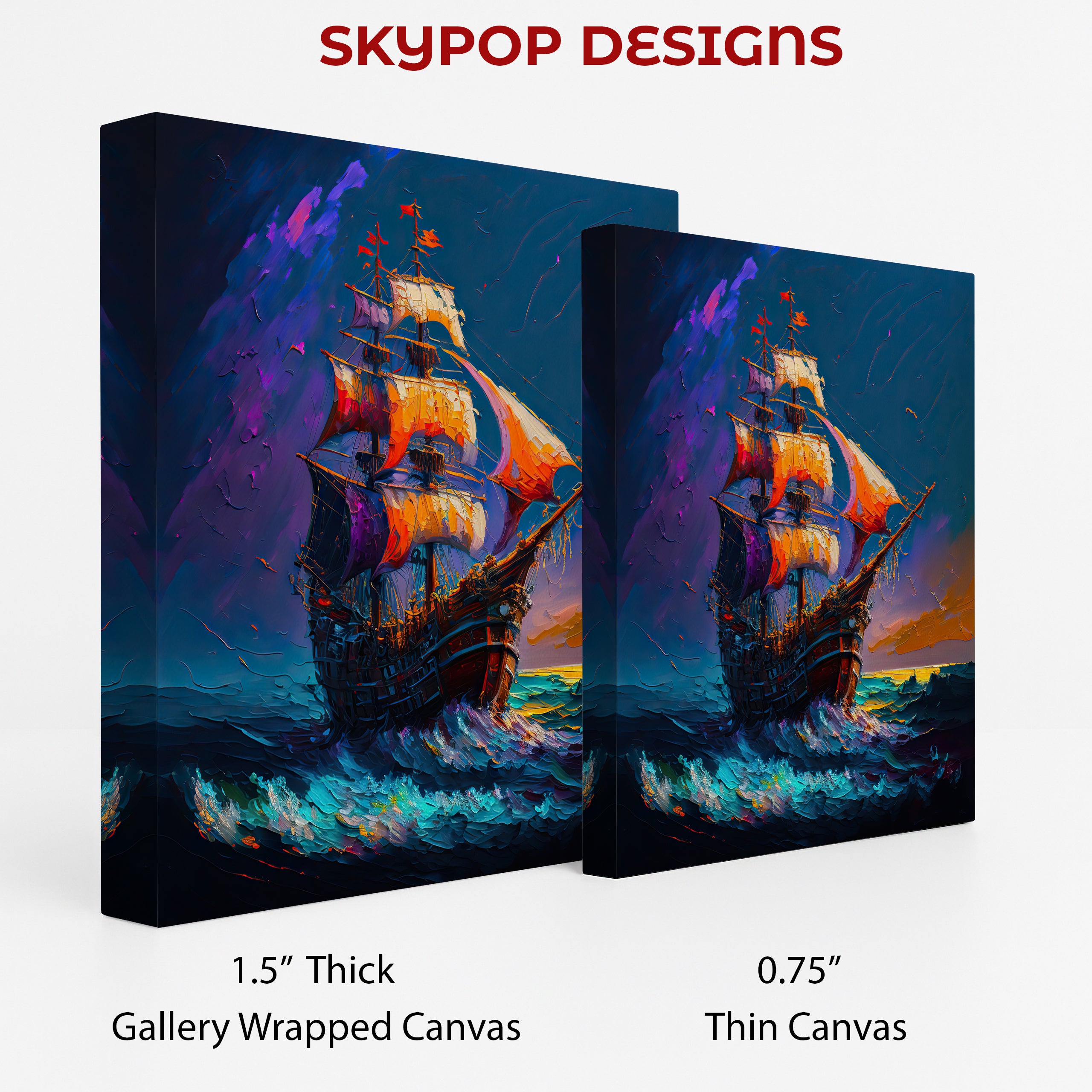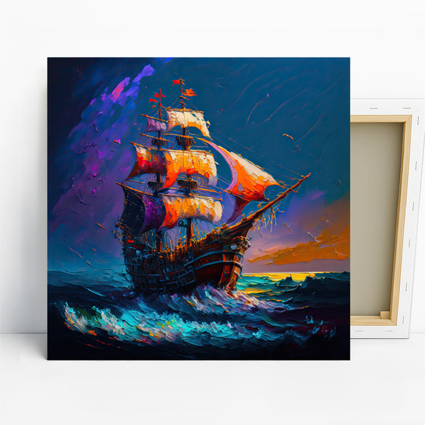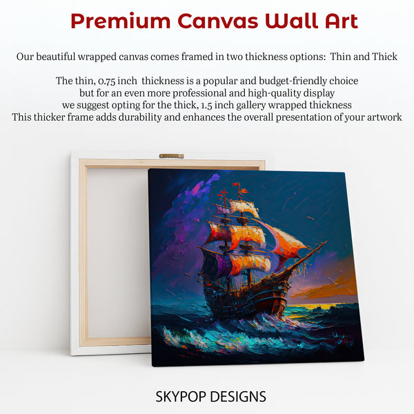 Transform your space with this captivating pirate ship canvas wall art, showcasing a magnificent vessel navigating stormy seas under a dramatic, colorful sky. This striking poster brings the allure of adventure and distant lands right into your home, perfect for igniting imagination and conversation. The vibrant blues, oranges, and purples create a dynamic, almost abstract feel, making this canvas wall art a standout piece in any contemporary or bohemian-inspired room. Elevate your living room, office, or game room with this unique artwork that embodies freedom and exploration. The bold brushstrokes and rich color palette bring the scene to life, offering a dramatic focal point that enhances any decor. Ideal for those who love nautical themes or appreciate expressive, modern wall art. This versatile poster provides a stunning visual experience, whether you're looking for a bold statement piece or a gift for a fellow adventurer. Printed on high-quality canvas, this artwork ensures lasting beauty and impact, making it a perfect addition to collections seeking a touch of the extraordinary. Celebrate the spirit of the open sea and captivating journeys with this exceptional canvas wall art. Enhance your home’s aesthetic and inspire a sense of wonder with this breathtaking piece of wall decor today.