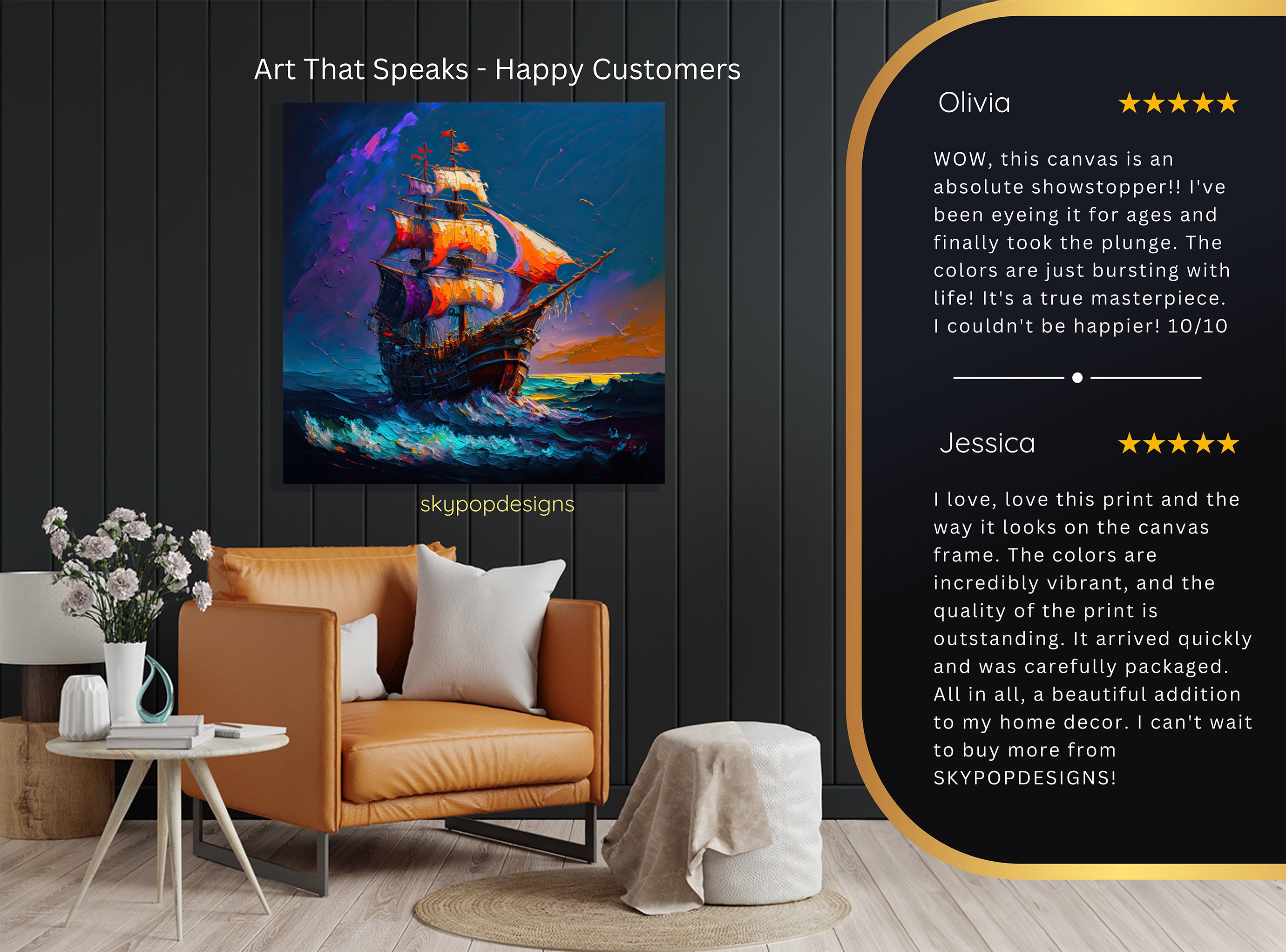 At SKYPOPDESIGNS, we specialize in high-quality canvas and poster prints designed to bring sophistication and style to your space. Please note that our designs are not created with 3D textures or as original oil, acrylic, or watercolor paintings; they are instead HD reproductions of original artwork. This approach allows us to offer these visually stunning pieces at competitive prices, ensuring you receive top-tier, maintenance-free art that's easy to enjoy.