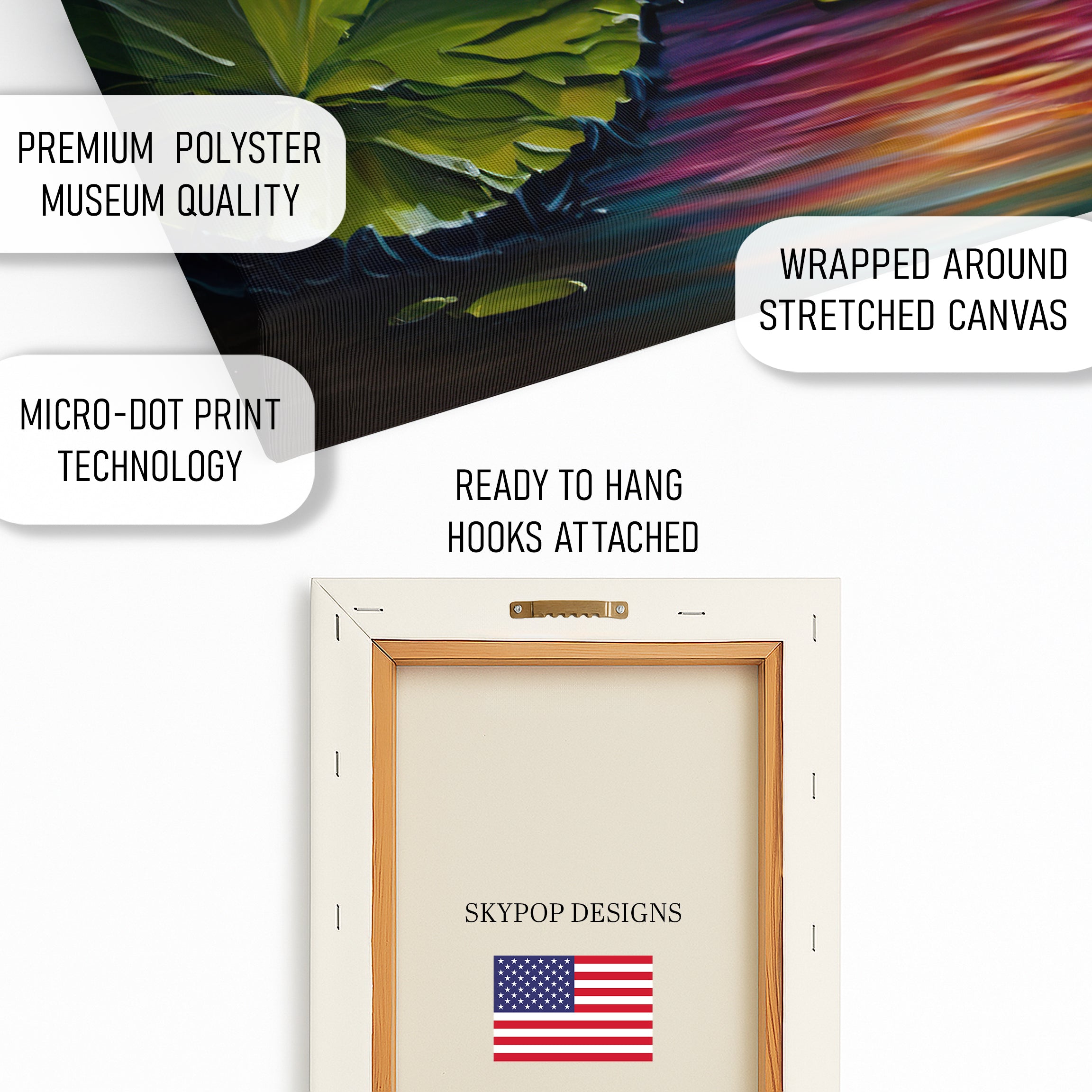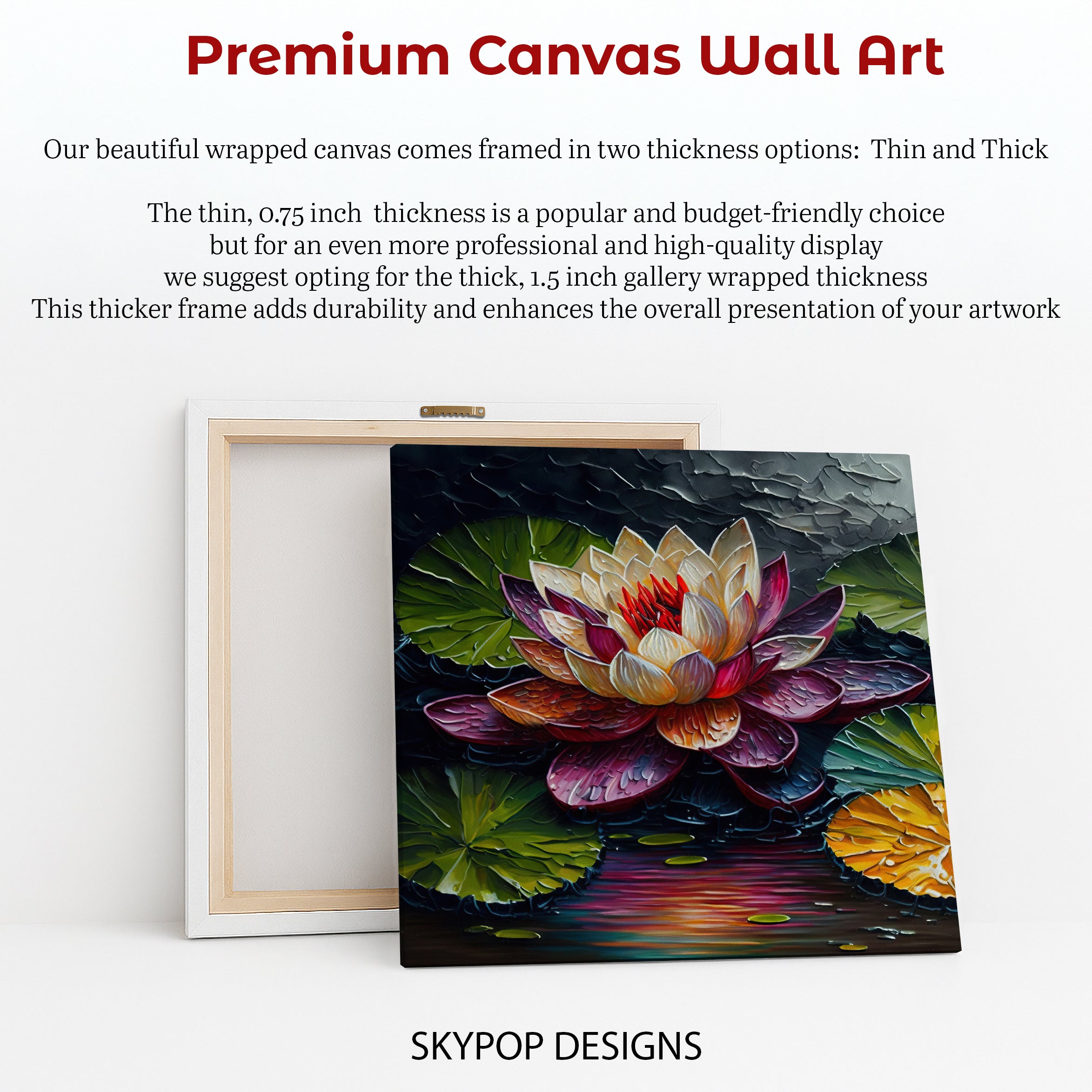 Keywords: water lily art, canvas wall art, nature art, still life art, impressionism art, bohemian decor, contemporary decor, modern decor, living room art, bedroom art, dining room art, entryway art, multicolor art, green art, purple art, yellow art, pond art, floral art, wall decor, home decor, wall poster, textured art, vibrant colors, art for home, housewarming gift, birthday gift, holiday gift, peaceful art, tranquil art, art print