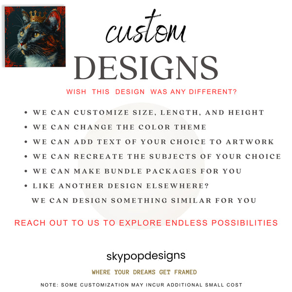 Keywords: cat art, animal print, wall art, canvas art, pop art decor, contemporary art, modern decor, glam decor, bohemian decor, living room art, bedroom art, office decor, game room art, multicolor art, gold accents, black and red art, regal cat art, cat with crown, pet portraits, wall decor, home decor, statement art, unique art, gift for cat lovers, birthday gift, housewarming gift, holiday gift, sophisticated art, luxury home decor, colorful wall art