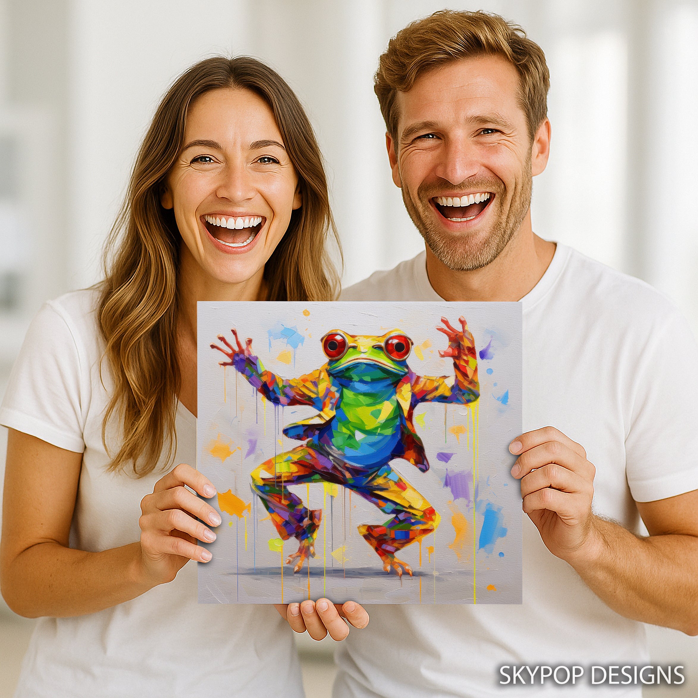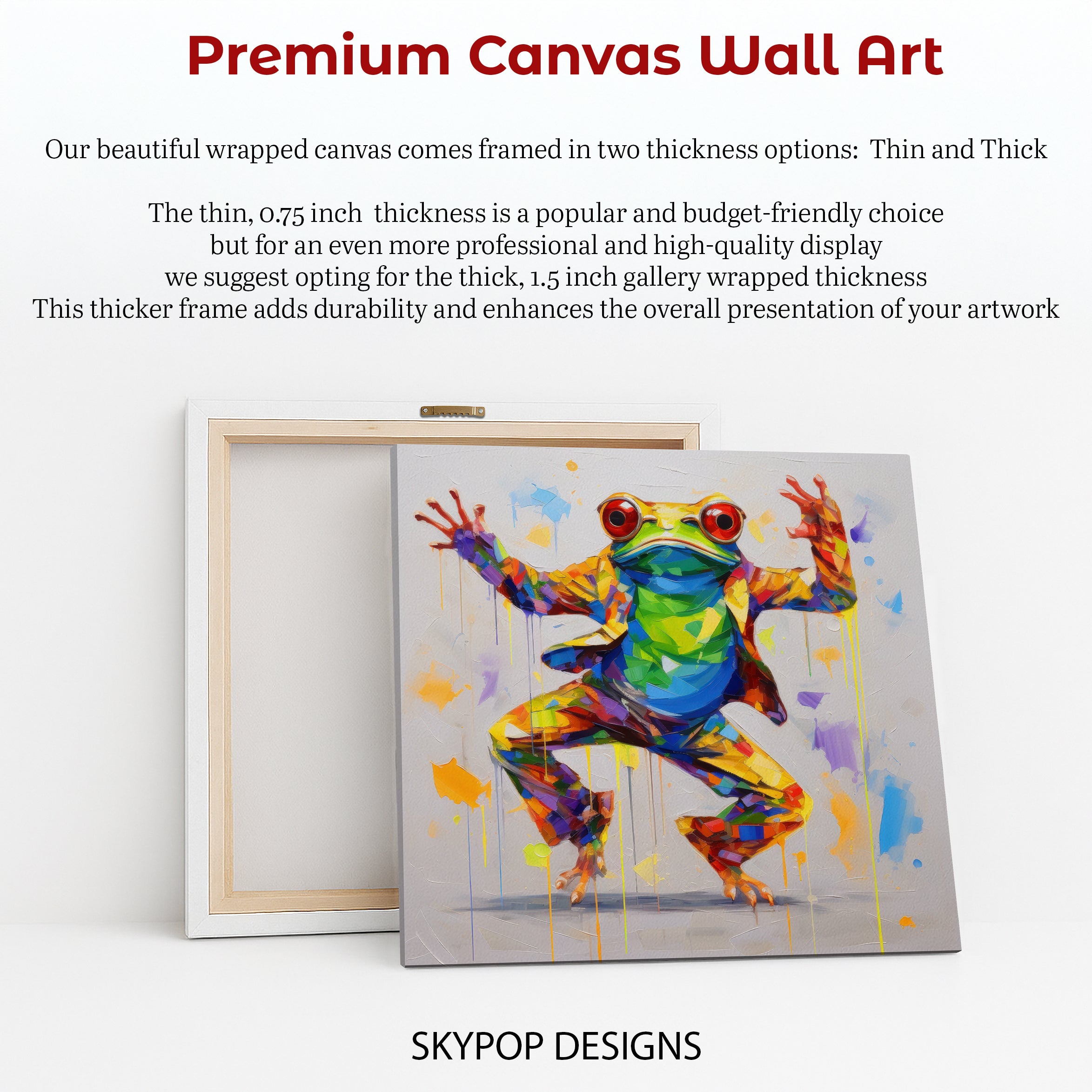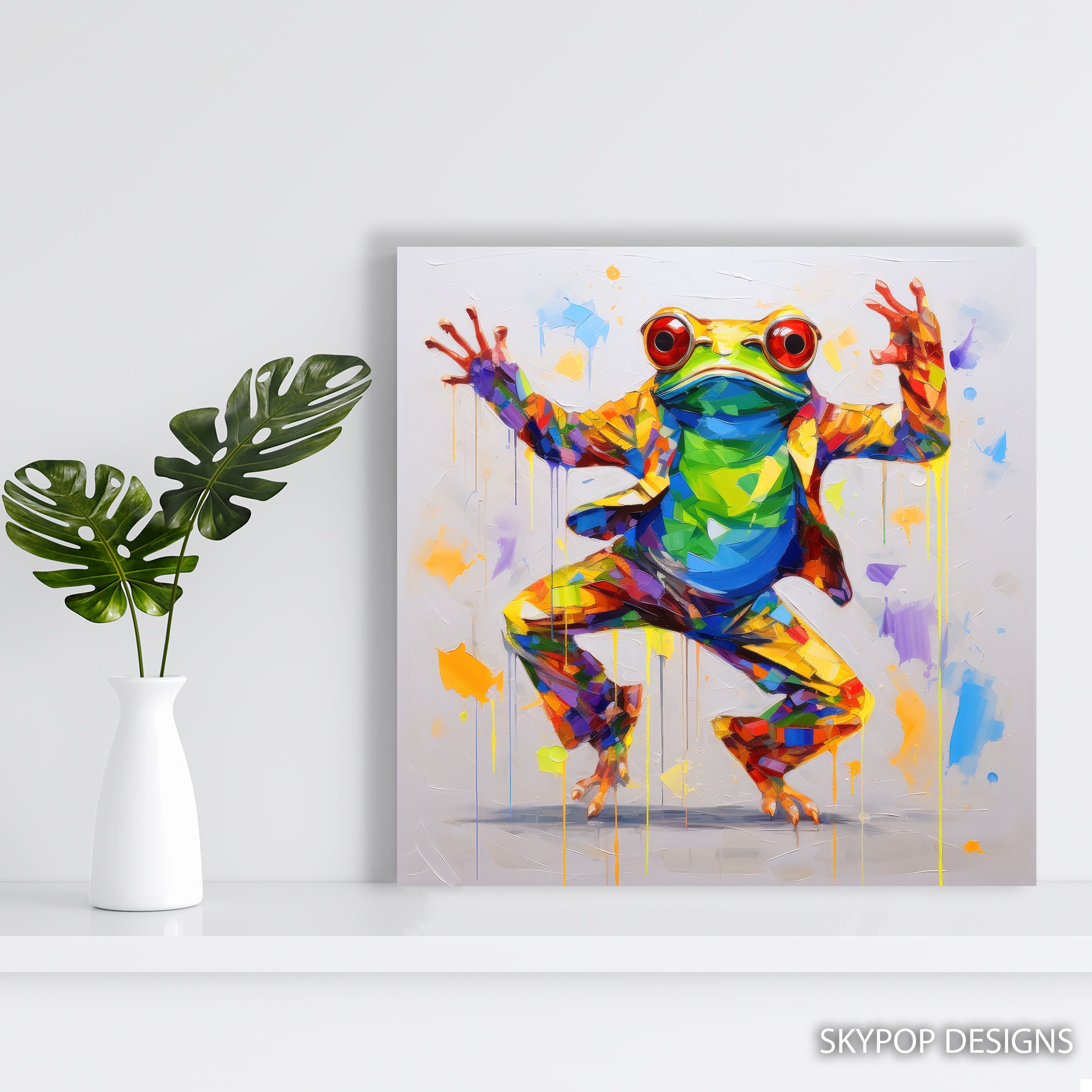Keywords: Frog wall art, Dancing frog art, Multicolor canvas art, Yellow art, Blue art, Red art, Contemporary art, Modern decor, Whimsical art, Pop art poster, Living room art, Bedroom art, Office decor, Game room art, Animal wall art, Frog painting, Abstract art, Colorful art, Statement art, Unique home decor, Wall art print, Vibrant art, Festive decor, Fun art, Birthday gift art, Housewarming gift, Holiday gift, Animal theme art, Playful art, Art for him