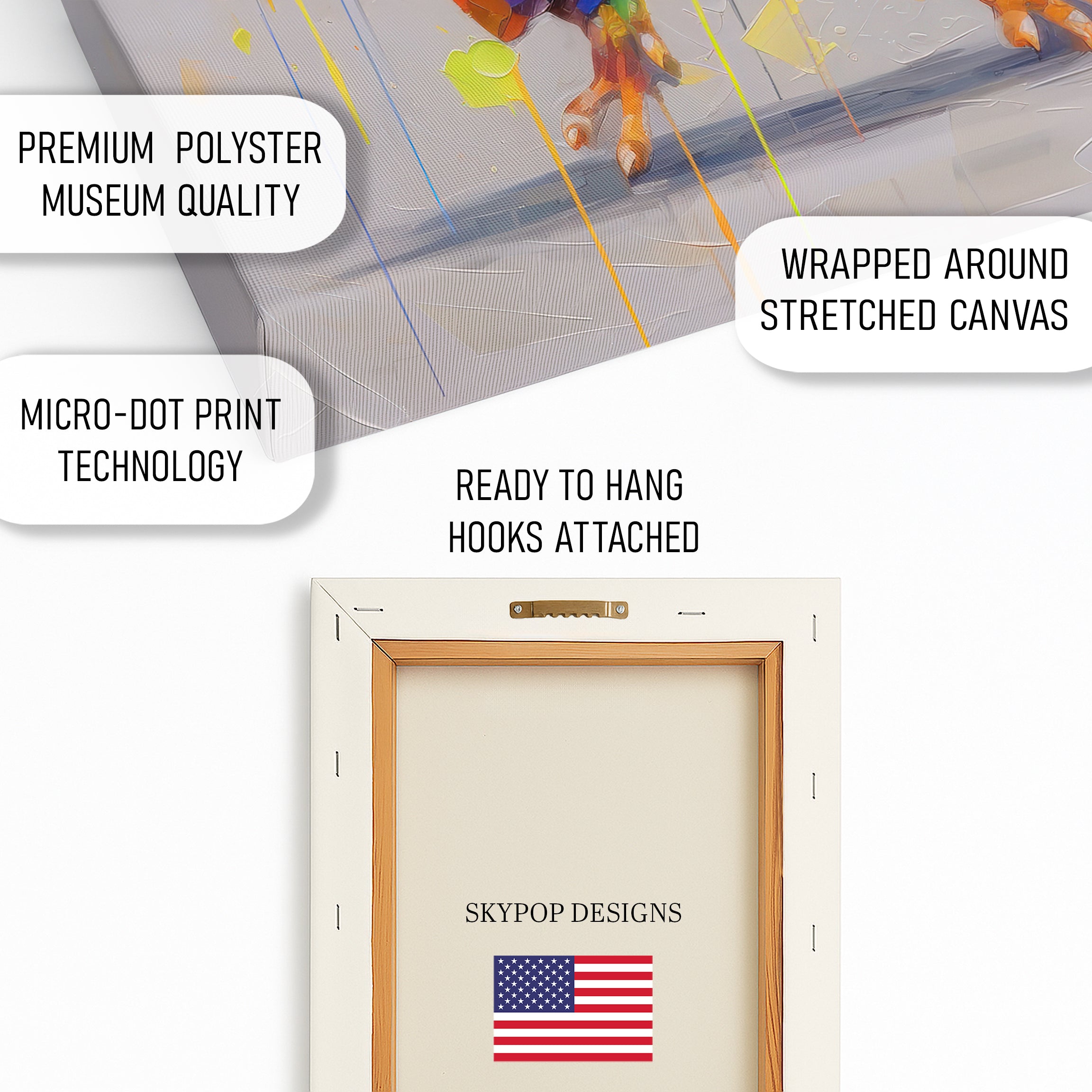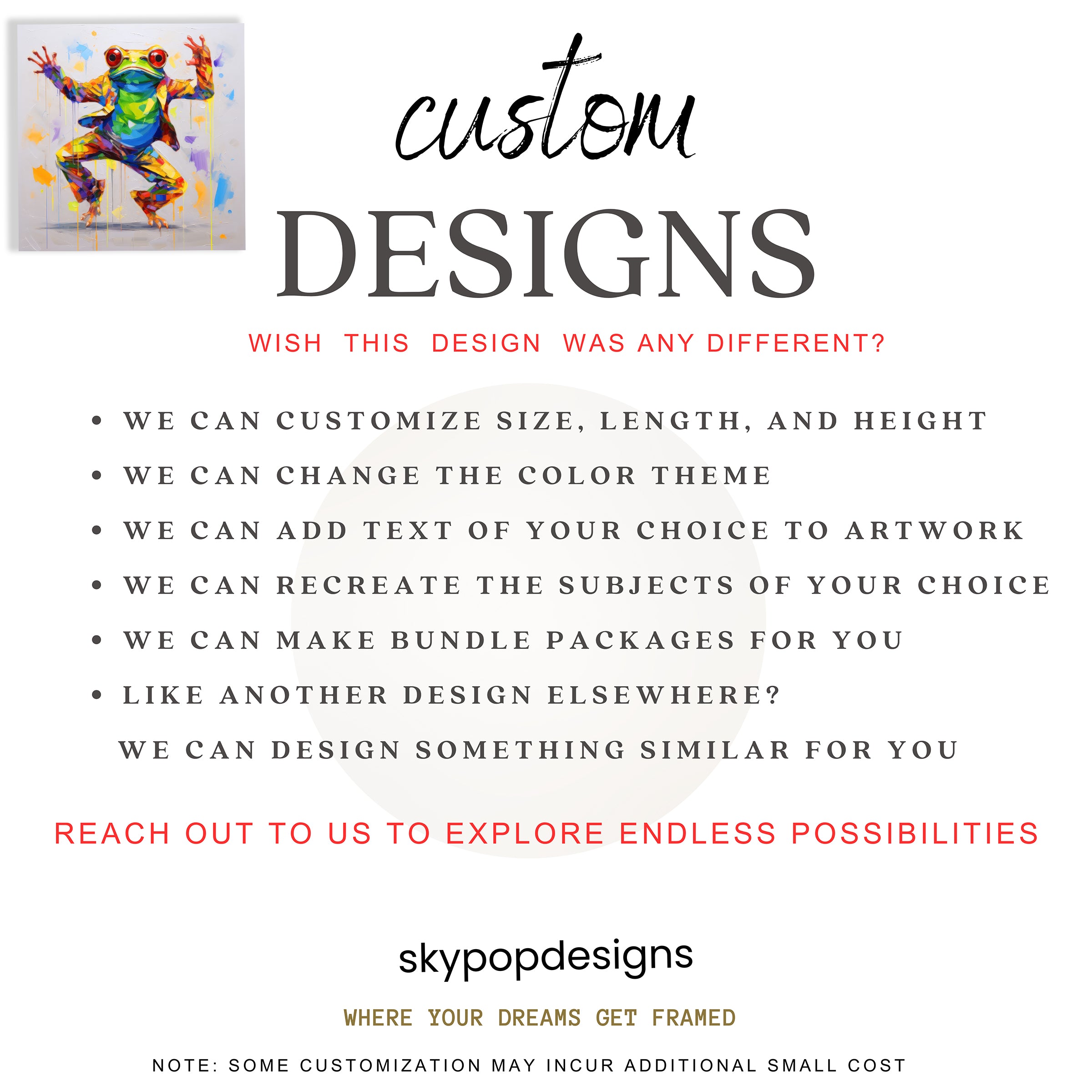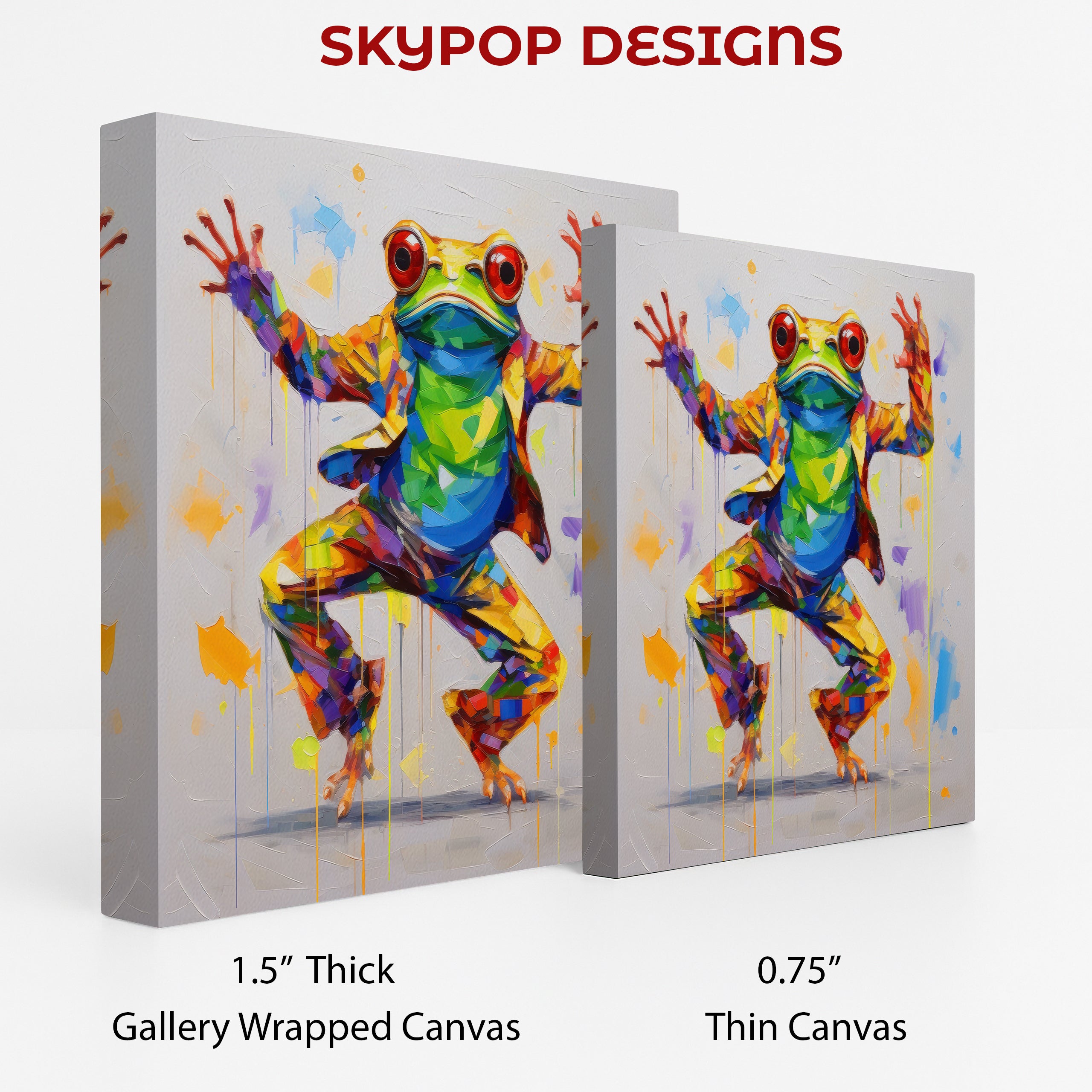 Keywords: Frog wall art, Dancing frog art, Multicolor canvas art, Yellow art, Blue art, Red art, Contemporary art, Modern decor, Whimsical art, Pop art poster, Living room art, Bedroom art, Office decor, Game room art, Animal wall art, Frog painting, Abstract art, Colorful art, Statement art, Unique home decor, Wall art print, Vibrant art, Festive decor, Fun art, Birthday gift art, Housewarming gift, Holiday gift, Animal theme art, Playful art, Art for him