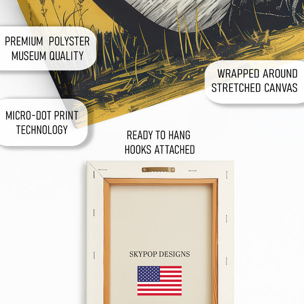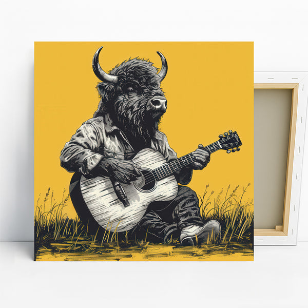 Transform your space with this unique Bison playing guitar canvas wall art, a striking piece of pop art that brings a whimsical touch to any room. This captivating poster showcases a Bison in a rustic setting, strumming an acoustic guitar, presented in a bold graphic style with a vibrant yellow background. The striking contrast of black and white against the vivid yellow creates an eye-catching statement, perfect for modern or bohemian decor. Elevate your living room, bedroom, or office with this high-quality canvas wall art that radiates personality and artistic flair. It's an ideal gift for music lovers, nature enthusiasts, or anyone looking to add a touch of quirky charm to their home. This versatile piece of wall decor works beautifully in any space, adding a vibrant and memorable focal point. Experience the blend of animal art and graphic design that this stunning poster offers. Make a statement with this conversation-starting canvas print that celebrates individuality and creativity. This Bison wall art is more than just decor; it's a mood enhancer, bringing a playful and artistic vibe to your home. Add this distinctive poster to your collection and instantly elevate your interior design. This canvas wall art is perfect for creating a focal point in a contemporary living room or adding a touch of personality to a rustic-themed bedroom. Transform your house into a home with this stunning piece of graphic art.