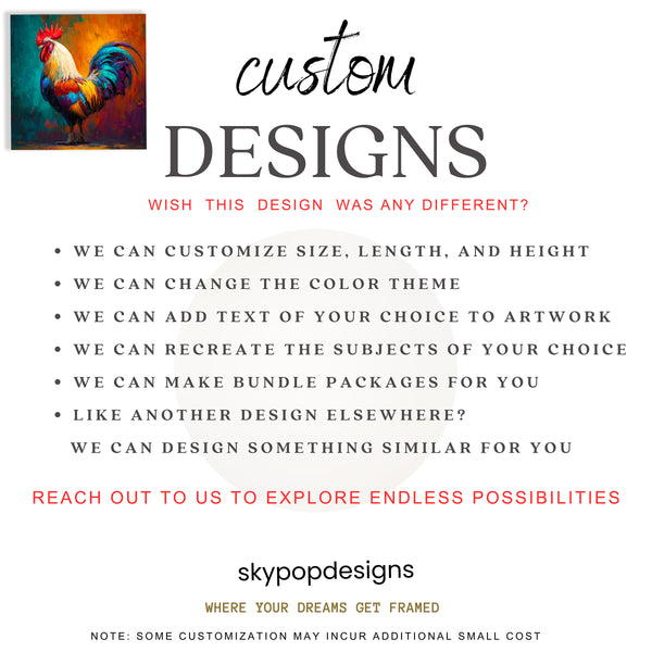 Keywords: Rooster Canvas Art, Abstract Wall Art, Animal Art Print, Pop Art Decor, Bohemian Style, Contemporary Art, Modern Home Decor, Living Room Art, Kitchen Wall Art, Dining Room Decor, Entryway Art, Multicolor Art, Orange Teal Art, Yellow Accents, Vibrant Rooster, Statement Piece Art, Bold Rooster Print, Farm Animal Art, Rural Charm Art, Colorful Canvas, Home Decoration, Wall Poster Art, Housewarming Gift, Birthday Gift Idea, Unique Wall Art, High-Quality Canvas, Art for Walls, Interior Design Art, Personality Decor, Joyful Artwork