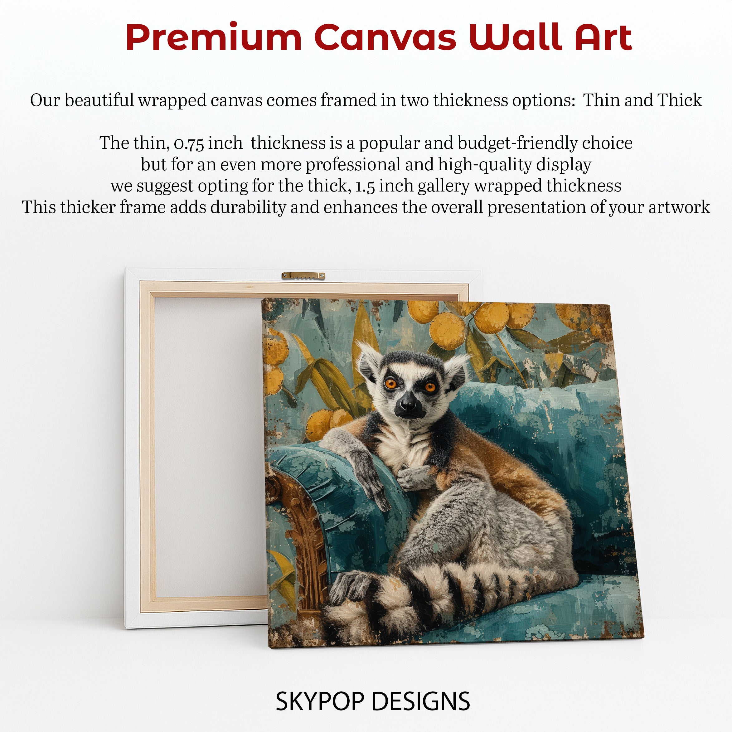 Bring a touch of the exotic into your home with this captivating lemur canvas wall art. This striking piece of animal art features a uniquely rendered lemur lounging on a teal sofa, surrounded by abstract floral elements in gold and earth tones. The vibrant multicolor palette and contemporary artistic style make this poster a standout addition to any living room or bedroom decor. Its bohemian and rustic influences blend seamlessly, creating a warm and inviting atmosphere perfect for your office or entryway. This captivating canvas wall art transforms your space, adding a bold statement that sparks conversation. The rich blues and warm golds of the artwork create a sophisticated yet playful mood, enhancing the visual appeal of your interior design. Ideal for nature lovers and art collectors alike, this versatile piece functions beautifully as both a poster and a premium canvas wall art. Elevate your home with this unique blend of animal and abstract art, a perfect gift for housewarmings or birthdays that celebrates bold design and natural beauty. The intriguing texture and impressionistic style of this canvas art showcase the lemur's captivating gaze and posture, making it a memorable focal point. Transform your space and add character to your walls with this exceptional lemur artwork today.