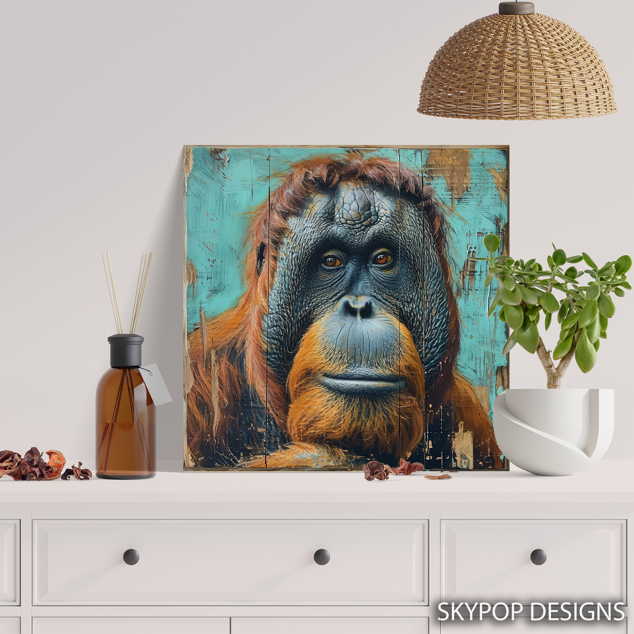 Keywords: Orangutan Wall Art, Canvas Print, Animal Art, Nature Art, Contemporary Art, Modern Decor, Rustic Decor, Living Room Art, Bedroom Decor, Office Wall Art, Entryway Decor, Brown Teal Art, Multicolor Wall Art, Orangutan Portrait, Wildlife Art, Home Decor, Statement Piece, Fine Art Print, Wall Decor, Textured Art, Soulful Gaze, Nature Lover Gift, Wildlife Enthusiast, Artistic Decor, Indoor Jungle, Bold Artwork, Eye-Catching Art, Unique Wall Art, Modern Animal Art, Canvas Wall Art